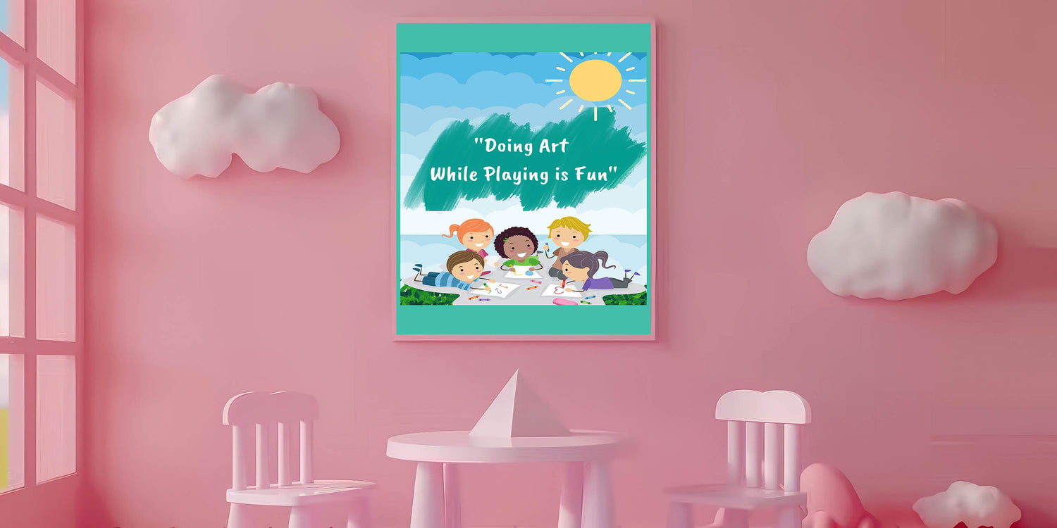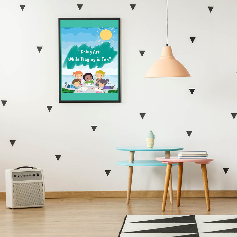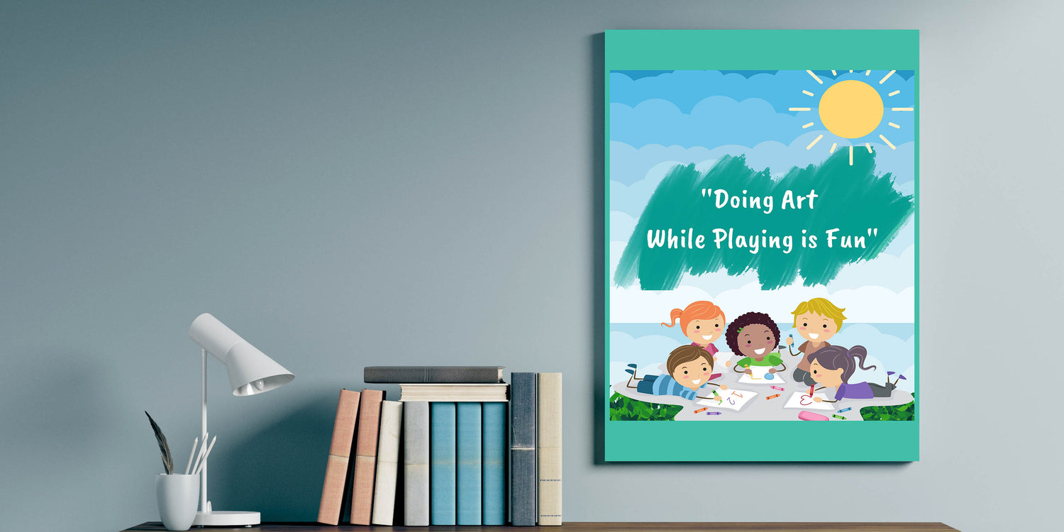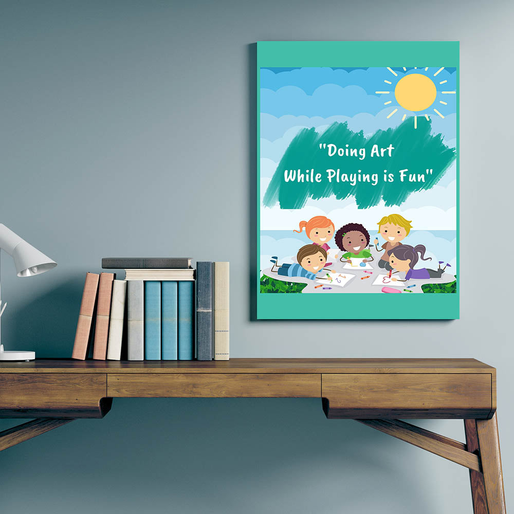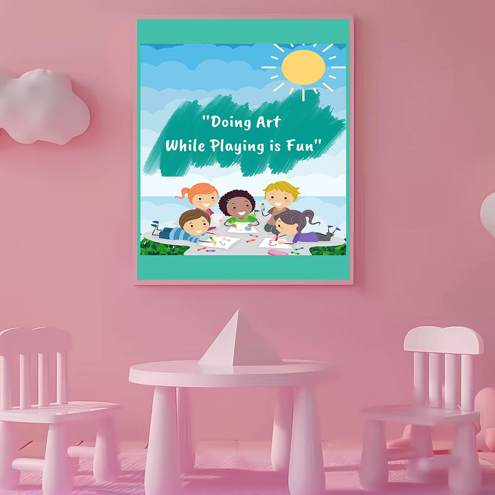 Encourage creativity and fun with this Kids Educational Wall Art featuring the inspiring message, "Doing Art While Playing is Fun." This colorful artwork showcases happy children painting and drawing outdoors, making it an excellent addition to classrooms, kids' playrooms, and homeschool spaces.