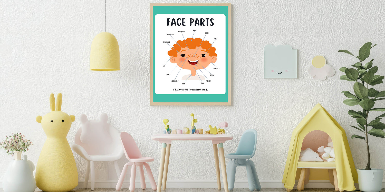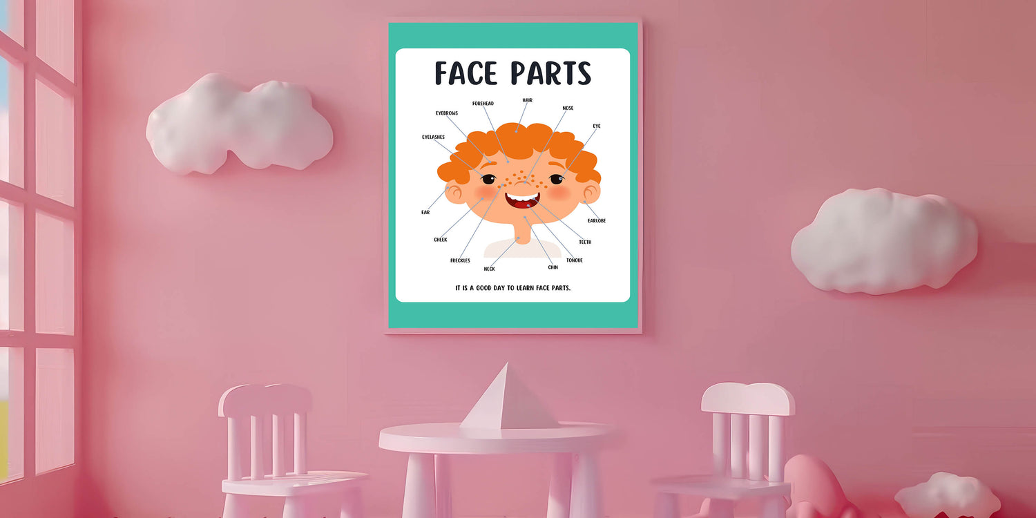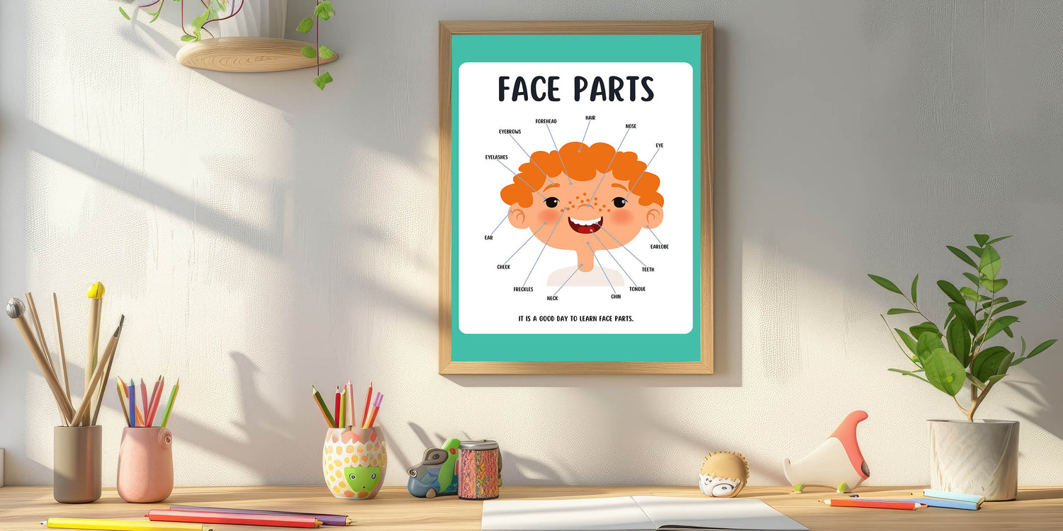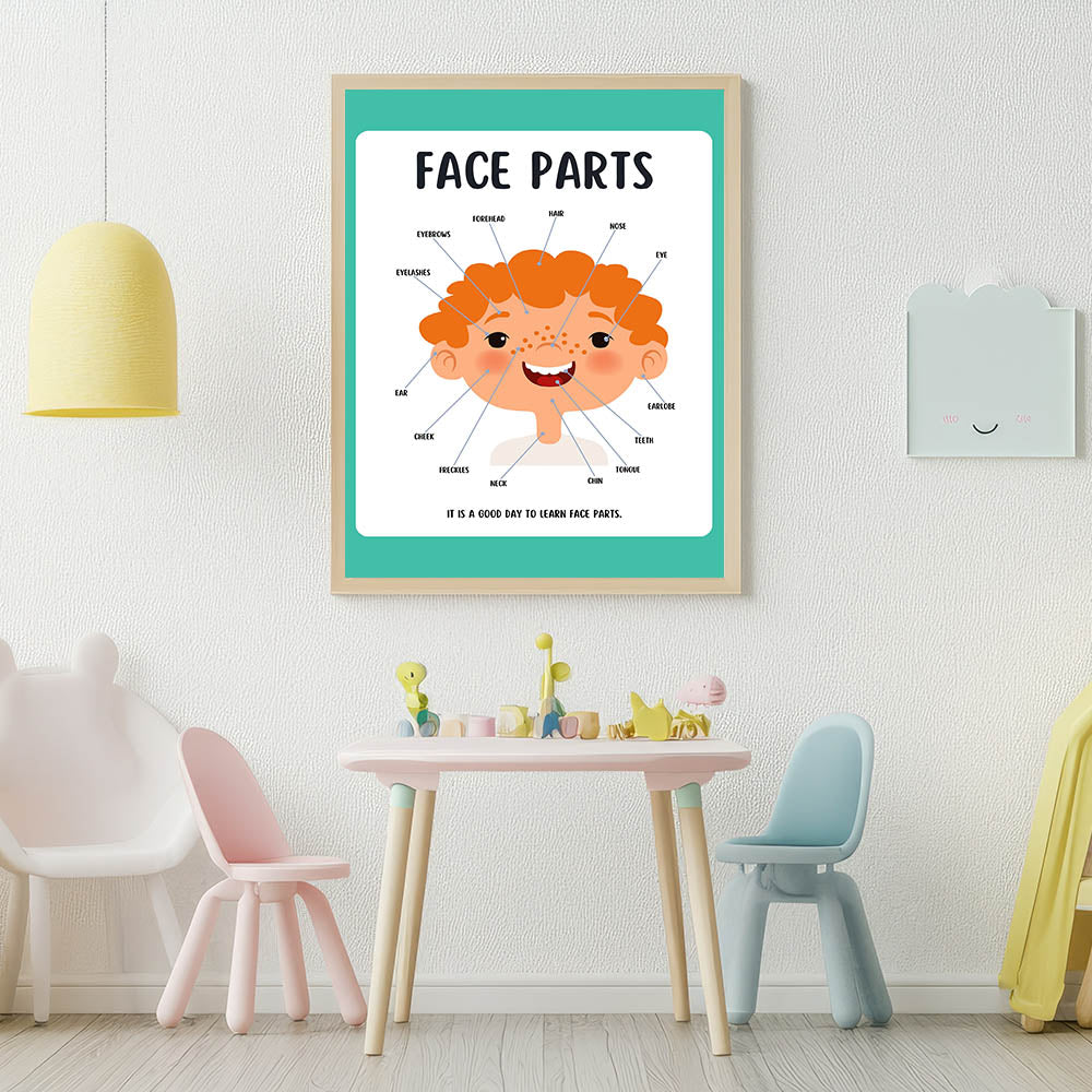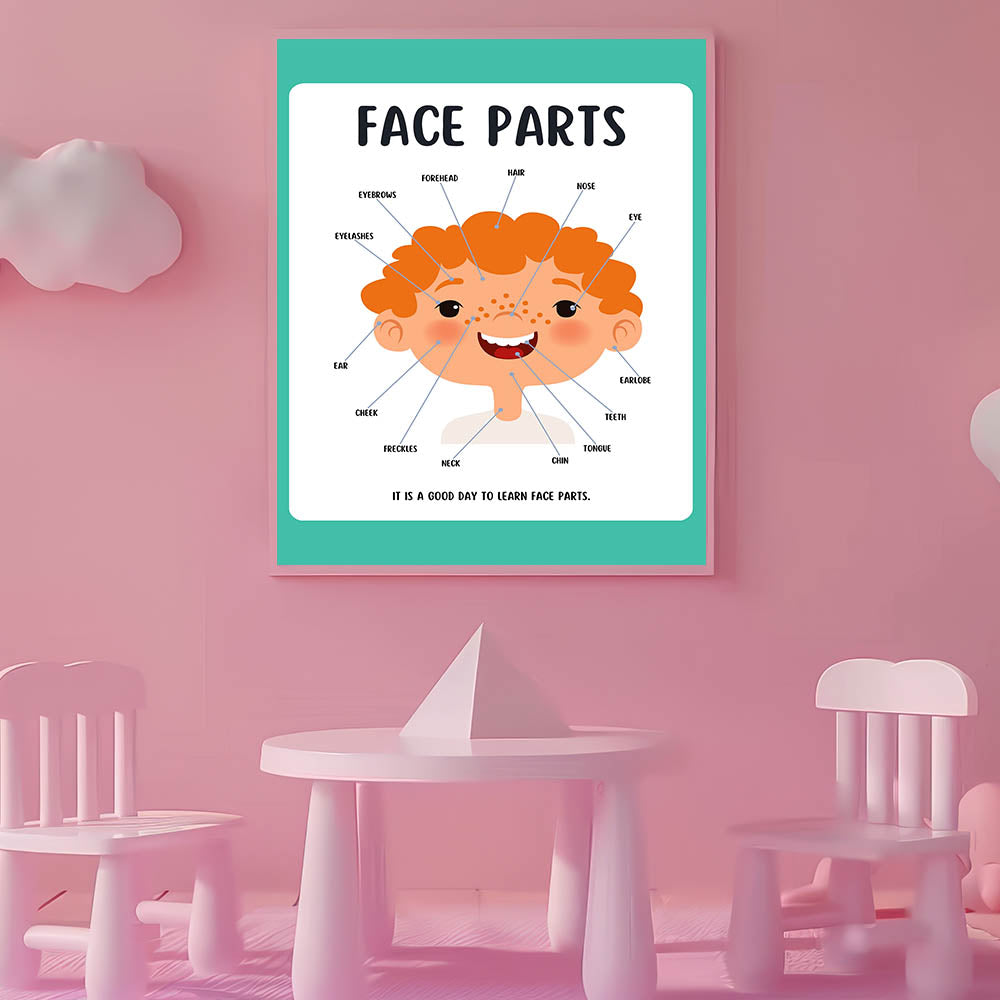 Make learning about the human body fun with this Kids Educational Wall Art, featuring a Face Parts Learning Chart. This Children’s Learning Art Print helps kids identify key facial features such as the eyes, eyebrows, nose, mouth, ears, cheeks, teeth, and more in a simple and engaging format. Designed for early learners, this Educational Nursery Wall Decor is ideal for classrooms, nurseries, and kids' study areas.