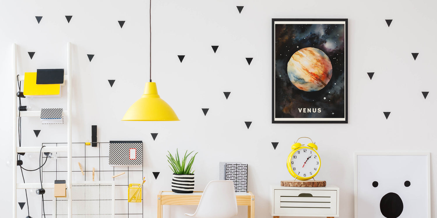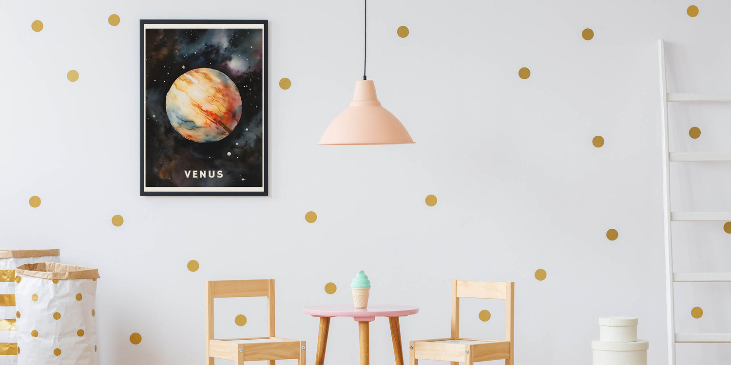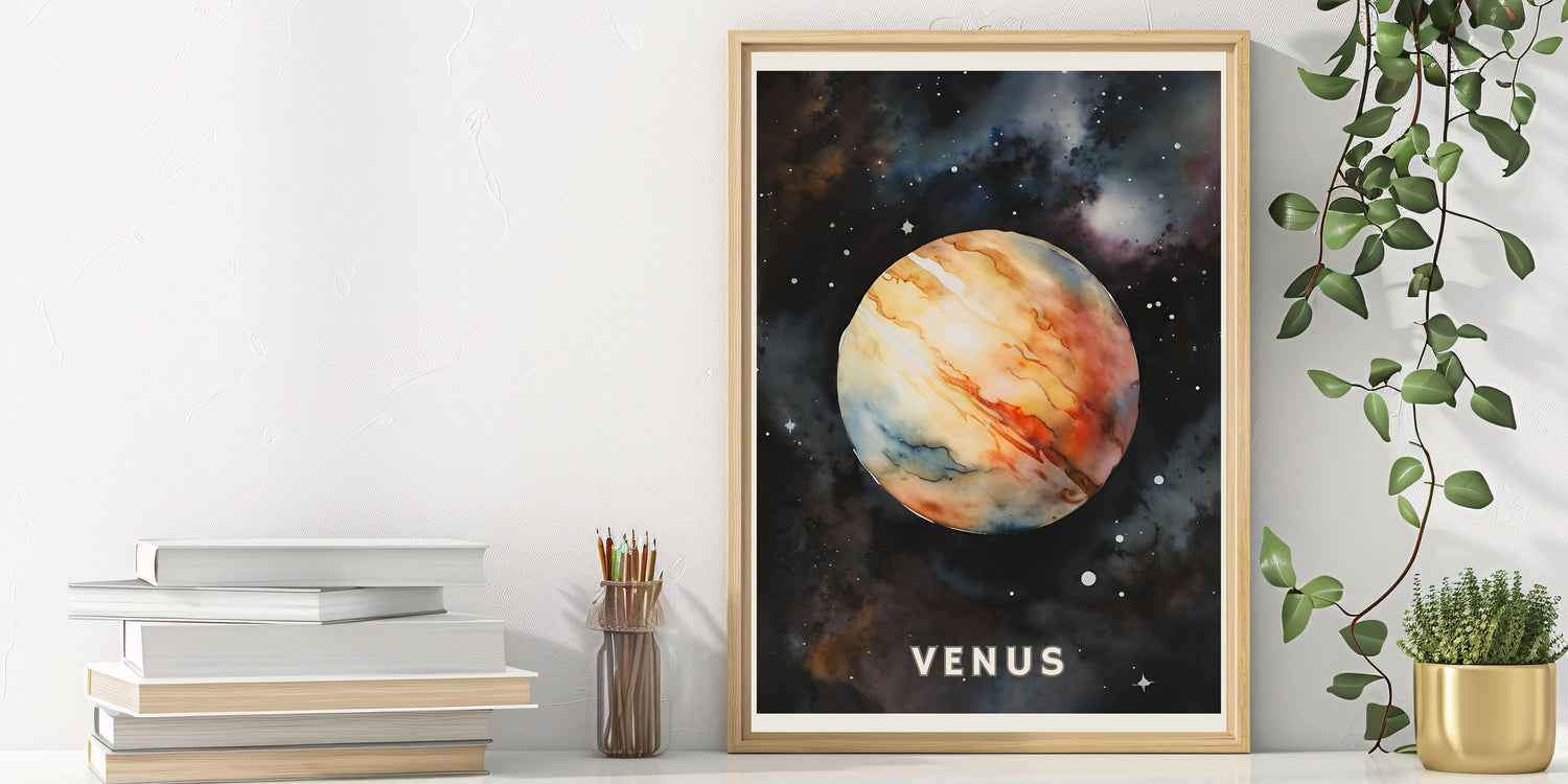 Inspire a love for astronomy with this Kids' Room Educational Decor, featuring a breathtaking watercolor-style illustration of Venus. This Children’s Learning Art Print makes space exploration fun and engaging, making it an ideal addition to classrooms, nurseries, and playrooms.