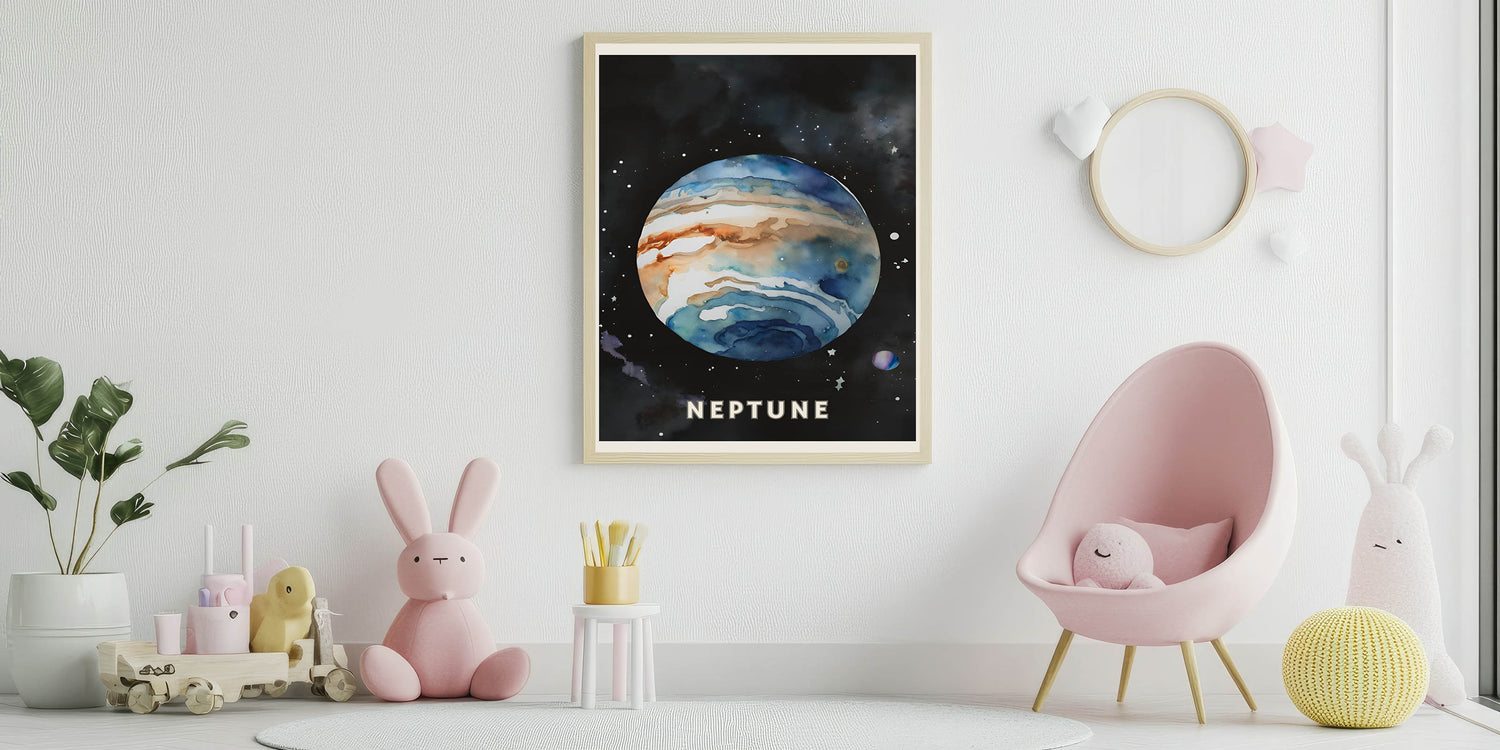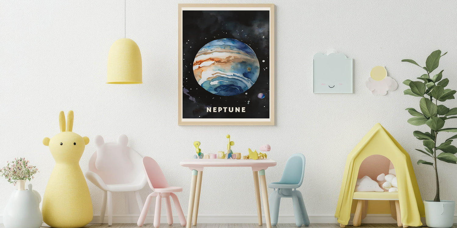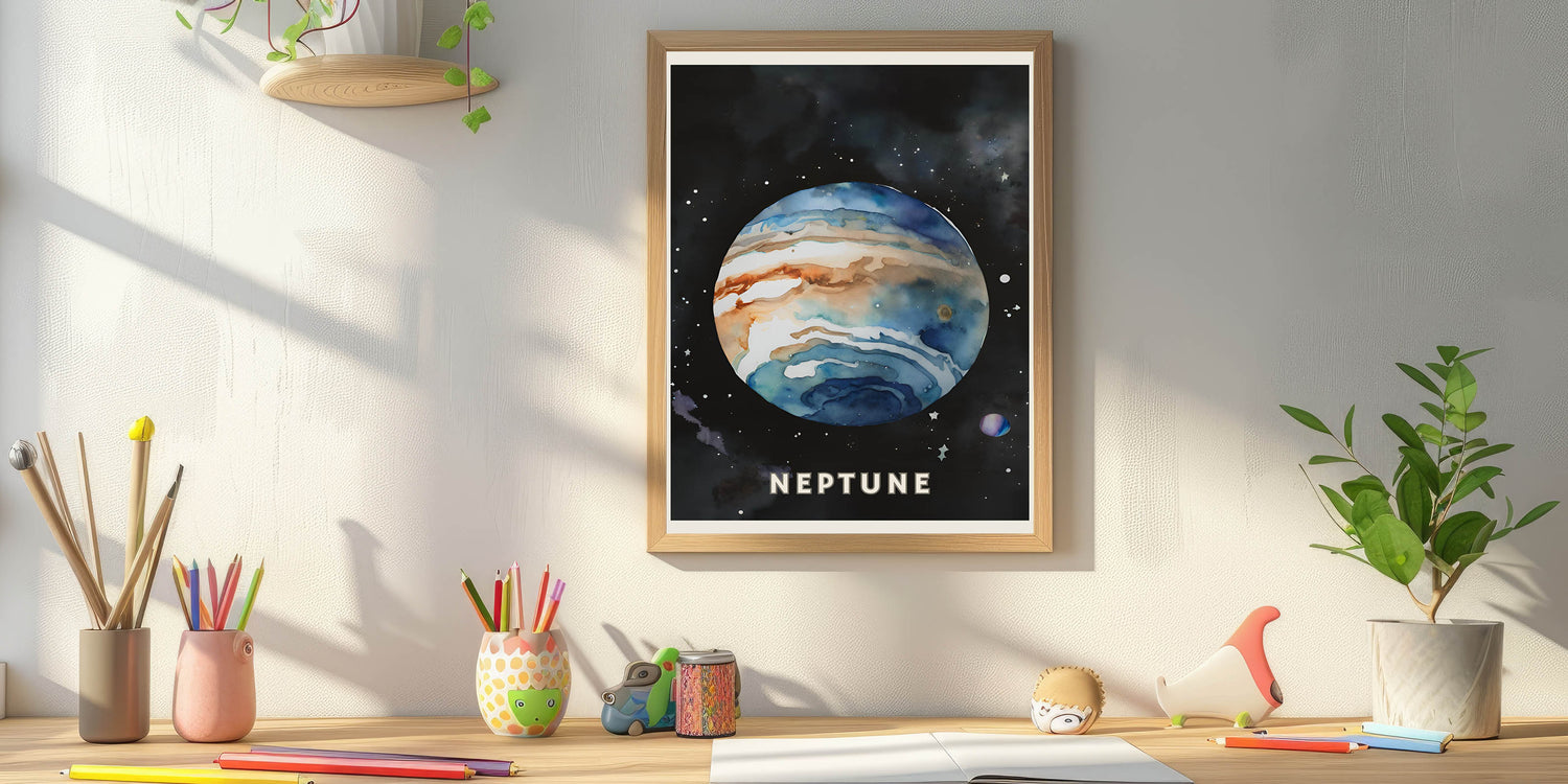 Bring the beauty of the cosmos into your child's learning space with this Numbers and Shapes Wall Art, featuring a stunning watercolor-style depiction of Neptune. This Children’s Learning Art Print makes space exploration fun and engaging, perfect for classrooms, nurseries, and kids' rooms.