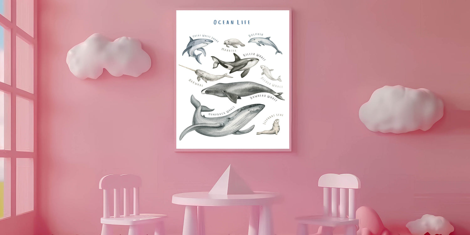 This educational art for kids' rooms provides a visual and interactive way to learn about ocean creatures and their habitats. The classroom learning poster is a great addition to preschools, homeschooling setups, and daycare centers, turning any space into a fun educational environment.