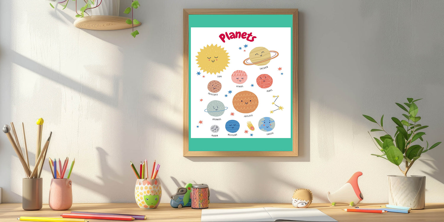 Perfect for nurseries, classrooms, and playrooms, this Children’s Learning Art Print helps kids recognize the planets while sparking curiosity about the universe. Whether for homeschooling or classroom use, this Educational Nursery Wall Decor is a fantastic tool for introducing early astronomy concepts.