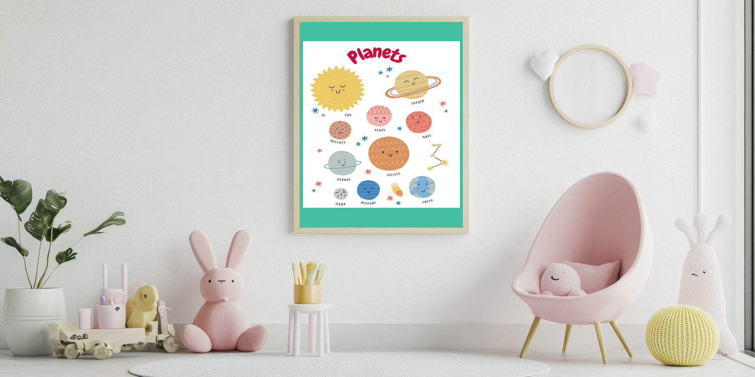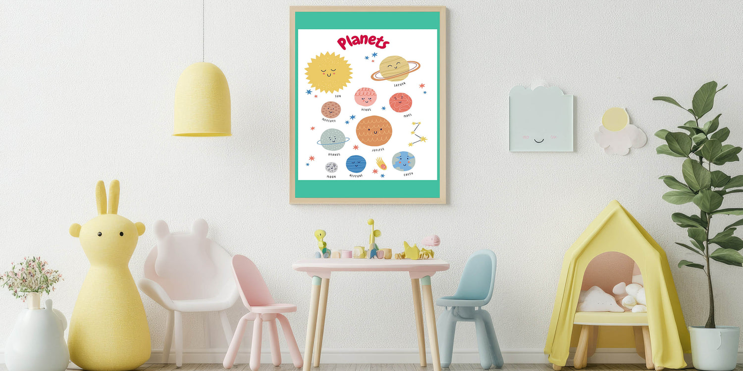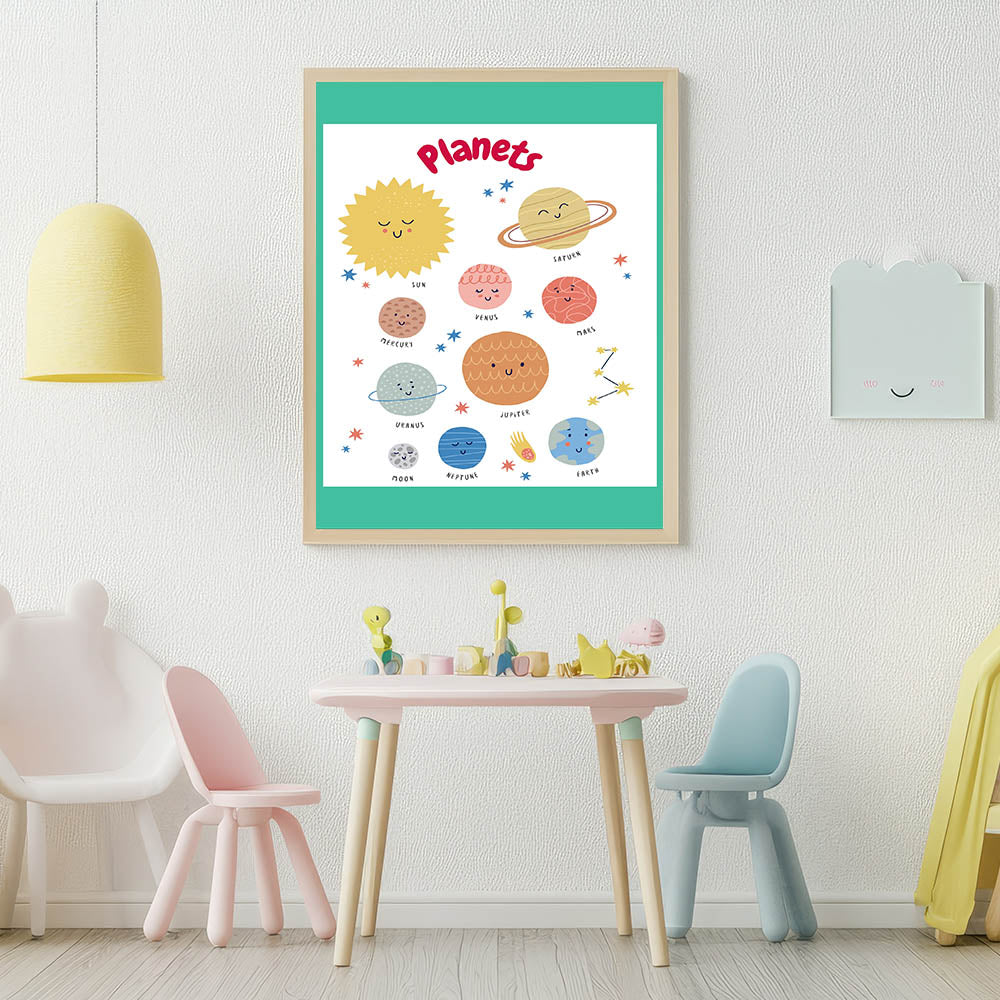 Introduce your child to the wonders of space with this Planets Learning Wall Art. This Kids Educational Wall Art features a playful and engaging illustration of the planets in our solar system, including the Sun, Mercury, Venus, Earth, Mars, and beyond. Each planet is designed with cute, friendly faces to make learning about space fun and accessible for young learners.