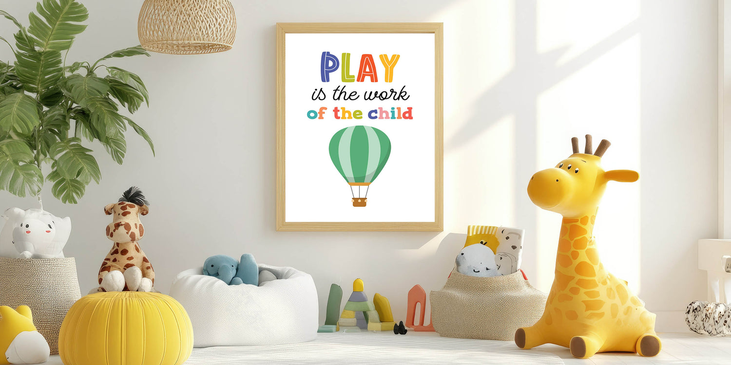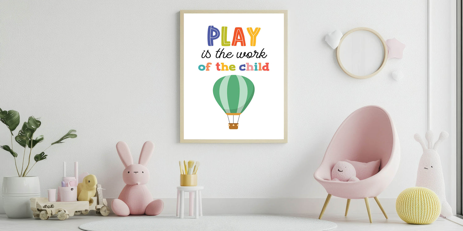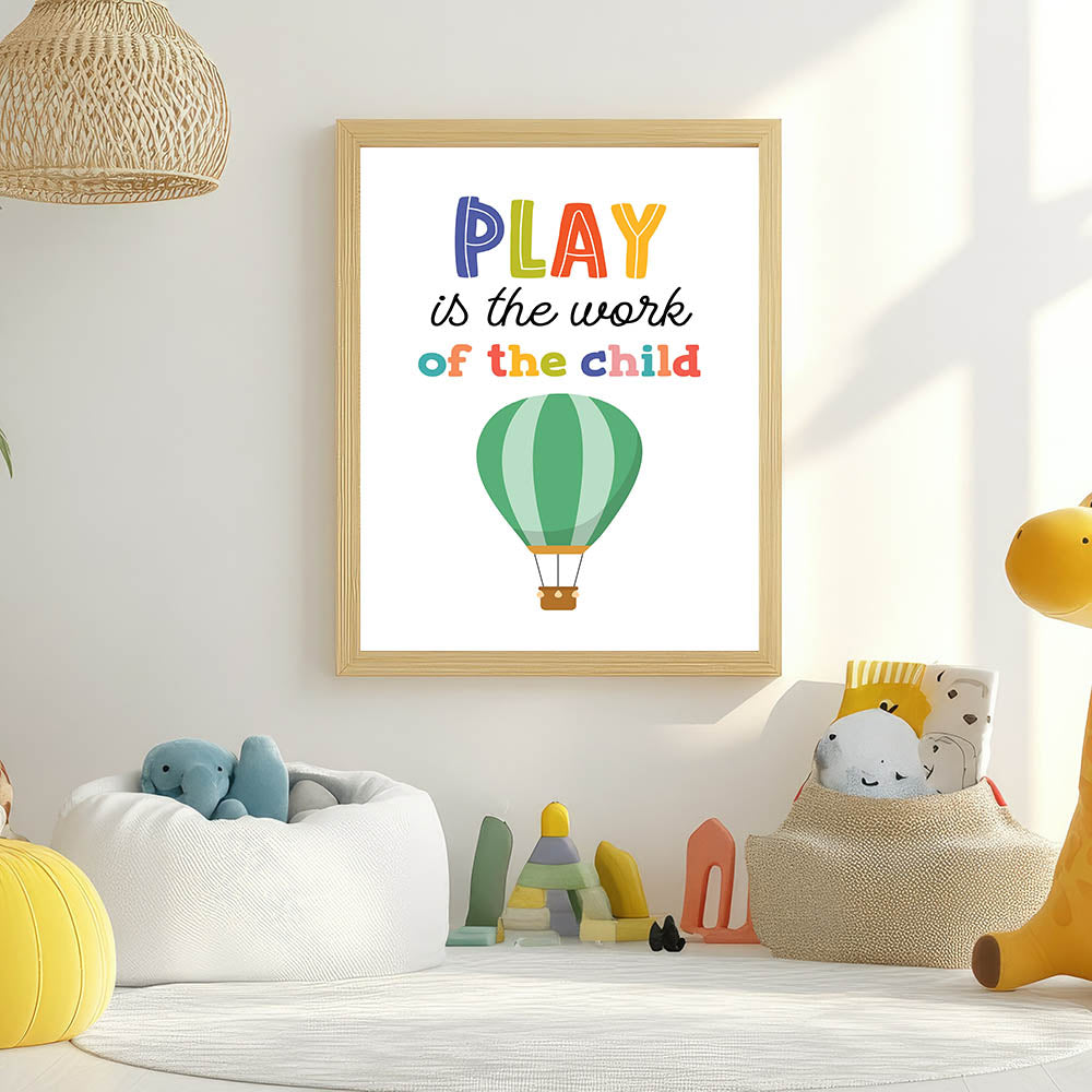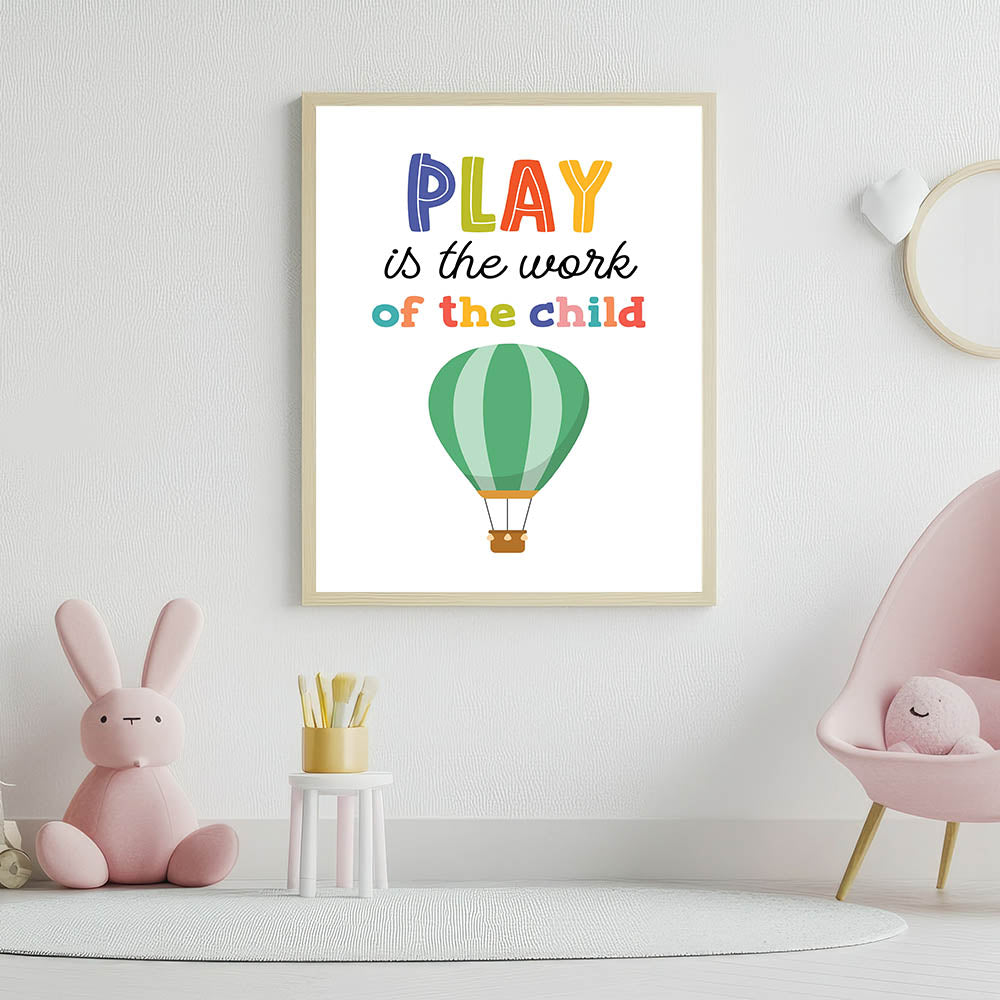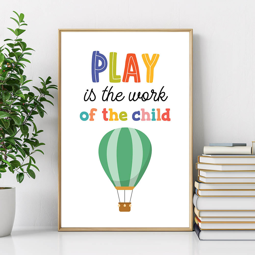 Inspire creativity and play-based learning with this Play is the Work of the Child Wall Art. Featuring a colorful and uplifting quote, this Kids Educational Wall Art celebrates the importance of play in childhood development. The charming hot air balloon illustration adds a whimsical touch, making it a perfect Children’s Learning Art Print for nurseries, playrooms, and classrooms.