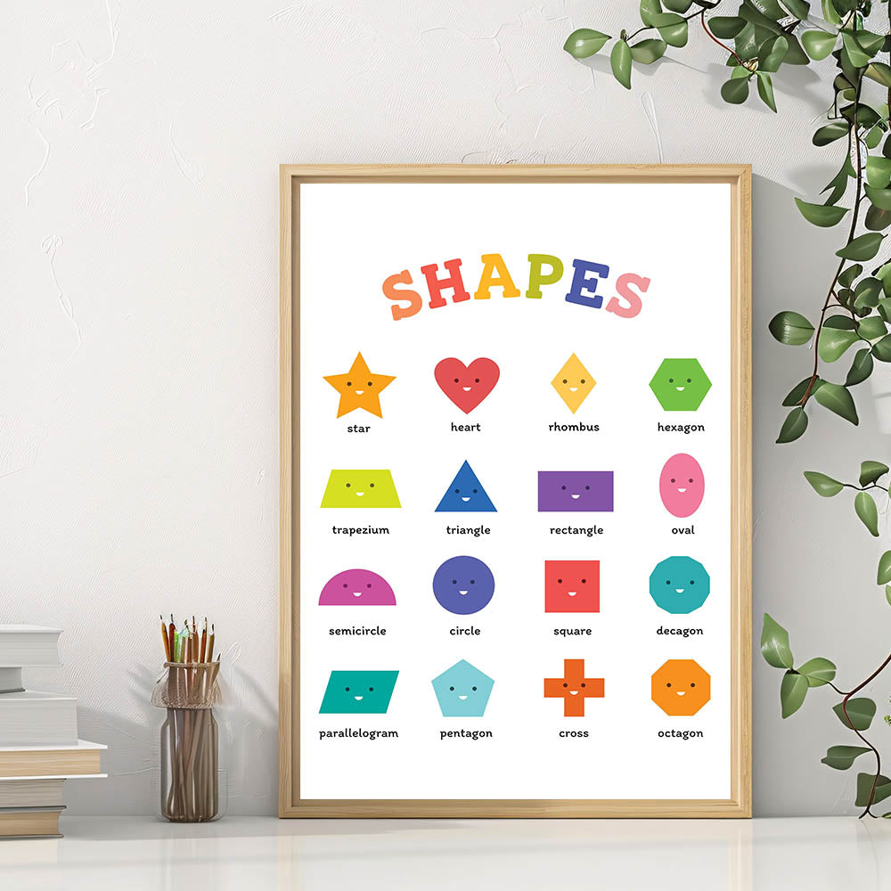 Help children learn basic geometric shapes with this Kids Educational Wall Art featuring a colorful and engaging design. This fun and interactive poster introduces kids to star, heart, rhombus, hexagon, trapezium, triangle, rectangle, oval, semicircle, circle, square, decagon, parallelogram, pentagon, cross, and octagon, making early learning both exciting and visually stimulating. Perfect for nurseries, playrooms, and classrooms, this educational nursery wall decor enhances shape recognition and spatial awareness.