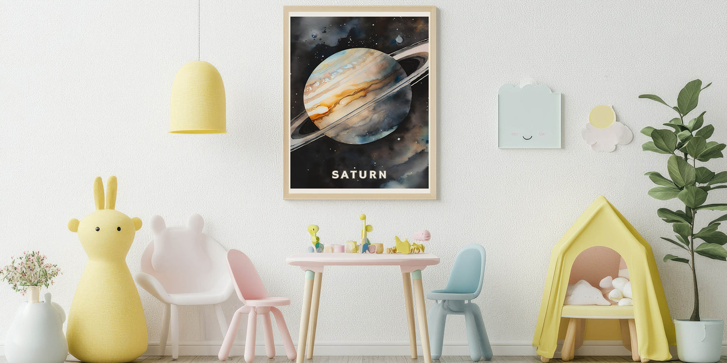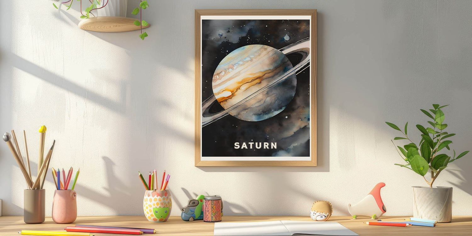 Introduce young minds to the wonders of space with this STEM Learning Wall Art, featuring a breathtaking watercolor-style depiction of Saturn. This Children’s Learning Art Print beautifully captures the ringed planet, making it a perfect addition to nurseries, classrooms, and kids' rooms.