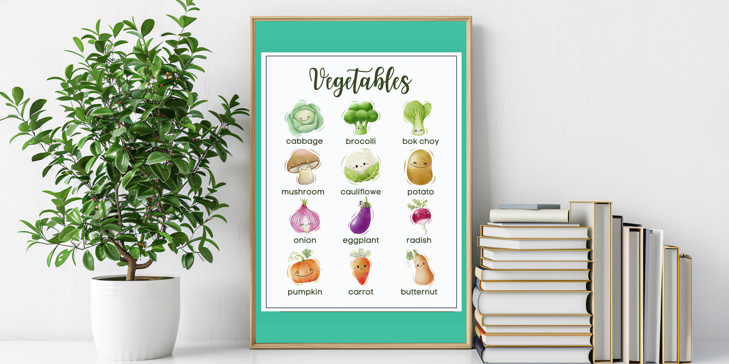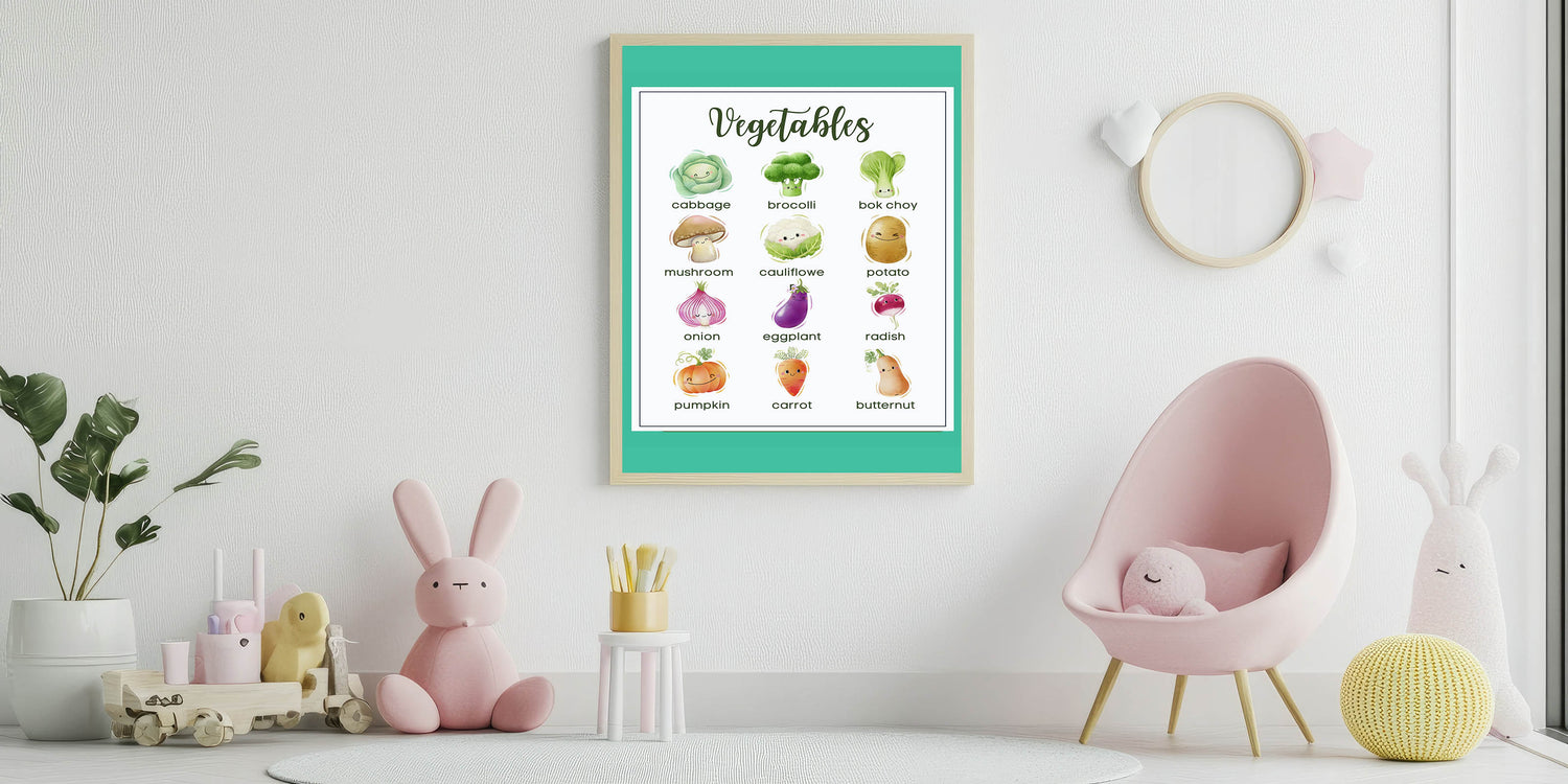 Teach kids about healthy eating with this Kids Educational Wall Art featuring a Vegetables Chart with cute and colorful illustrations. This Children's Learning Art Print introduces young learners to a variety of vegetables in a fun and engaging way. Ideal for nurseries, playrooms, and classrooms, this Educational Nursery Wall Decor encourages healthy eating habits while making learning enjoyable.