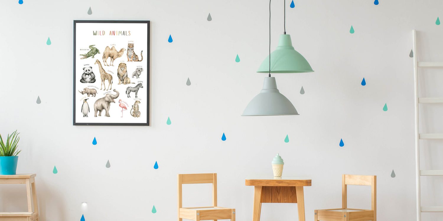 This educational art for kids' rooms provides a fun and interactive way to learn about different animal species and their habitats. The classroom learning poster is ideal for preschools, daycare centers, homeschooling spaces, and playrooms, turning any environment into a wildlife-inspired learning space.