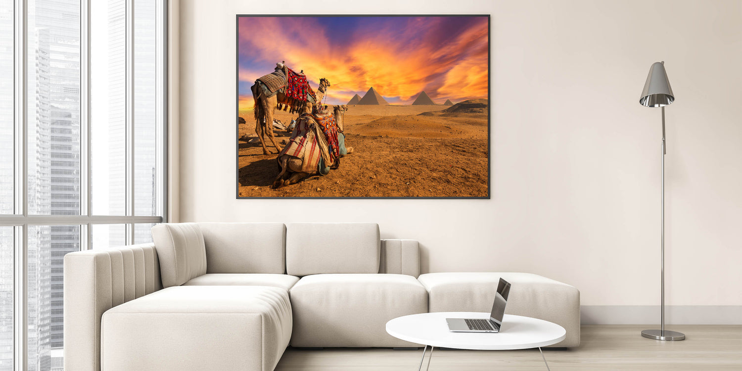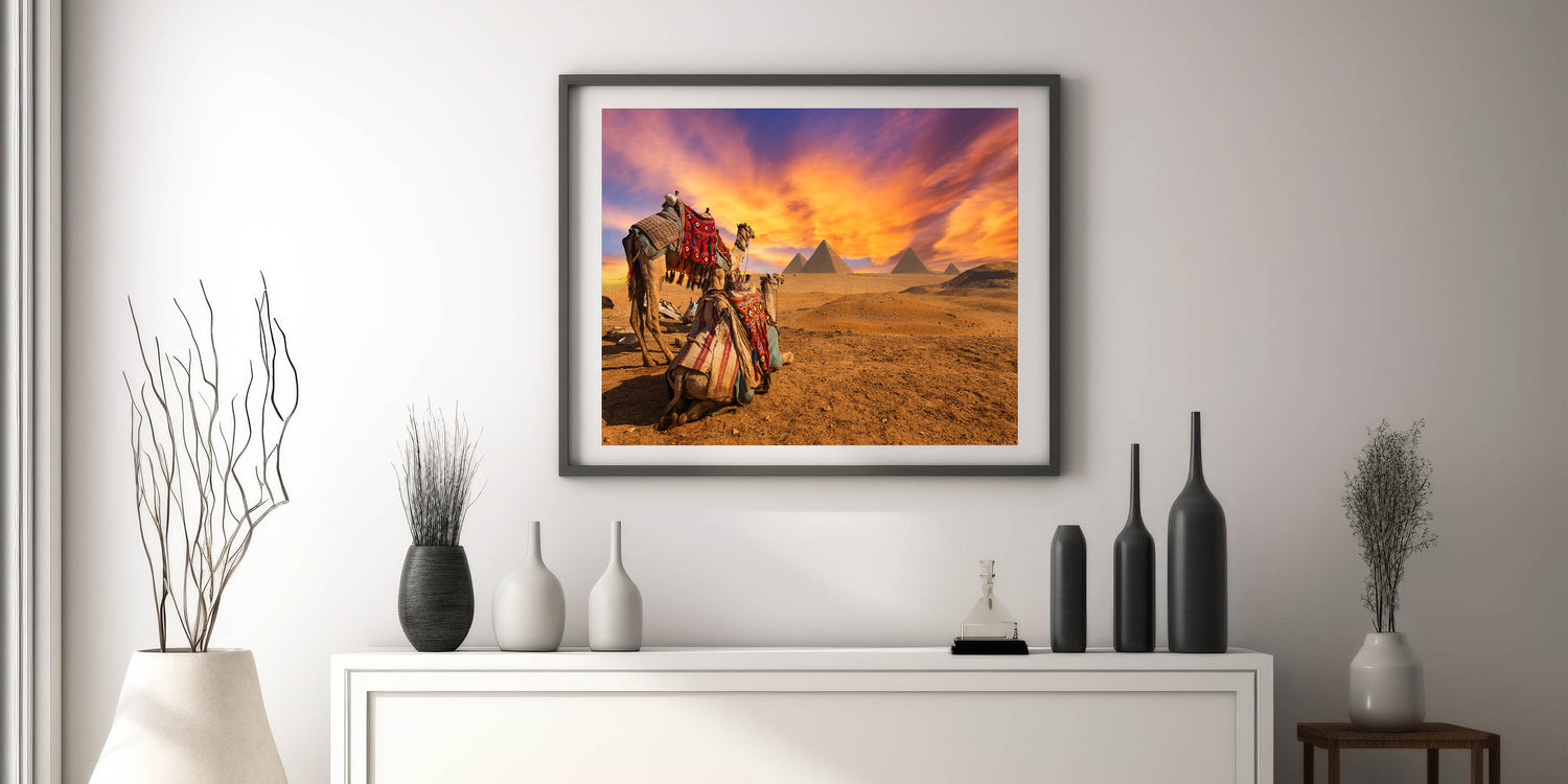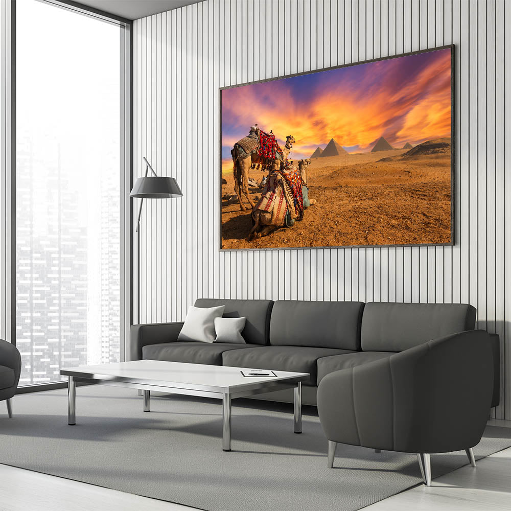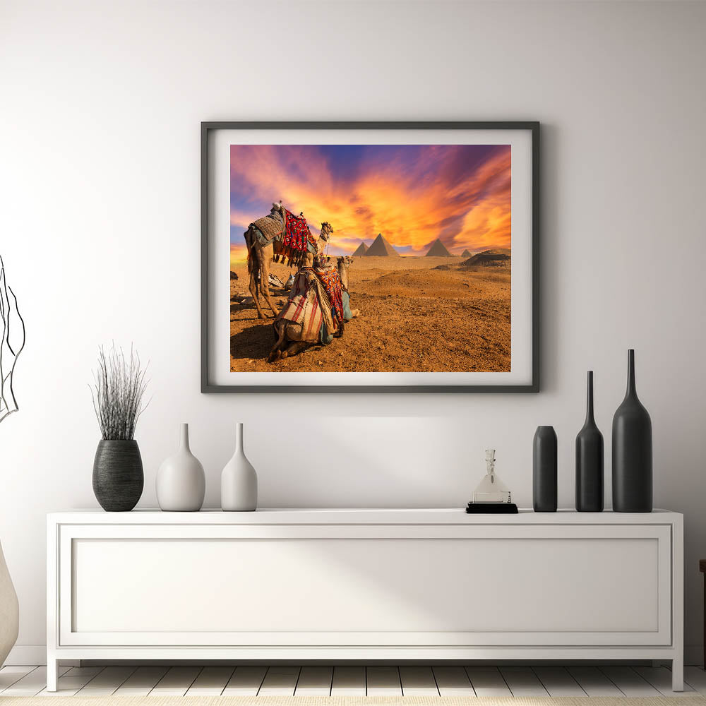 Add a touch of exotic beauty to your decor with this exquisite depiction of camels and pyramids under a fiery Egyptian sunset. Perfect for history enthusiasts and lovers of stunning landscapes.