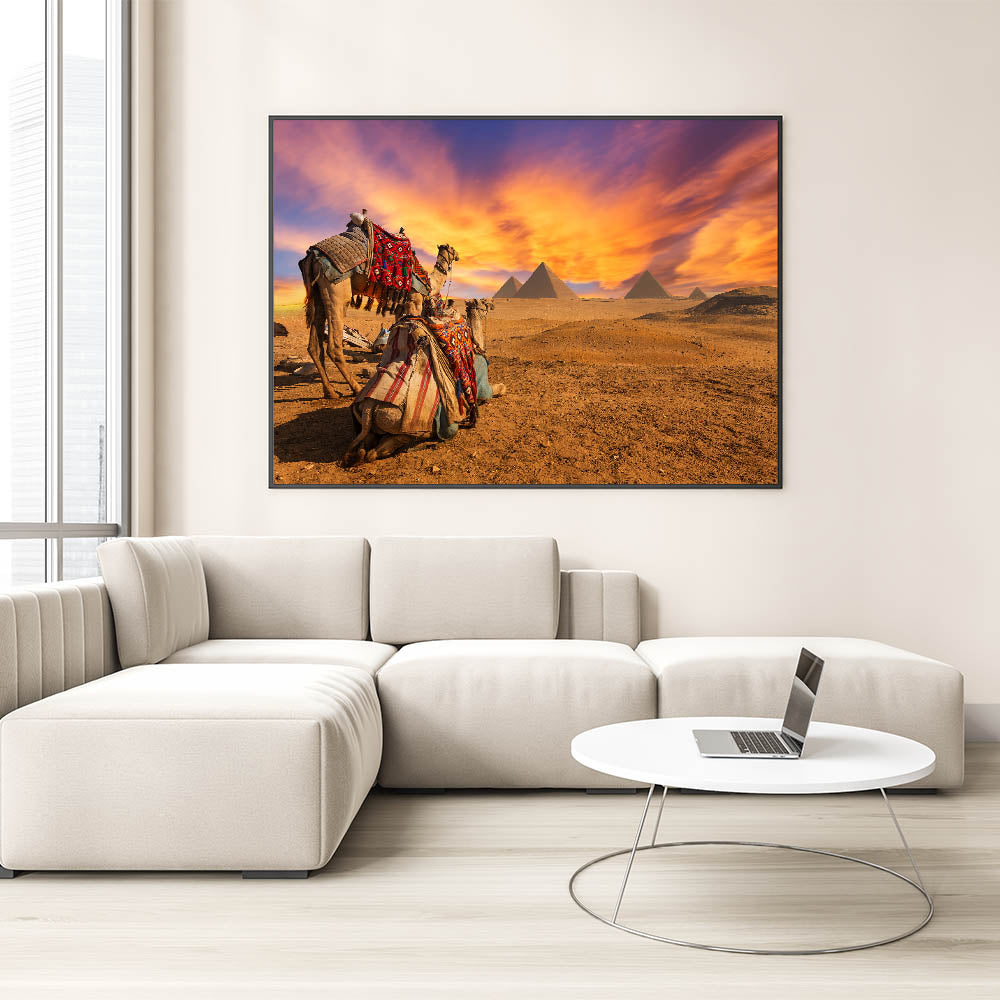 Immerse yourself in the vibrant hues of an Egyptian sunset with this stunning wall art, featuring camels resting in the desert with the majestic Pyramids of Giza in the background. The rich colors of the sky, combined with the intricate patterns on the camel saddles, evoke a sense of adventure and history, making this piece a perfect addition to any home or office.