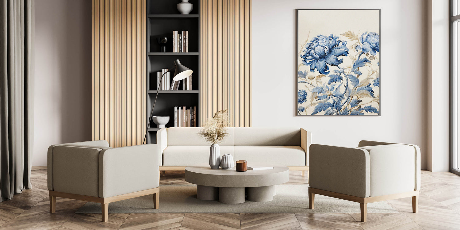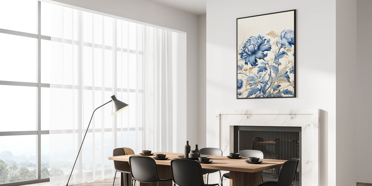 The blue botanical design offers a classic yet modern look, suitable for those who appreciate refined floral art. It brings a refreshing touch of nature to any setting, serving as a focal point or complementing existing decor with its sophisticated color palette.
