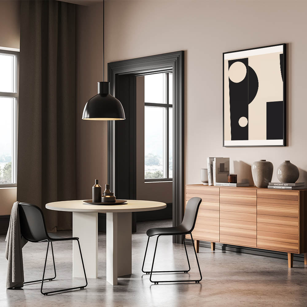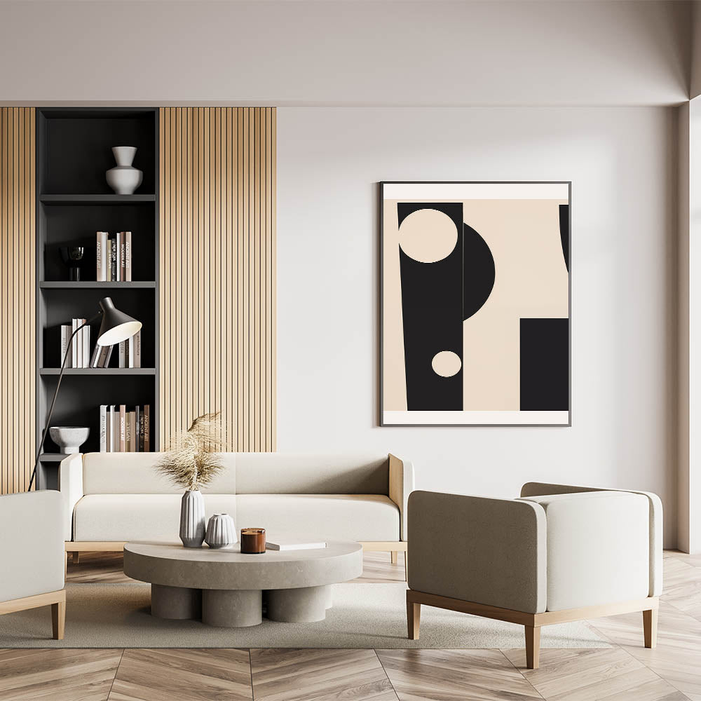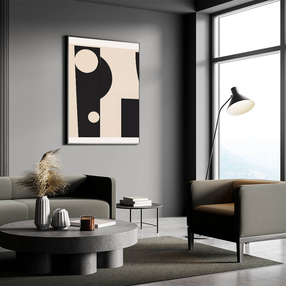 This electric wall art features bold geometric shapes in a dynamic black-and-beige design, making it a striking addition to any modern space. The abstract composition plays with contrasting forms and lines, creating a visually captivating piece that draws the eye. Perfect for those who appreciate contemporary decor, this artwork adds a touch of electric energy to any room.