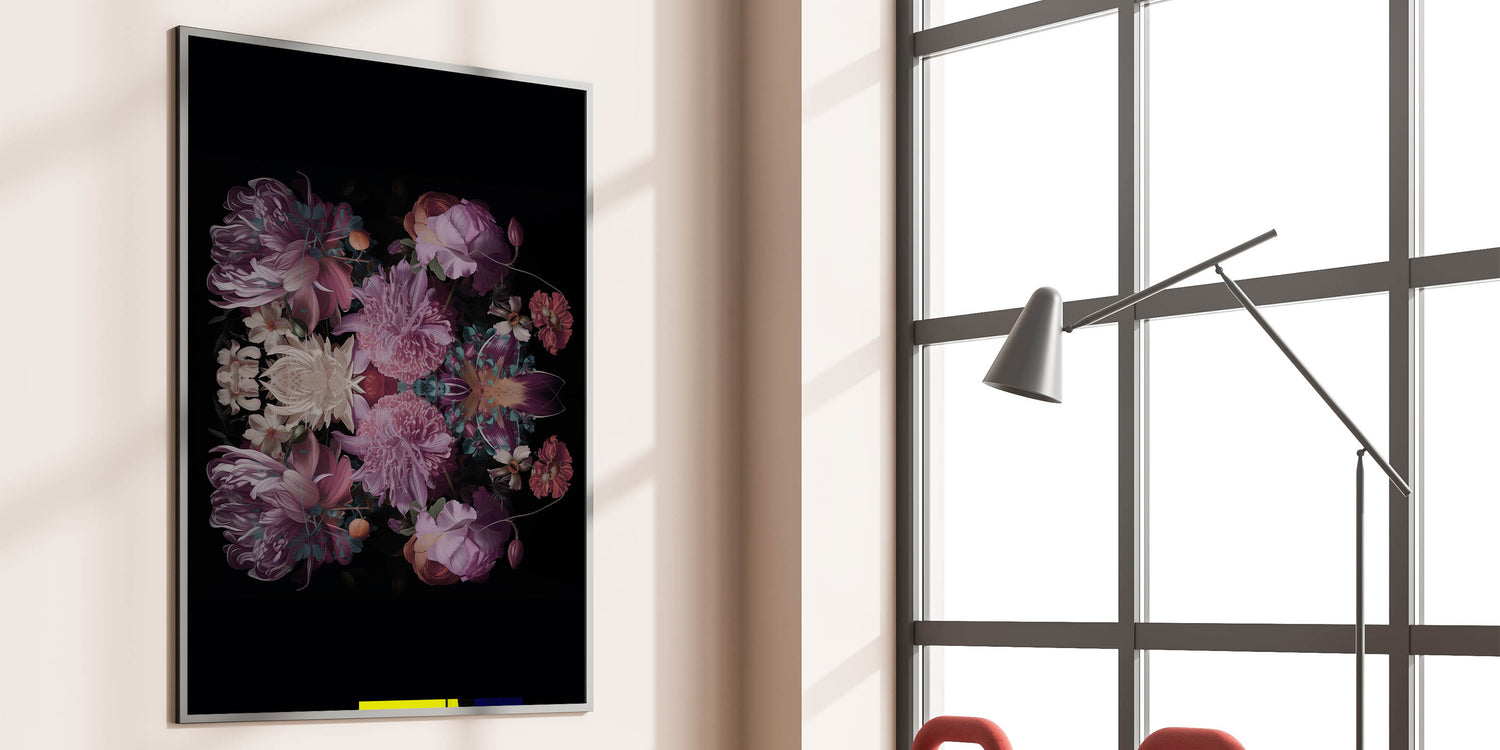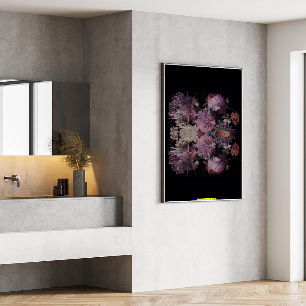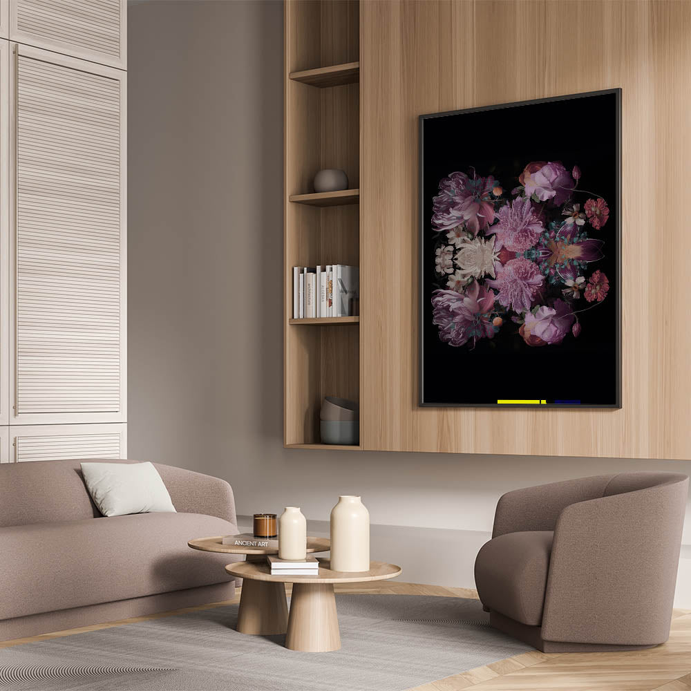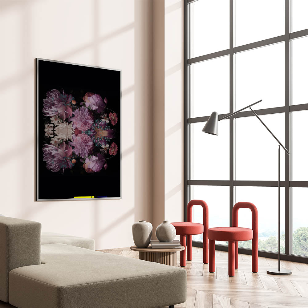Add a dramatic touch to your space with this unique electric artwork, featuring a stunning dark floral composition. This bright and dynamic wall art showcases intricate blooms in shades of pink, purple, and beige against a deep black background, creating a bold contrast that captures attention. The electric highlights give the floral arrangement a contemporary edge, making it perfect for adding a touch of sophistication to modern interiors.