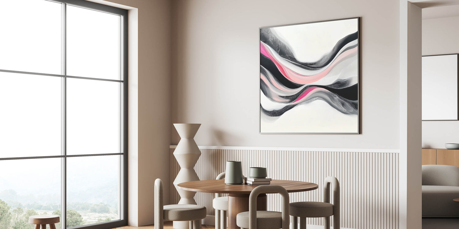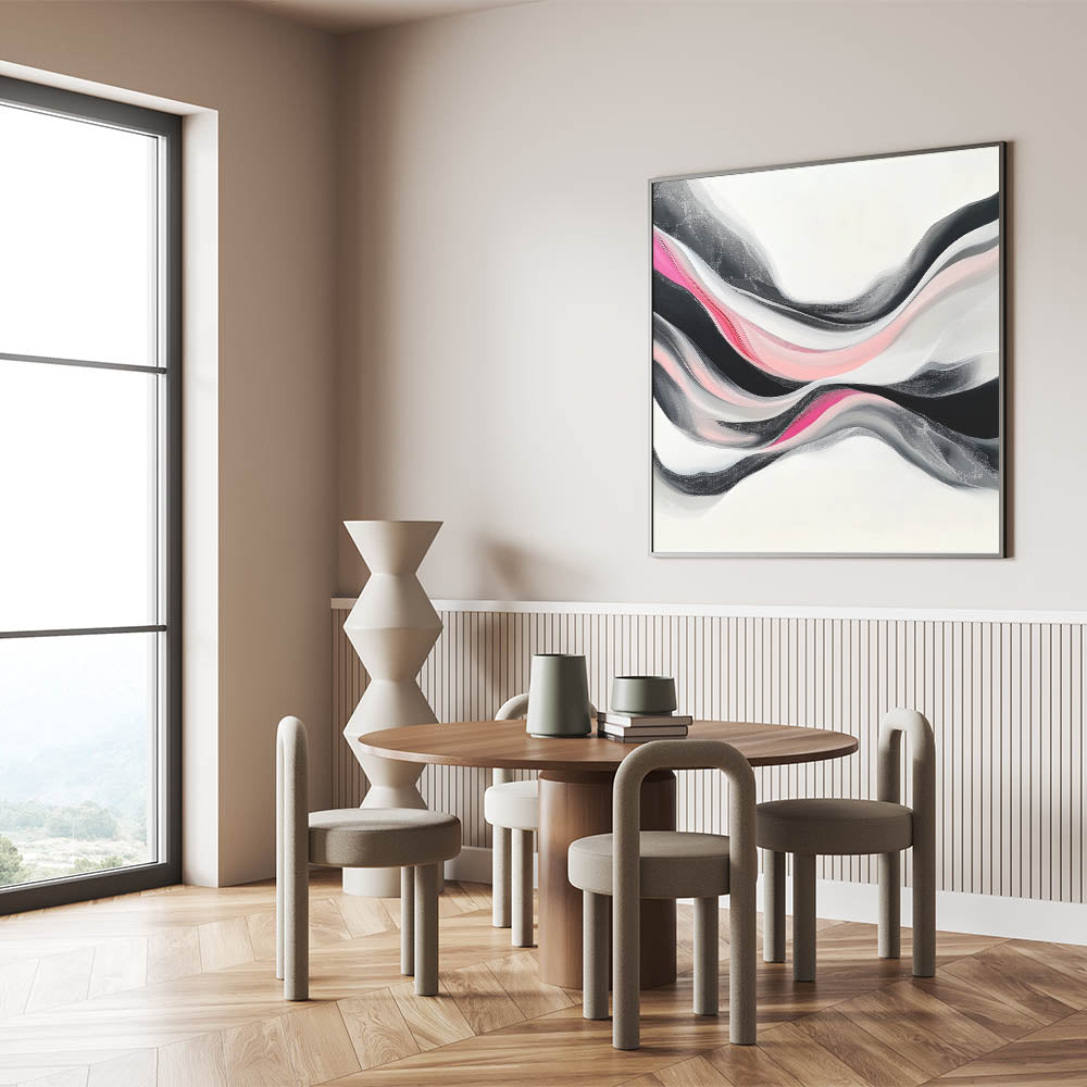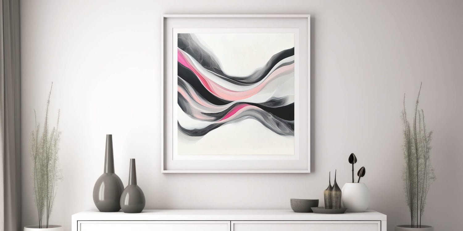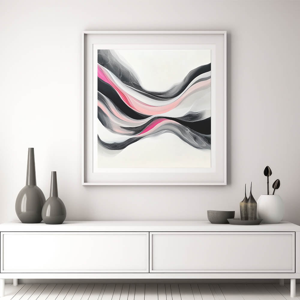 Bold yet graceful, this abstract art print flows with layered waves of fuchsia, blush pink, black, and soft gray. Its modern fluidity and dynamic contrast bring energy and sophistication to any space.
