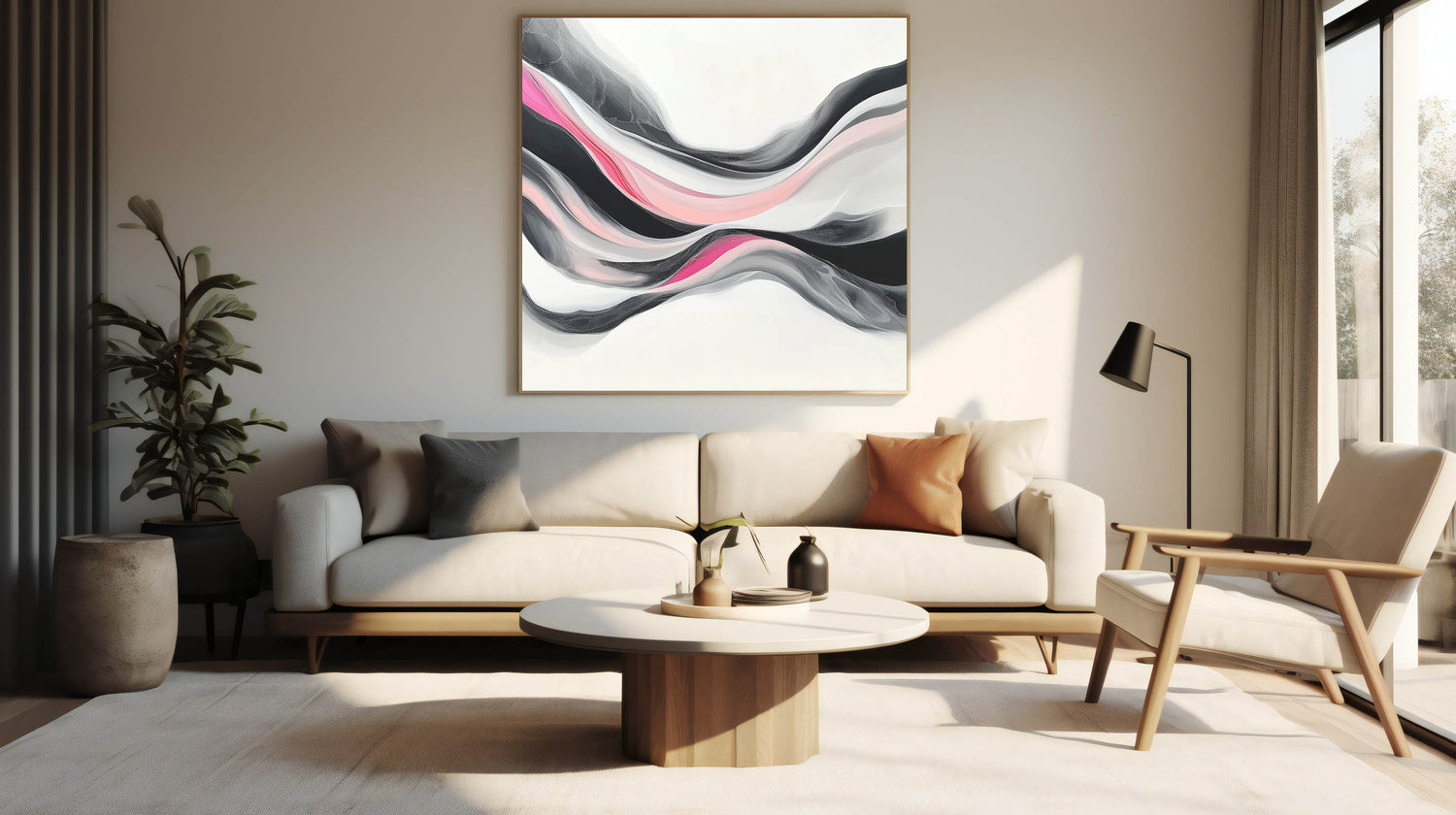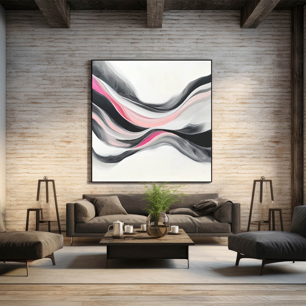 • Striking fluid wave design blending fuchsia, blush, white, and gray tones with bold black accents