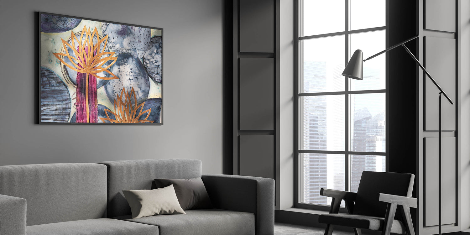Contemporary Framed Abstract Art – Gold Lotus Over Blue Textures