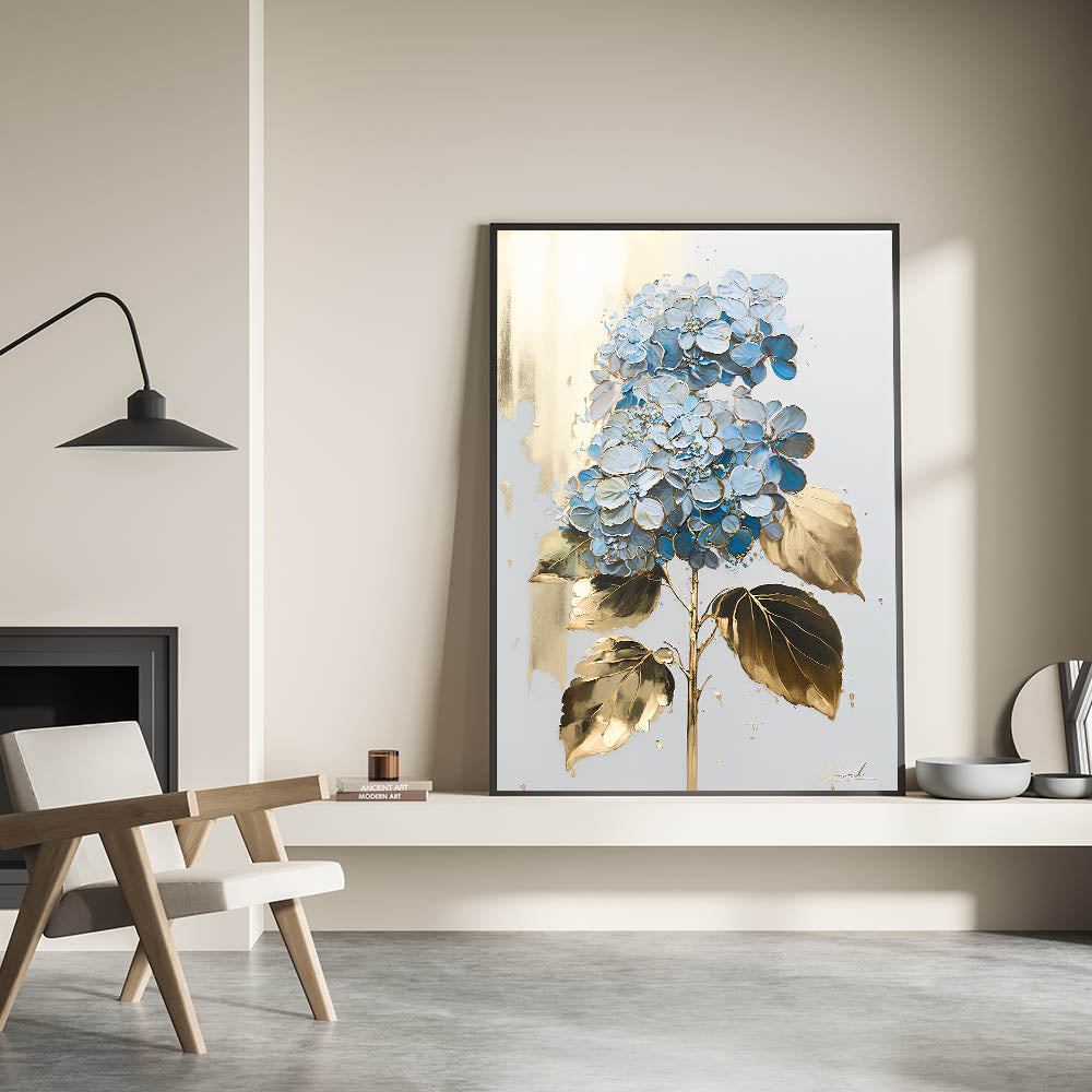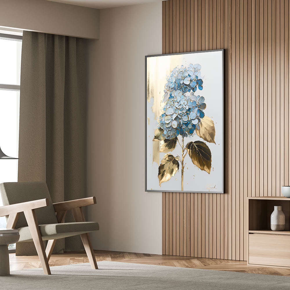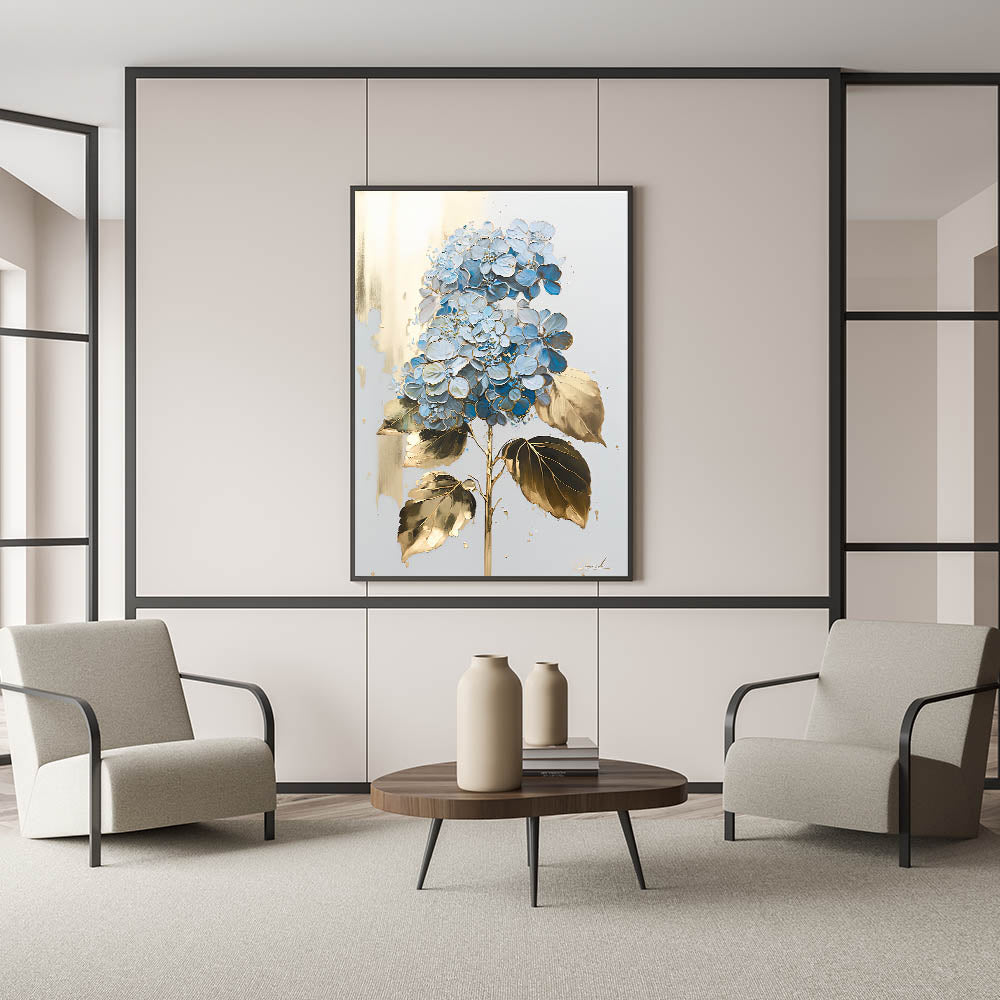Add an element of elegance and sophistication to your home with this luxury floral wall art, featuring a stunning blue hydrangea with gold-accented leaves on a soft, neutral background. The intricate detailing and metallic highlights create a refined aesthetic, making it a perfect addition to modern living room decor. Whether displayed as canvas wall art or framed wall art, this piece brings a timeless beauty to any space.