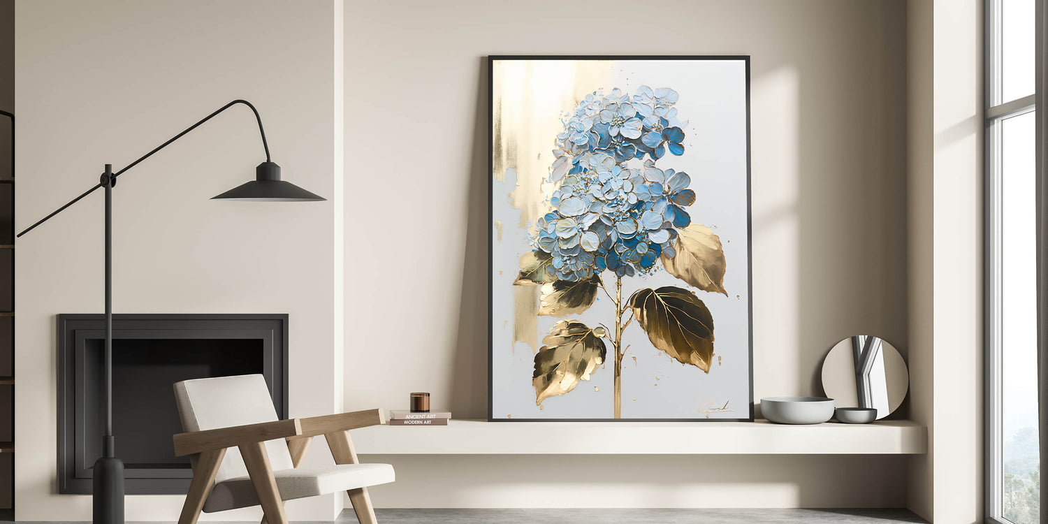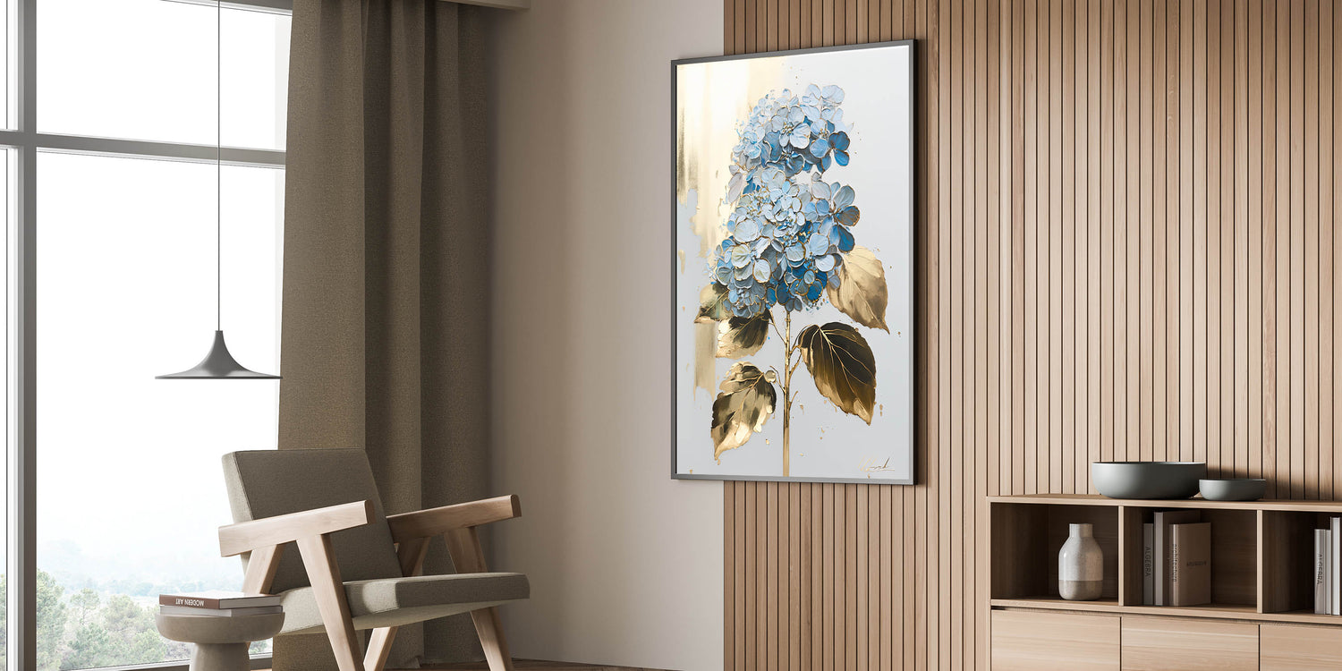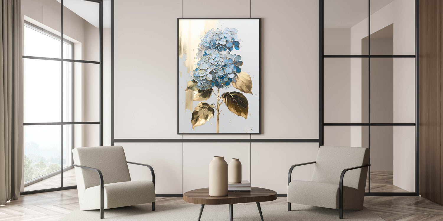 Add an element of elegance and sophistication to your home with this luxury floral wall art, featuring a stunning blue hydrangea with gold-accented leaves on a soft, neutral background. The intricate detailing and metallic highlights create a refined aesthetic, making it a perfect addition to modern living room decor. Whether displayed as canvas wall art or framed wall art, this piece brings a timeless beauty to any space.