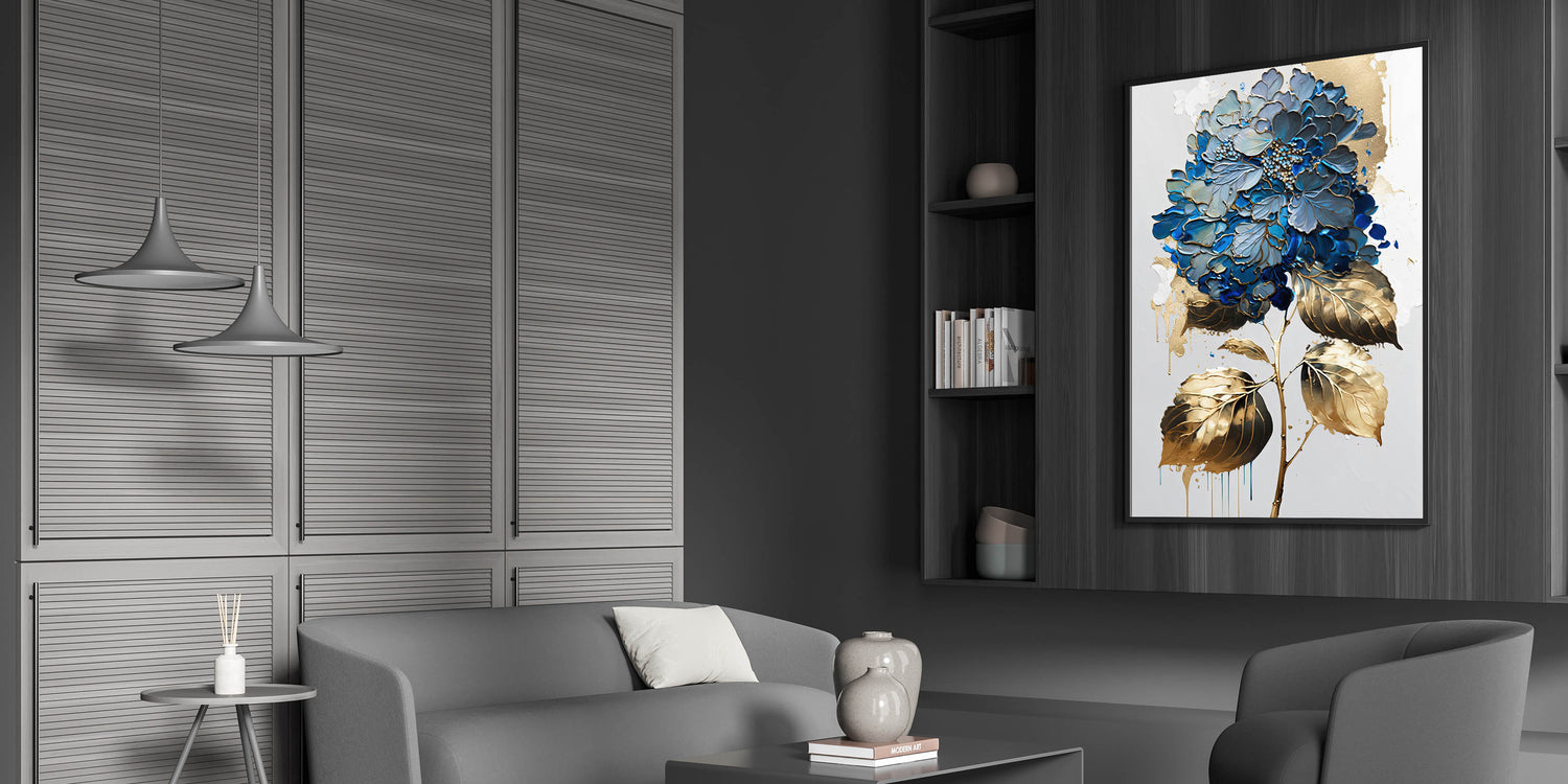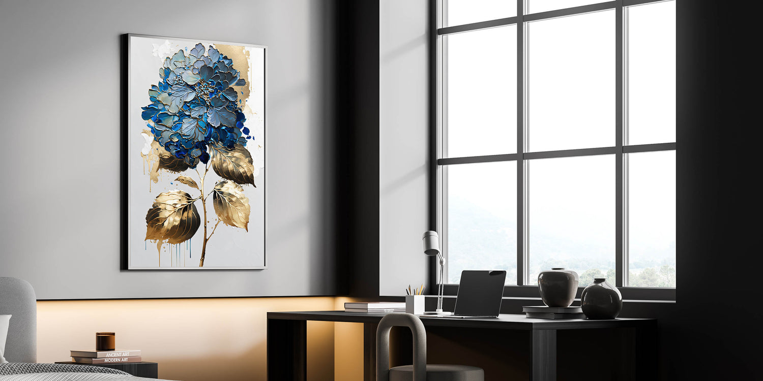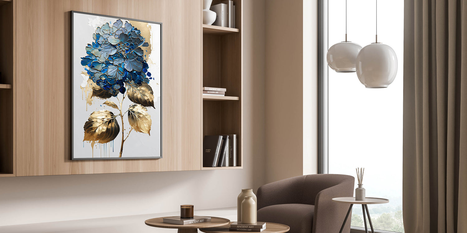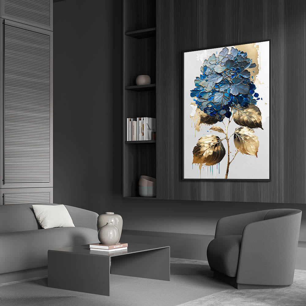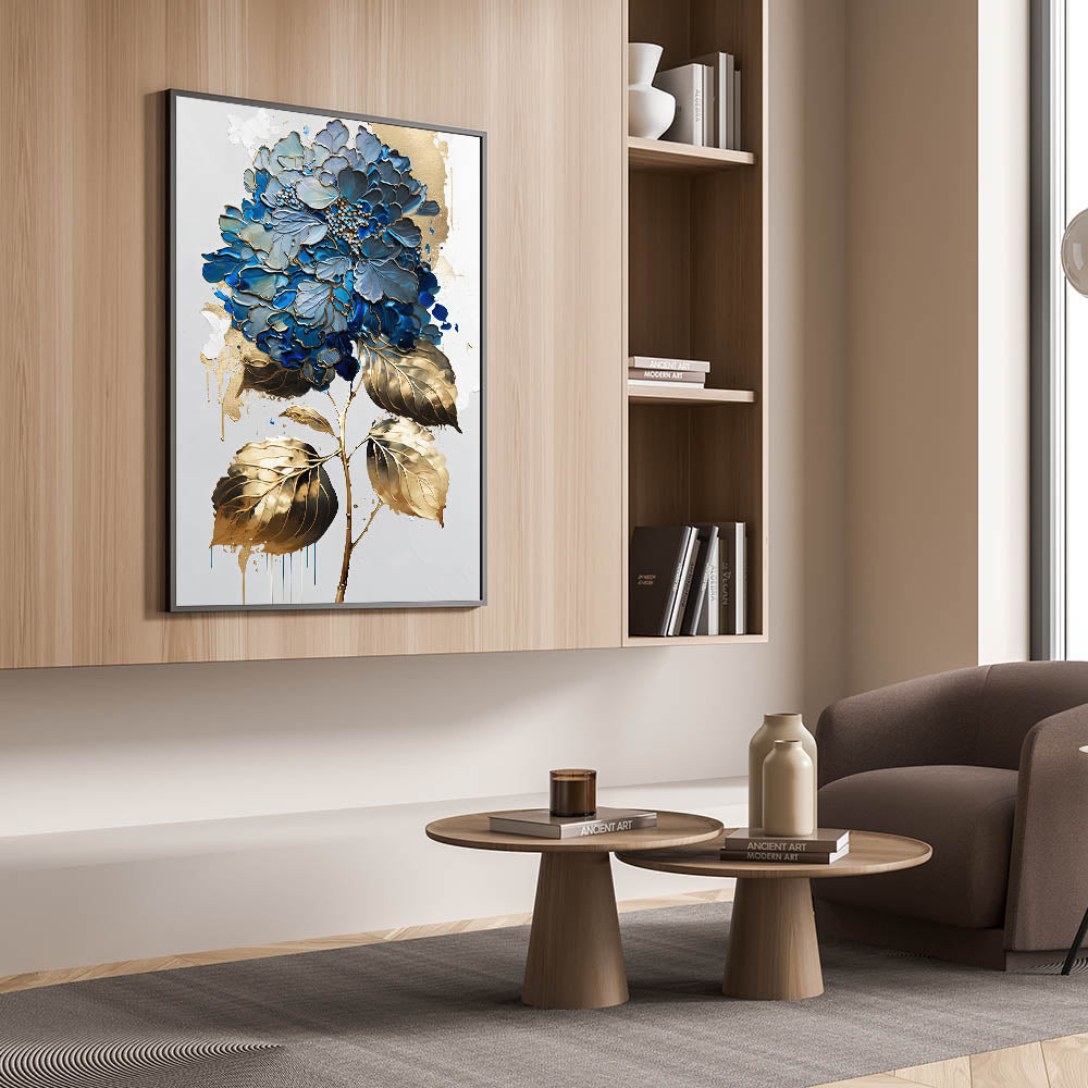 Modern Floral Canvas Wall Art – Blue Hydrangea & Gold Accents
