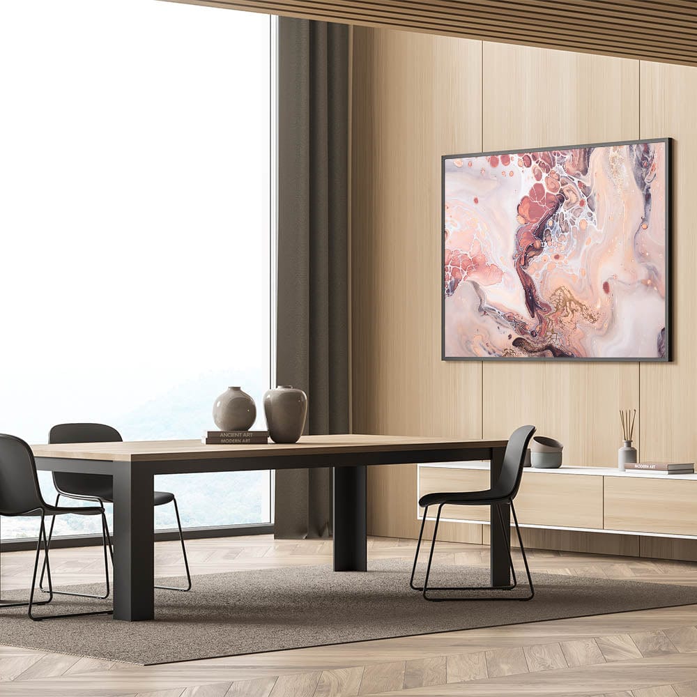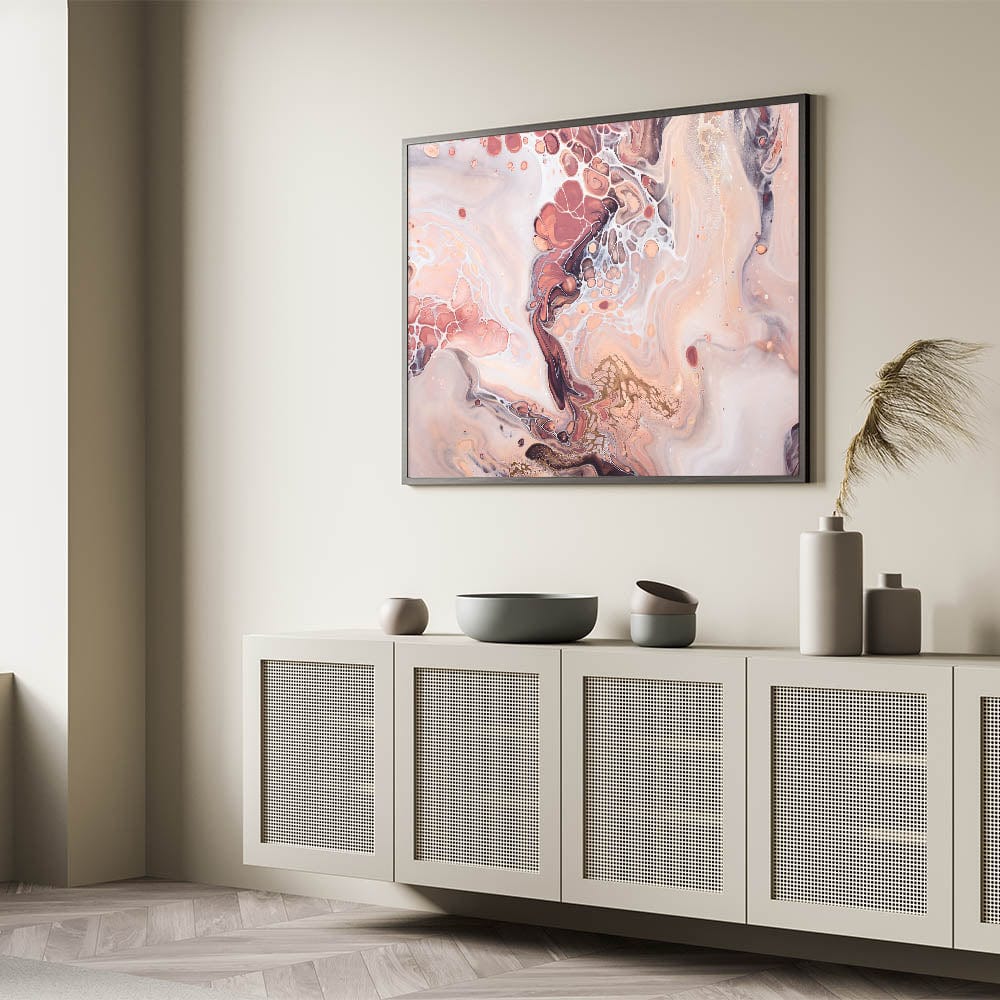 Add warmth and elegance to your space with this modern fluid art print, featuring a mesmerizing blend of peach, burgundy, and soft beige. The swirling organic forms and intricate details create a harmonious and sophisticated aesthetic, perfect for modern and contemporary interiors.