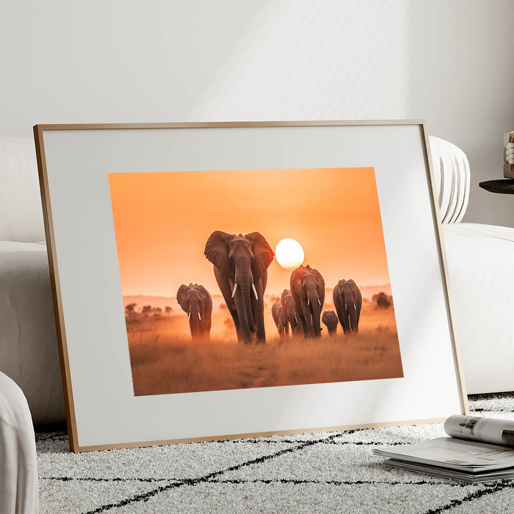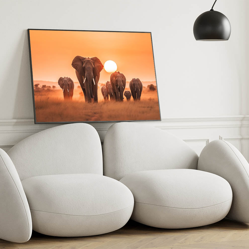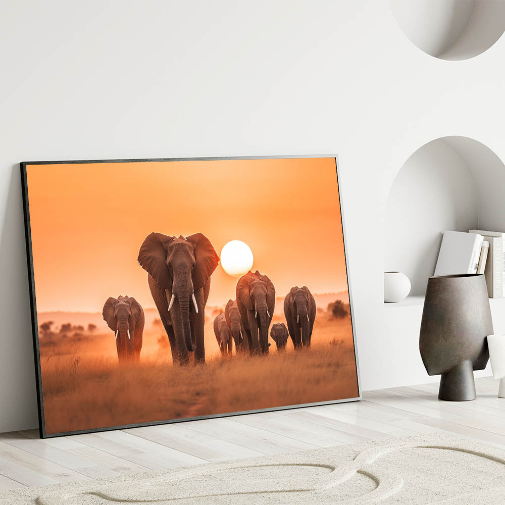 Capture the breathtaking beauty of the African savannah with this Elephant Herd at Sunset Wall Art. Featuring a majestic group of elephants gracefully marching across the golden plains, this piece is a tribute to the grandeur and serenity of wildlife. The warm hues of the setting sun create a stunning contrast against the silhouettes of these magnificent creatures, making this artwork an ideal choice for those who appreciate the raw beauty of nature.