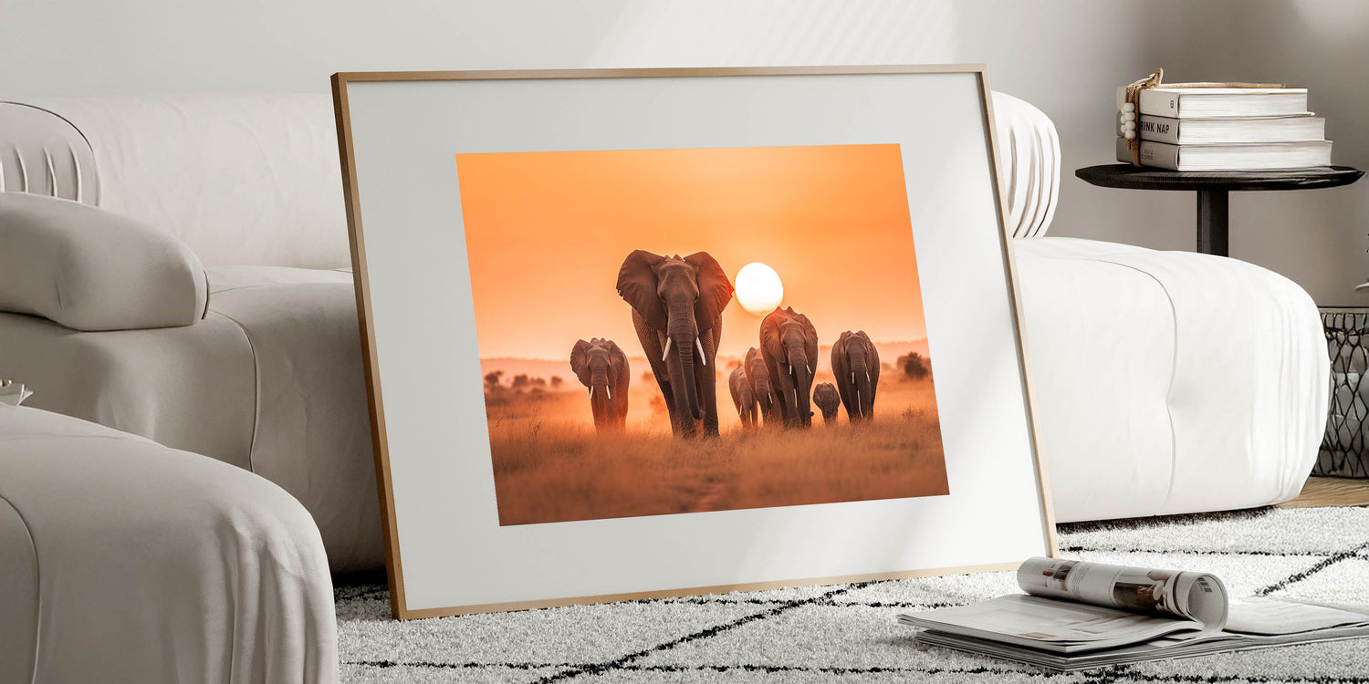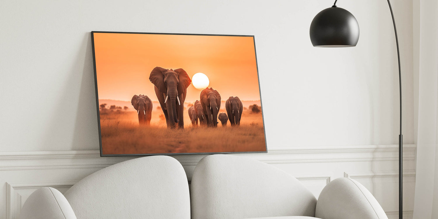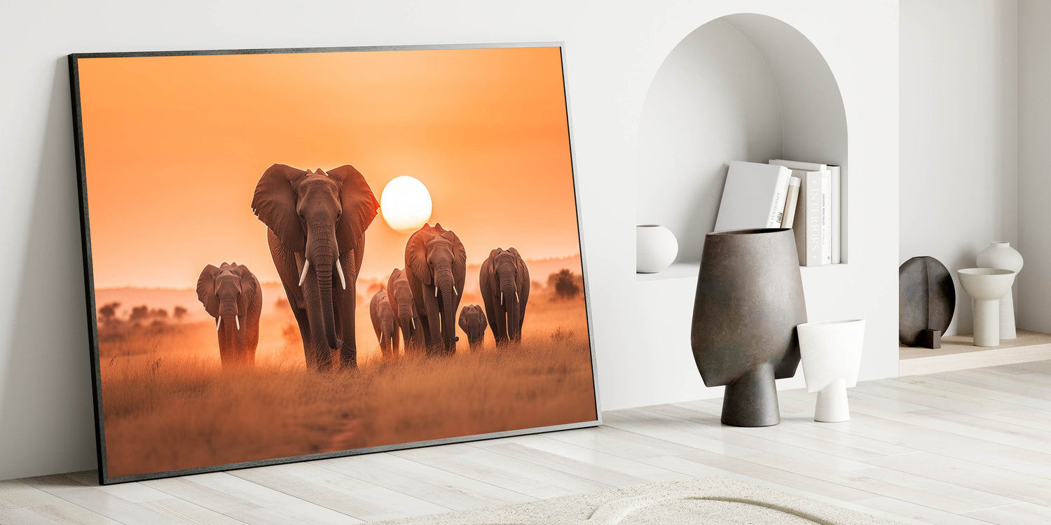 Capture the breathtaking beauty of the African savannah with this Elephant Herd at Sunset Wall Art. Featuring a majestic group of elephants gracefully marching across the golden plains, this piece is a tribute to the grandeur and serenity of wildlife. The warm hues of the setting sun create a stunning contrast against the silhouettes of these magnificent creatures, making this artwork an ideal choice for those who appreciate the raw beauty of nature.