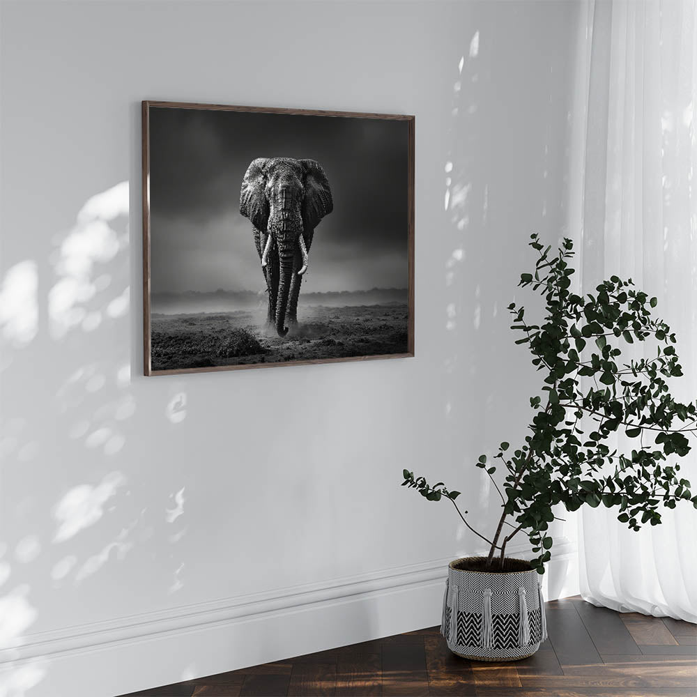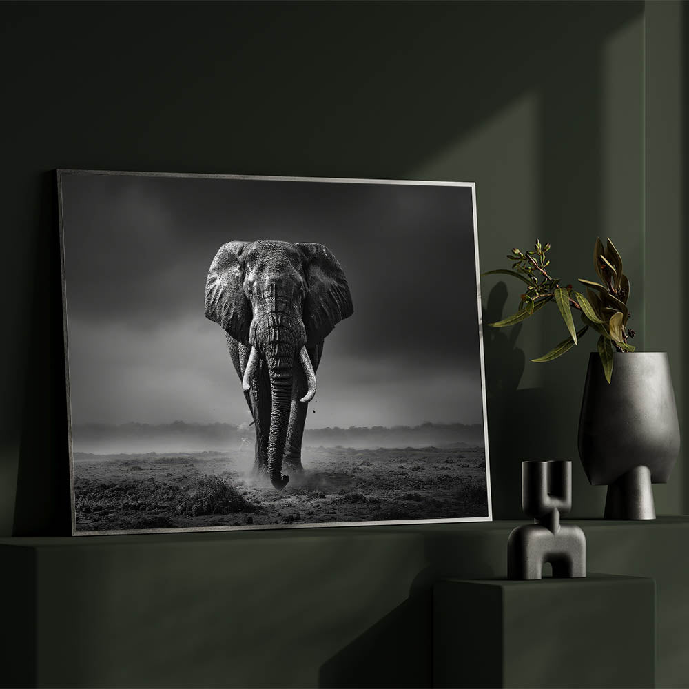 Immerse yourself in the raw power of nature with this Powerful Elephant in the Storm wall art. Captured in striking black and white, this dramatic piece features a majestic elephant standing resolute against a dark and ominous storm. The deep contrasts and fine details highlight the strength and determination of the elephant, making this artwork a bold and captivating addition to any room.