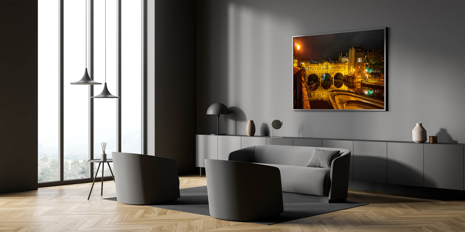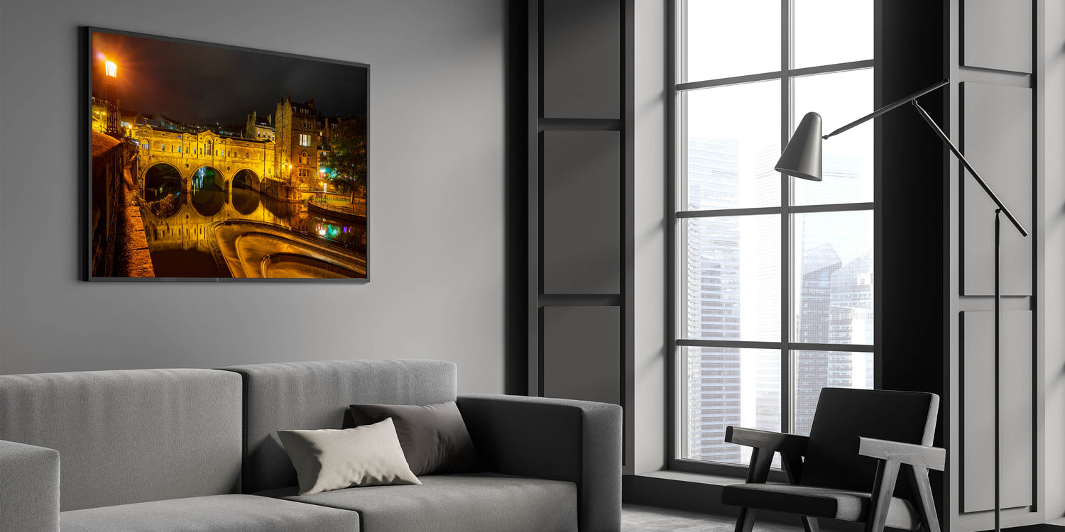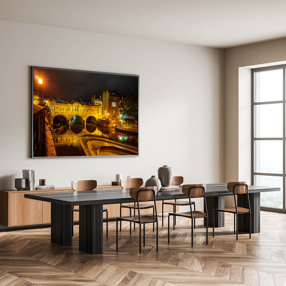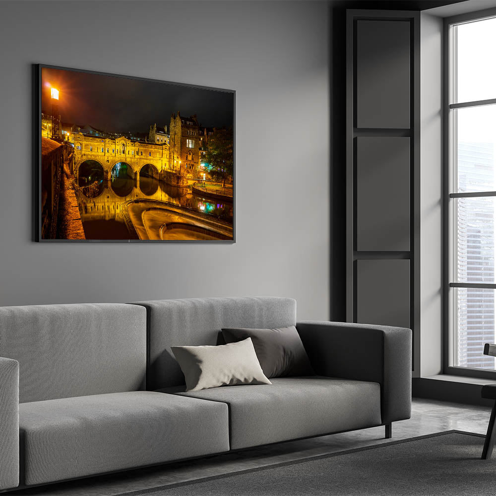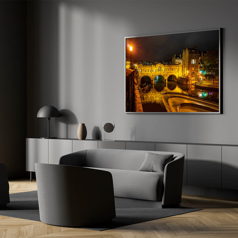 - High-quality Bath England wall art featuring Pulteney Bridge illuminated at night.