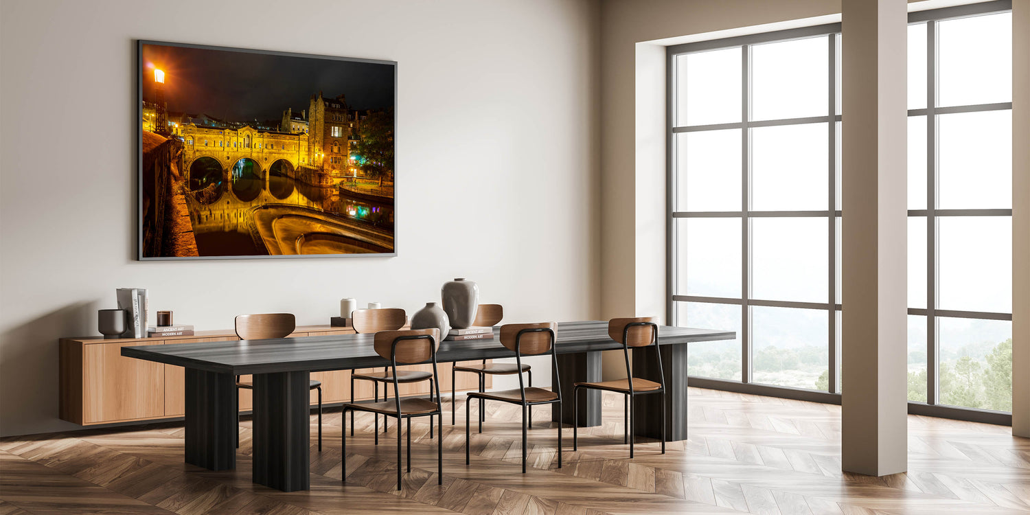 This captivating Bath cityscape canvas showcases the iconic Pulteney Bridge illuminated against the night sky, with its golden glow beautifully reflected in the calm waters of the River Avon. The warm lighting and deep shadows create a mesmerizing scene, offering both elegance and serenity. This artwork is perfect for bringing a touch of Bath’s historic charm into your living room, bedroom, or office space.