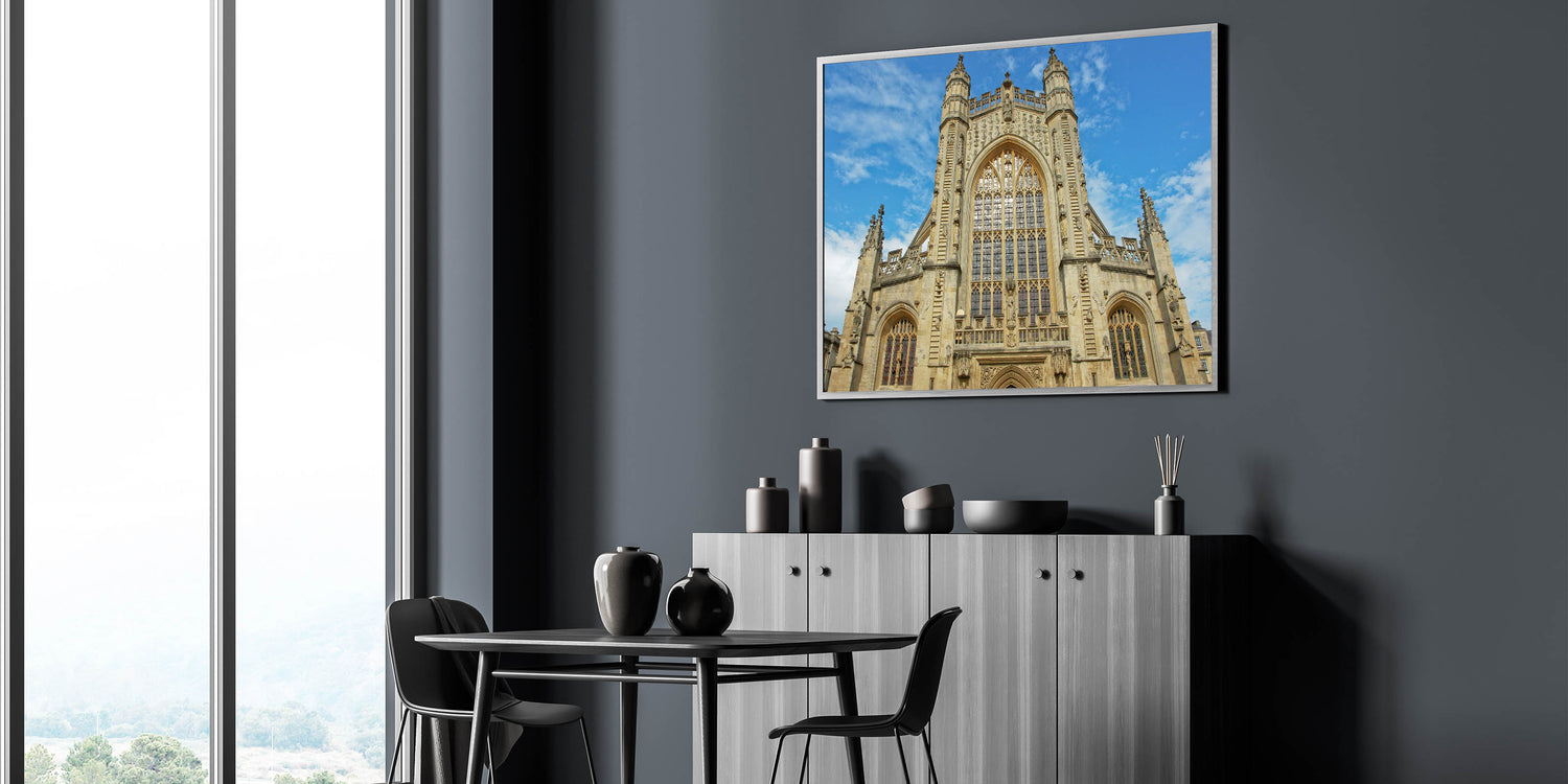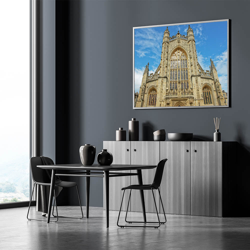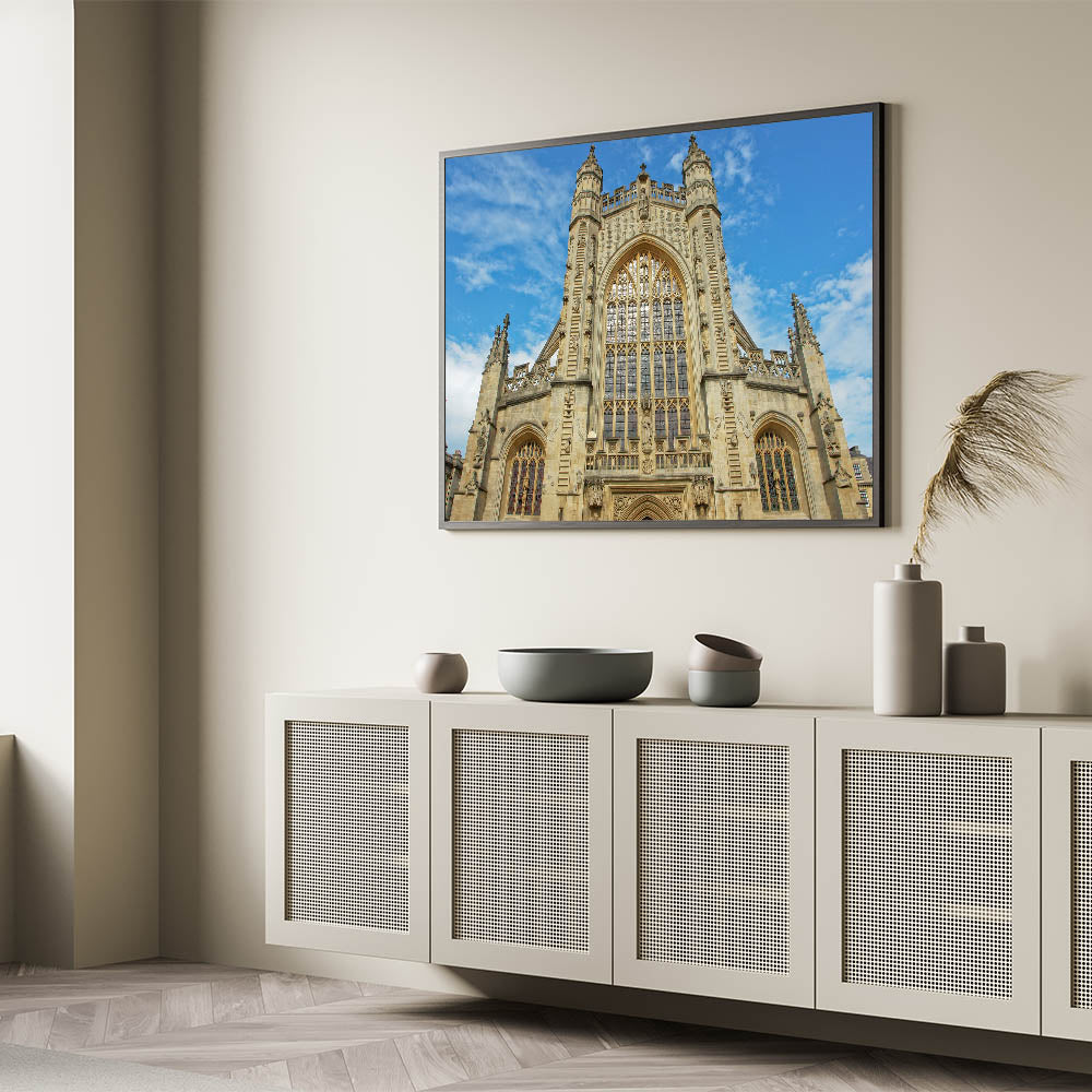 Capture the timeless elegance of Bath with this stunning wall art, featuring the iconic Georgian architecture of the city. This artwork showcases Bath Abbey's intricate design, perfectly reflecting the rich history and heritage of the region. The majestic facade and beautiful Gothic windows make this print a captivating addition to any space, whether at home or in an office.