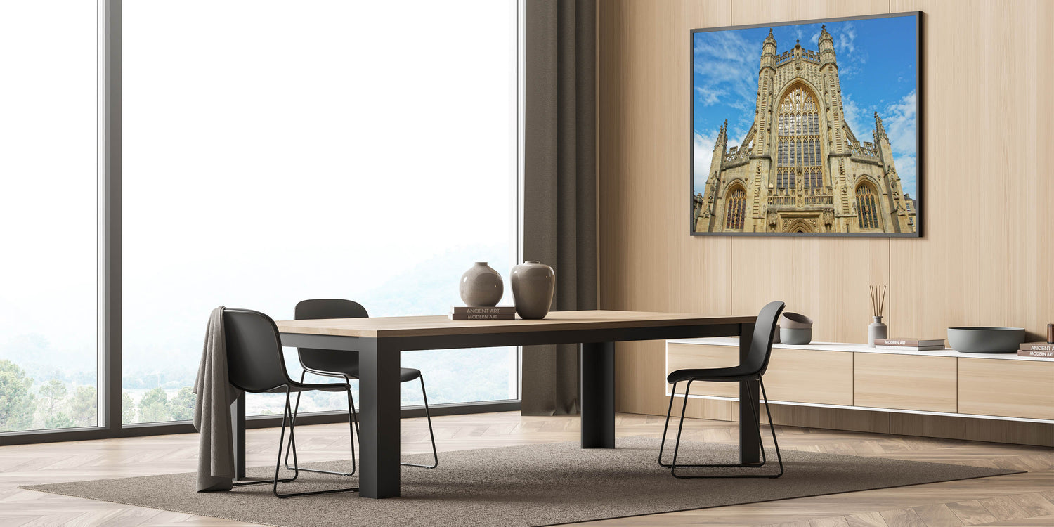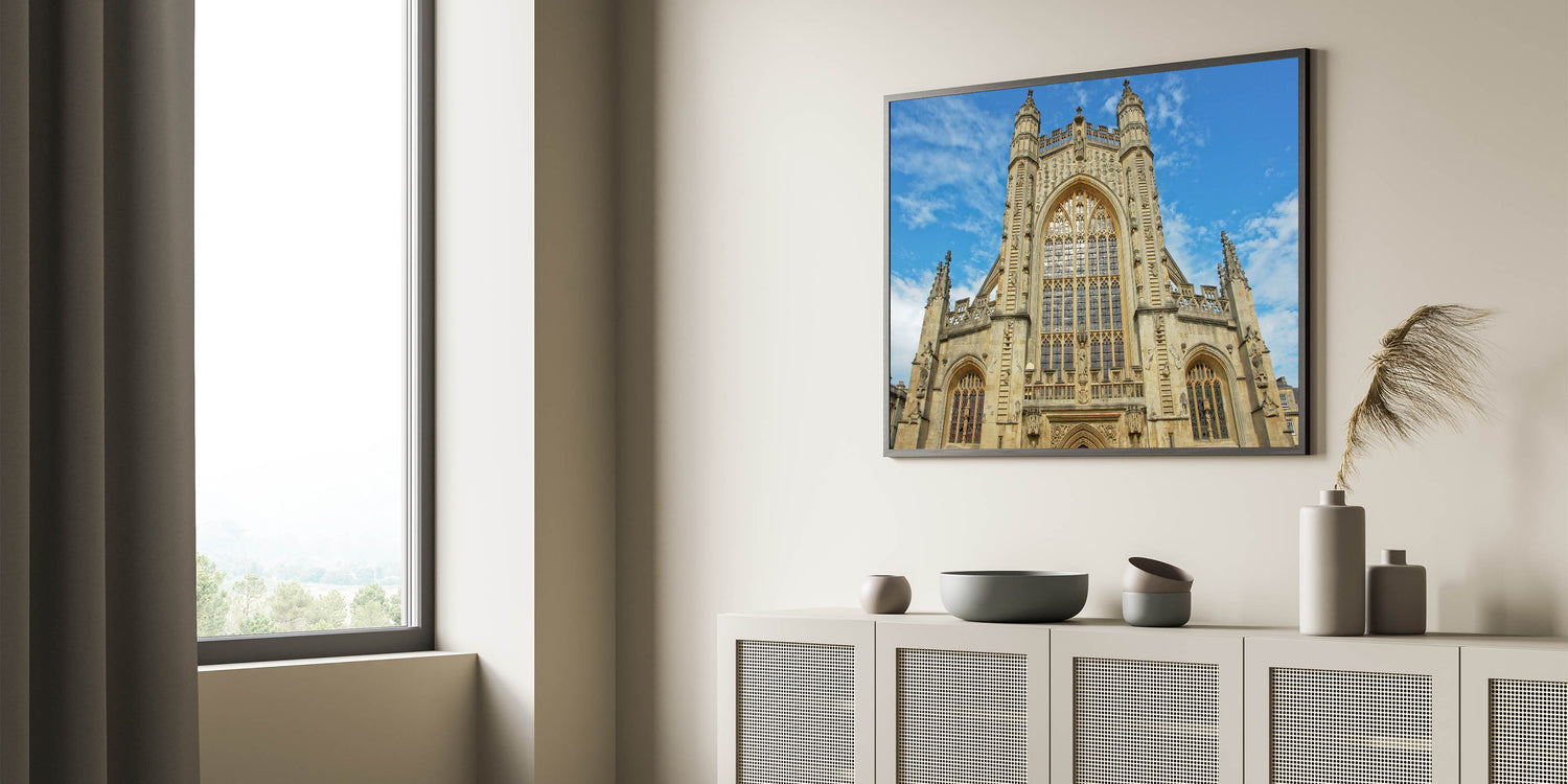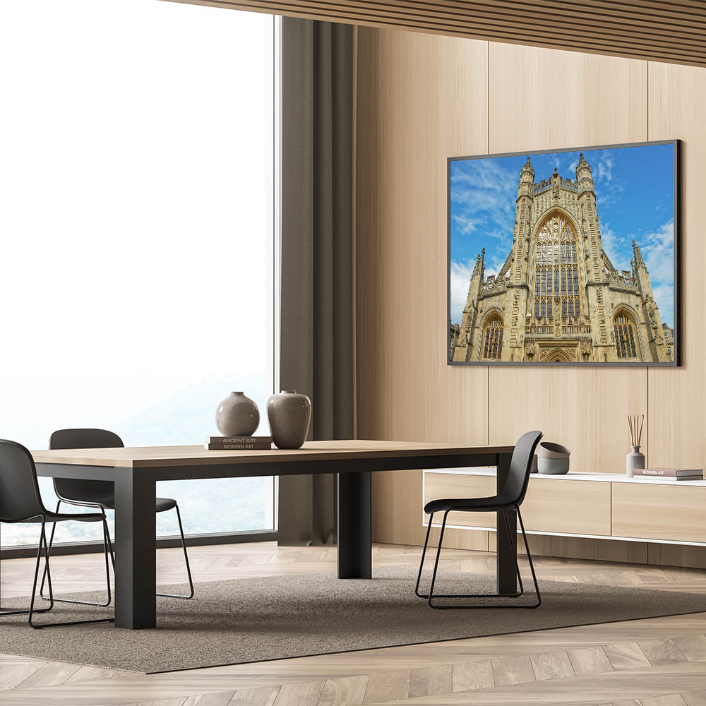 Capture the timeless elegance of Bath with this stunning wall art, featuring the iconic Georgian architecture of the city. This artwork showcases Bath Abbey's intricate design, perfectly reflecting the rich history and heritage of the region. The majestic facade and beautiful Gothic windows make this print a captivating addition to any space, whether at home or in an office.