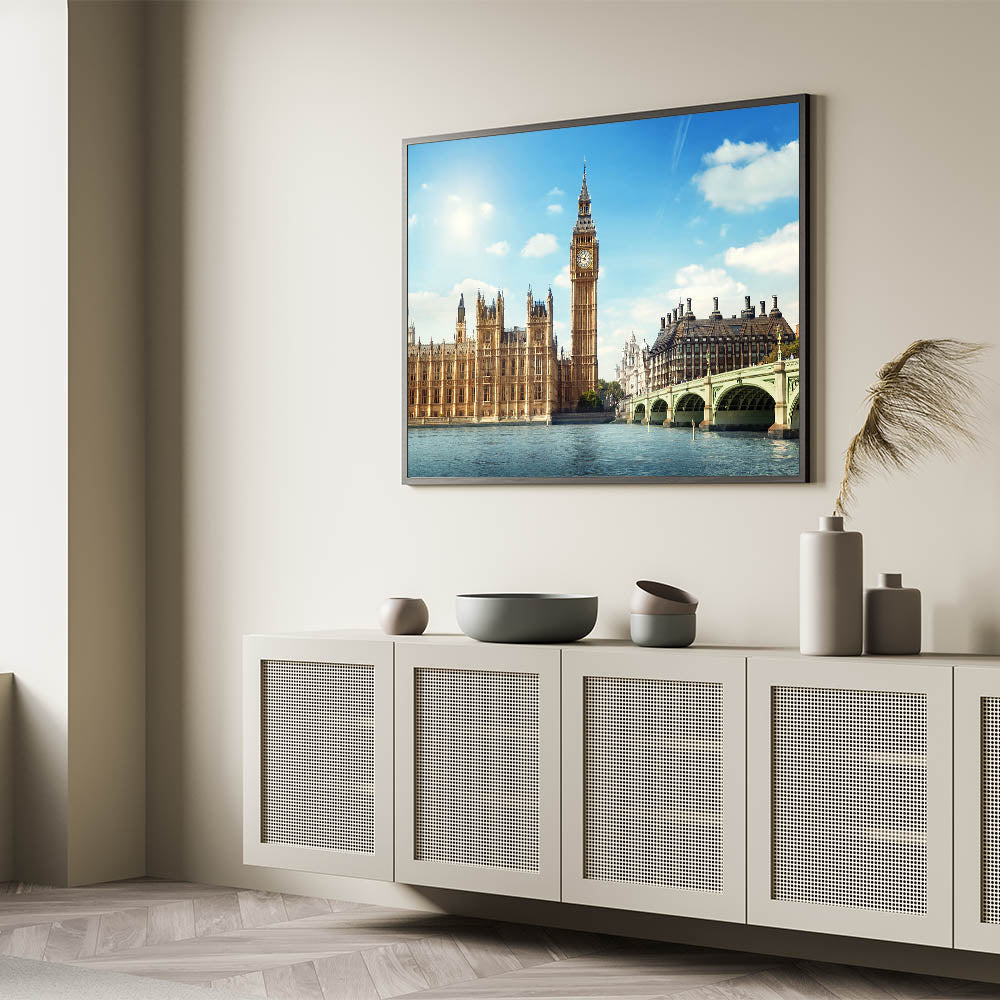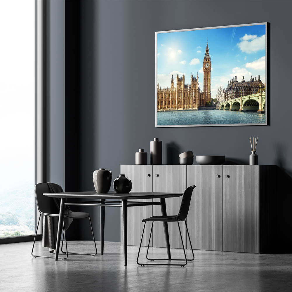 Capture the beauty of London’s most famous landmark with this stunning Big Ben wall art. This daylight view of the iconic Westminster Clock Tower against a clear blue sky offers a breathtaking perspective of London's historic architecture. Perfect for adding a touch of elegance to your home or office, this artwork celebrates the grandeur of one of the world's most recognizable landmarks.