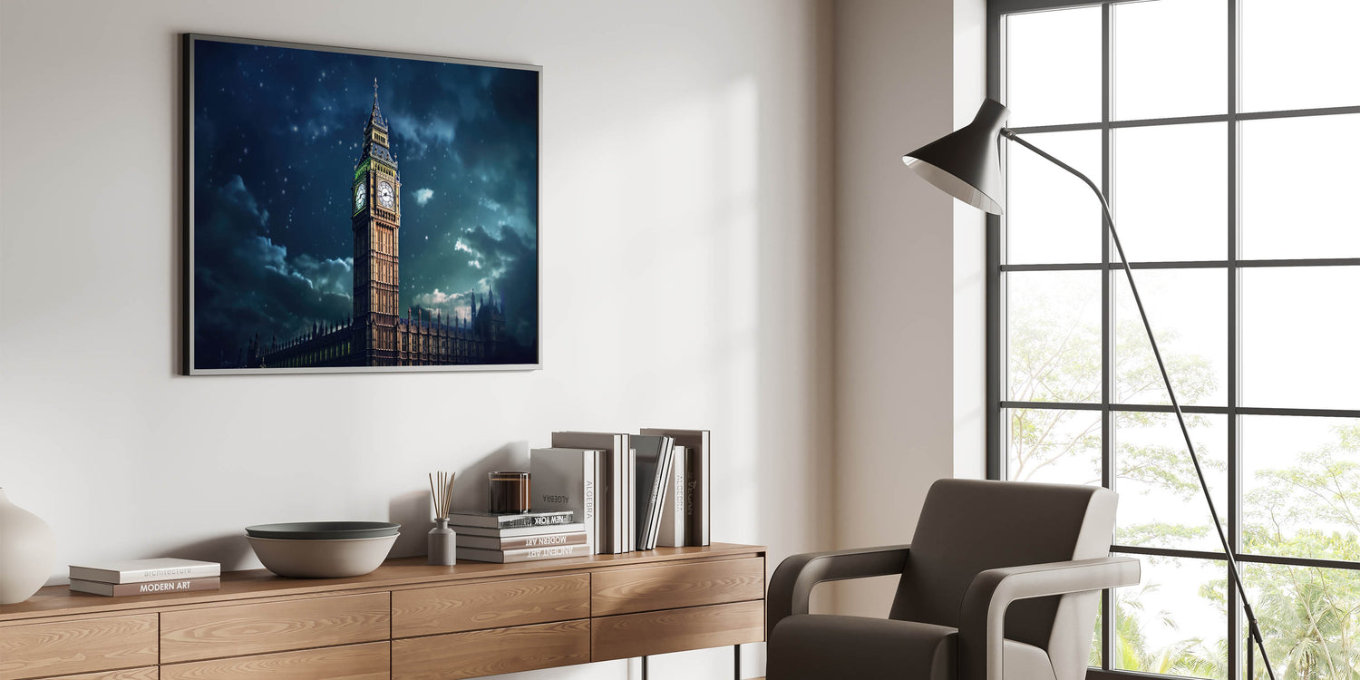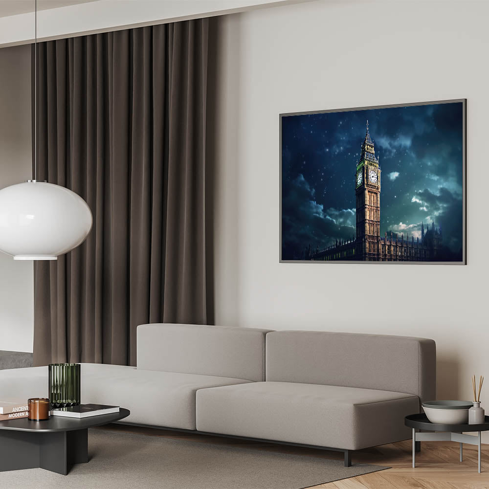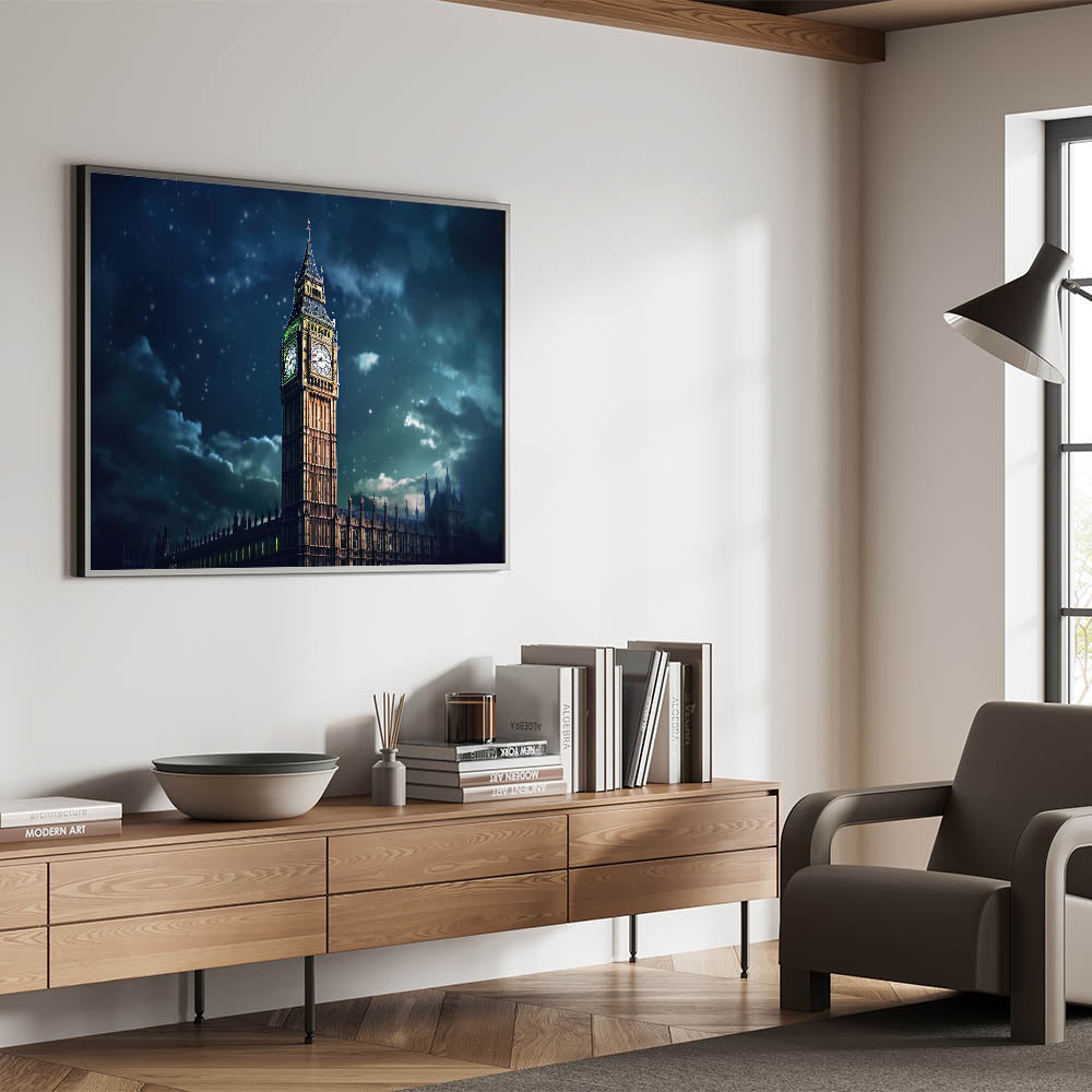 Add a touch of magic to your space with this captivating Big Ben wall art, featuring the Westminster Clock Tower under a stunning starry night sky. This breathtaking image captures the iconic London landmark illuminated against the dark night, with twinkling stars adding a touch of serenity and wonder. Perfect for those who admire London’s timeless architecture and want to bring a bit of nighttime beauty into their home.