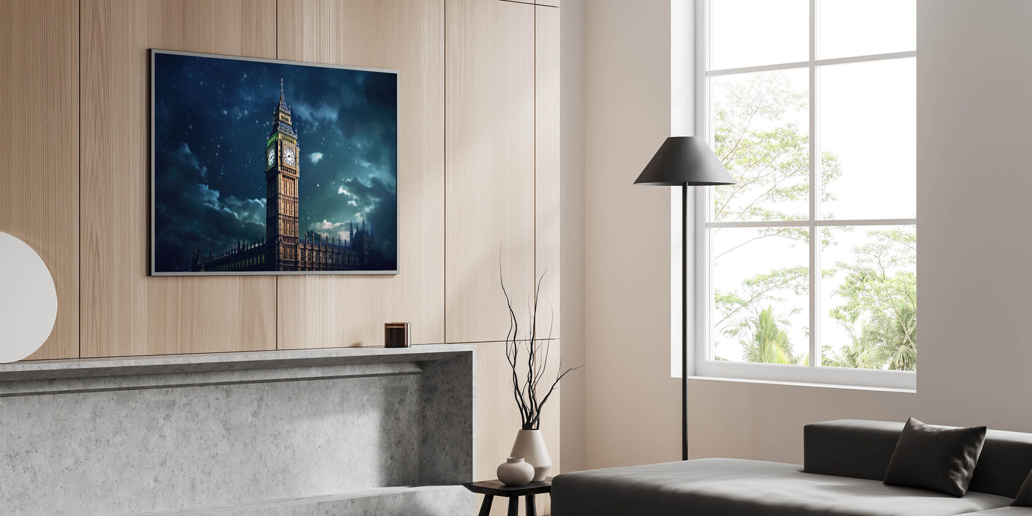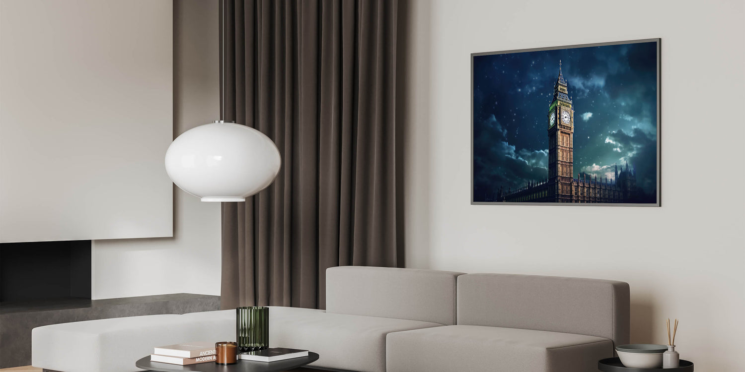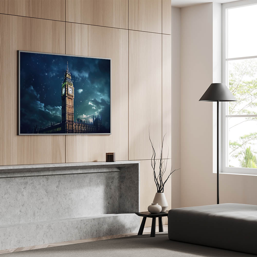 Add a touch of magic to your space with this captivating Big Ben wall art, featuring the Westminster Clock Tower under a stunning starry night sky. This breathtaking image captures the iconic London landmark illuminated against the dark night, with twinkling stars adding a touch of serenity and wonder. Perfect for those who admire London’s timeless architecture and want to bring a bit of nighttime beauty into their home.