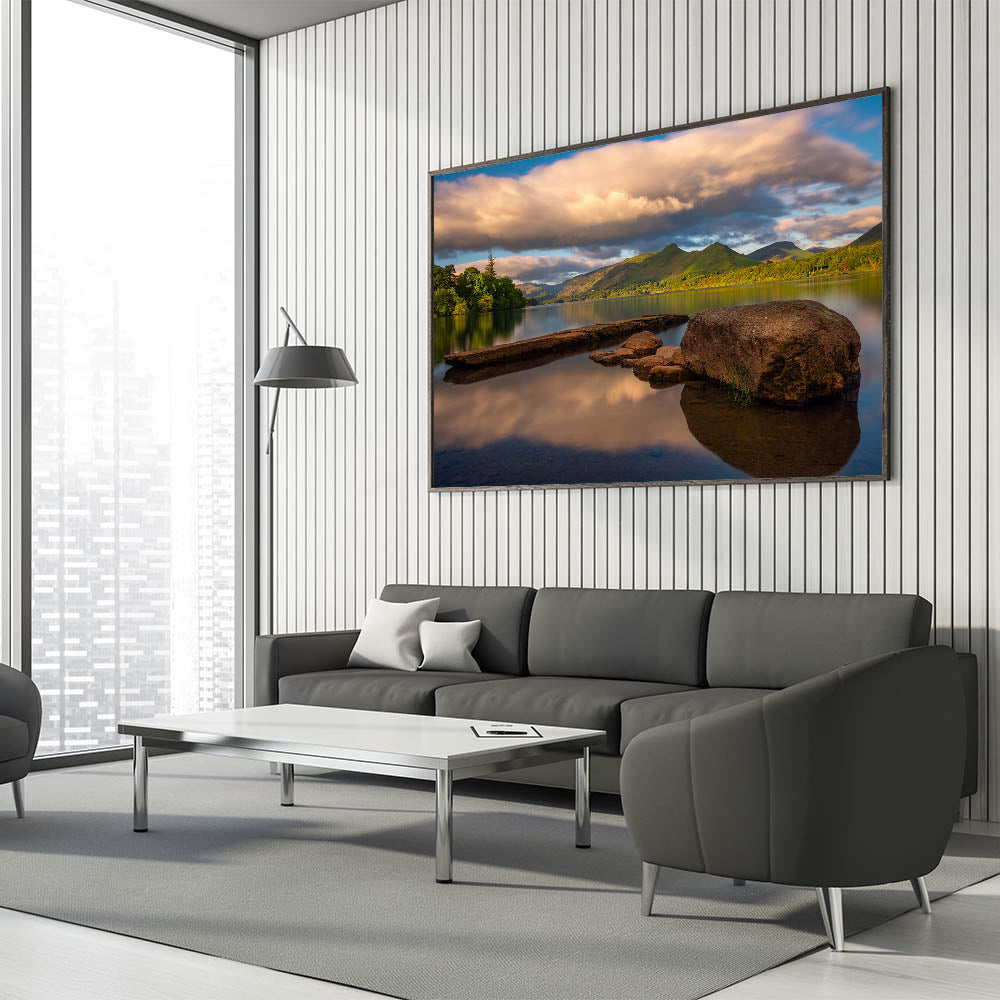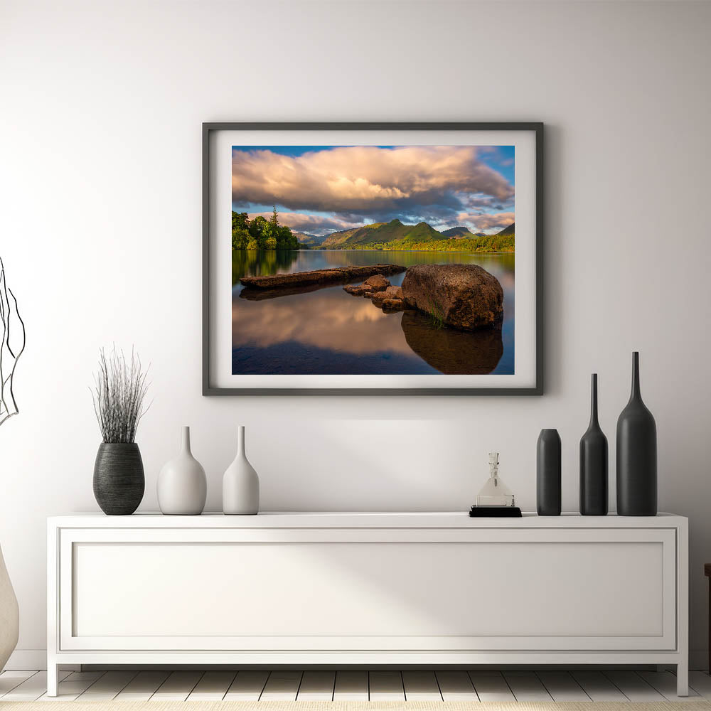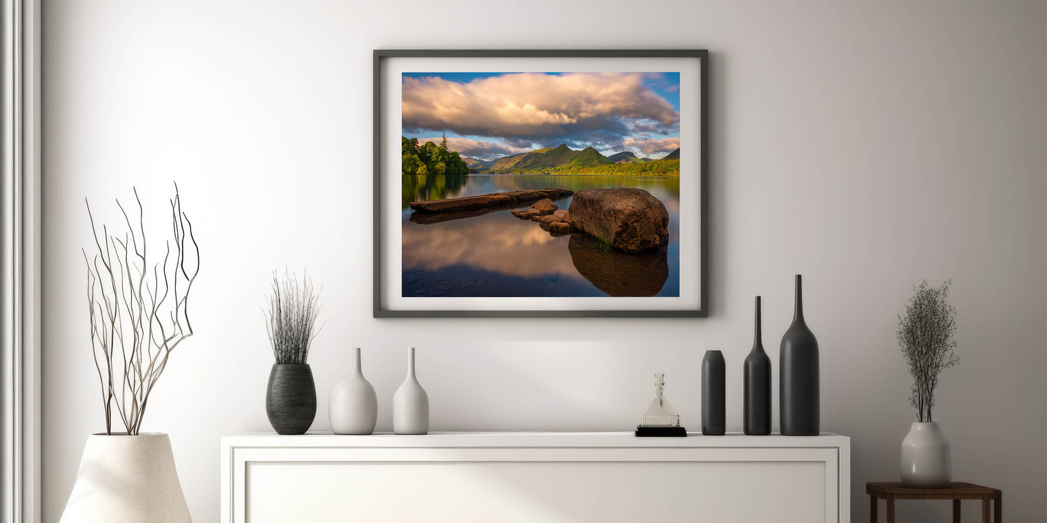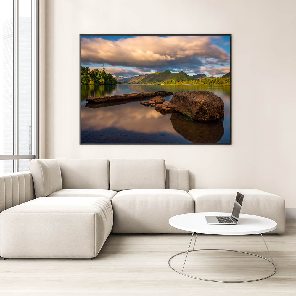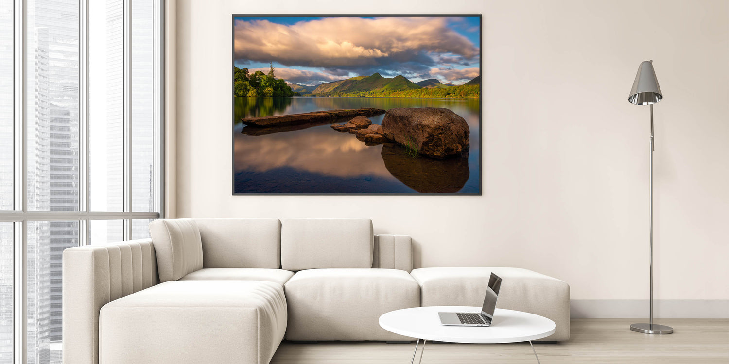 Immerse yourself in the serene beauty of the Lake District with this stunning piece of Cumbria wall art. The calm waters reflect the greenery of the hills and the vibrant sky, creating a peaceful scene that brings nature's tranquility to your home. The rugged rocks in the foreground add texture, enhancing the overall charm of this Cumbria landscape art.