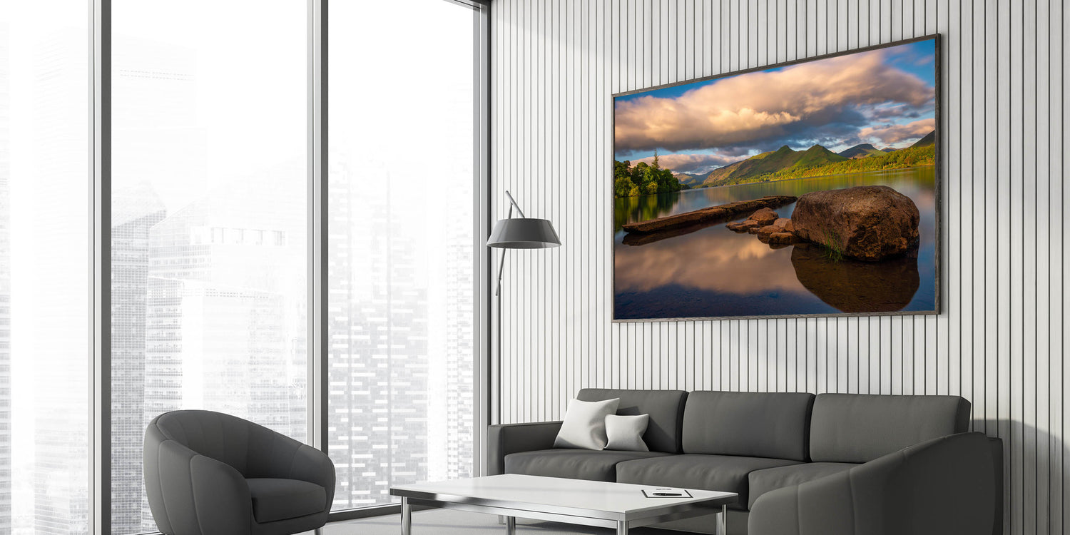 This Cumbria print brings the soothing calmness of nature into any room, making it the perfect piece for creating a peaceful atmosphere. Whether you choose a framed canvas or acrylic glass, this artwork will elevate your home decor with its beautiful composition and colors.