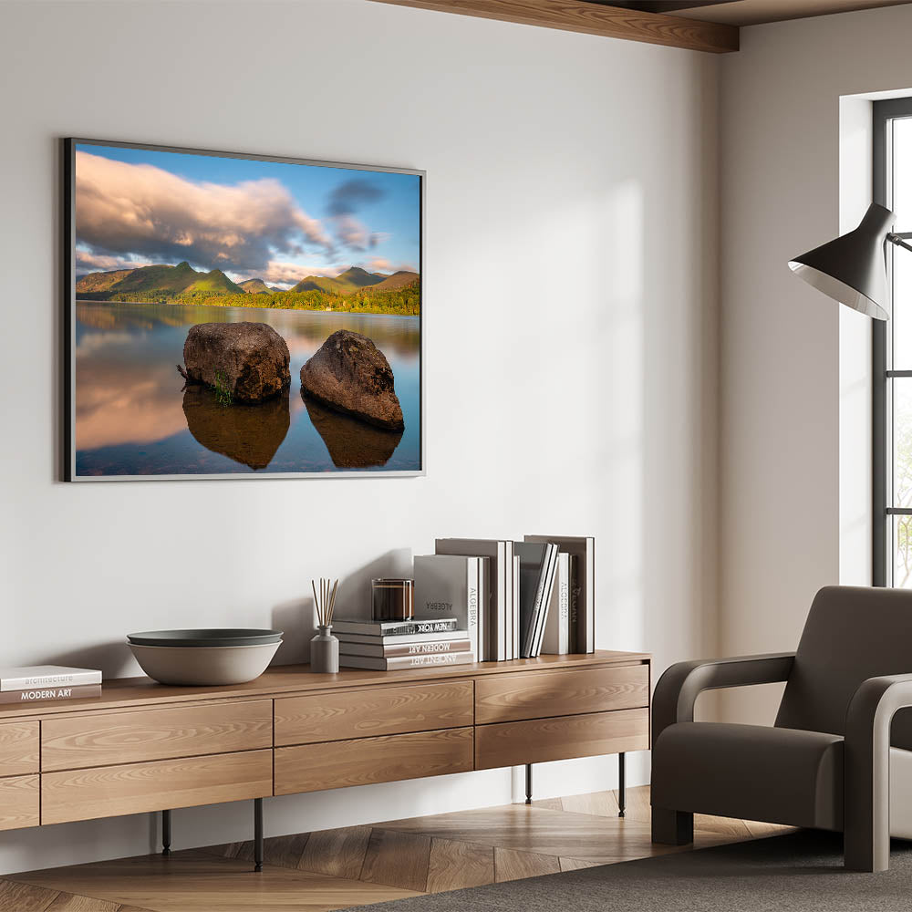 Capture the breathtaking beauty of Cumbria with this stunning wall art showcasing the tranquil Lake District landscape. Featuring serene reflections on the still waters and dramatic rocks in the foreground, this piece of Cumbria landscape art offers a perfect balance between natural beauty and serenity. The soft clouds and vibrant greenery of the rolling hills add to the captivating atmosphere, making this a must-have addition to any Cumbria art collection.