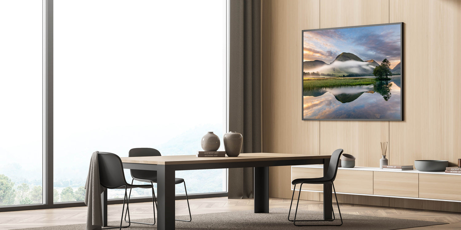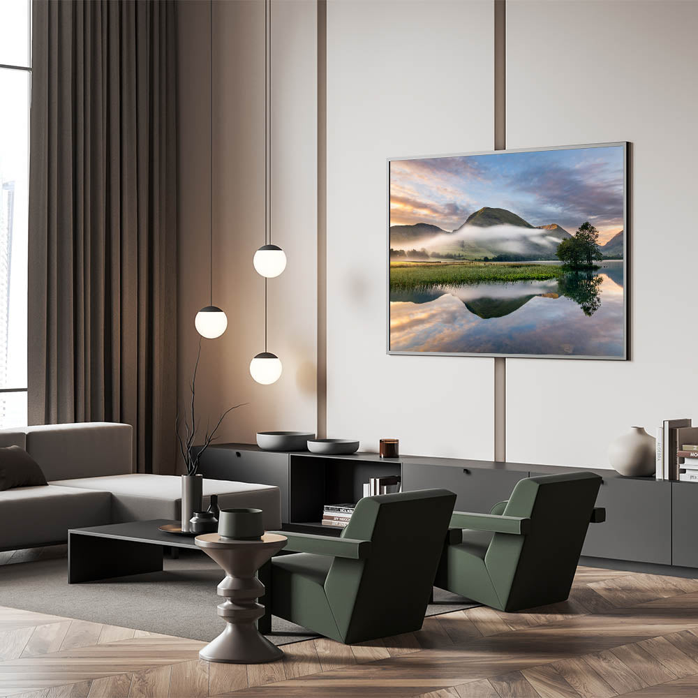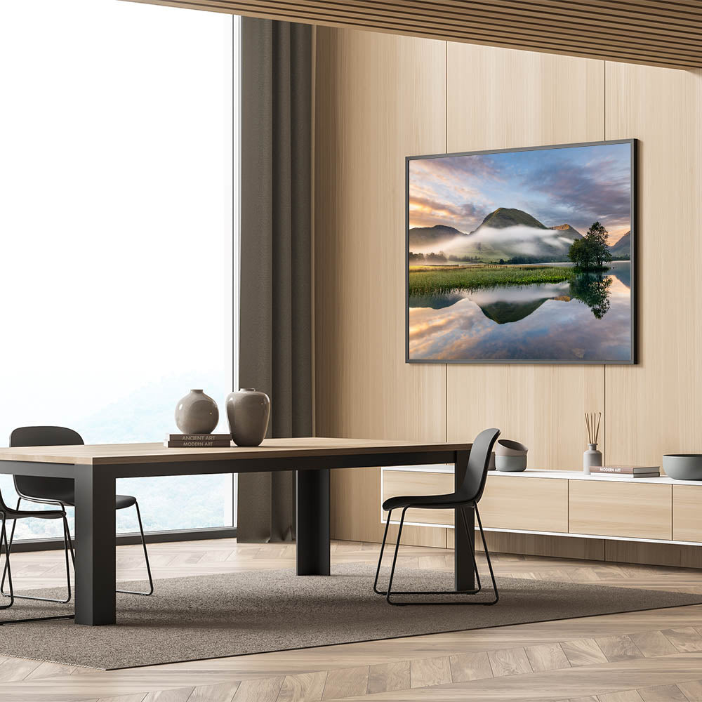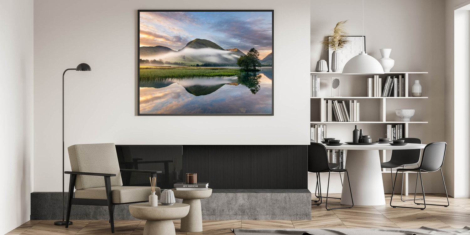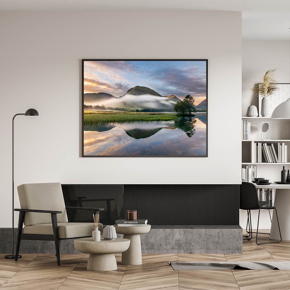 Bring the tranquility of the Lake District into your home with this breathtaking Cumbria wall art. Featuring a serene mountain reflected in still waters, enveloped in a gentle morning mist, this stunning scene captures the peaceful beauty of nature at its finest. Perfect for creating a calming atmosphere, this piece is available in canvas, framed prints, and acrylic glass options, making it an ideal addition to any home decor.