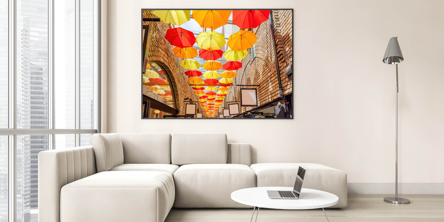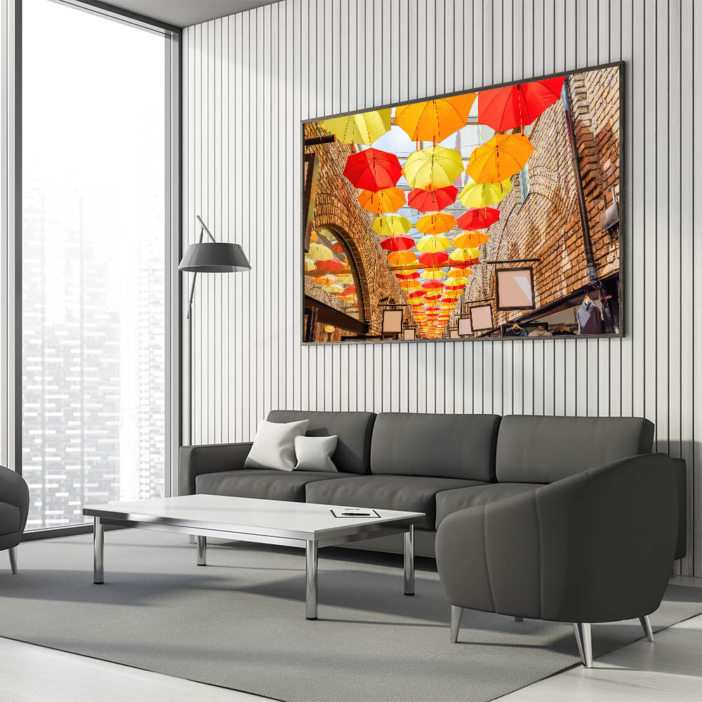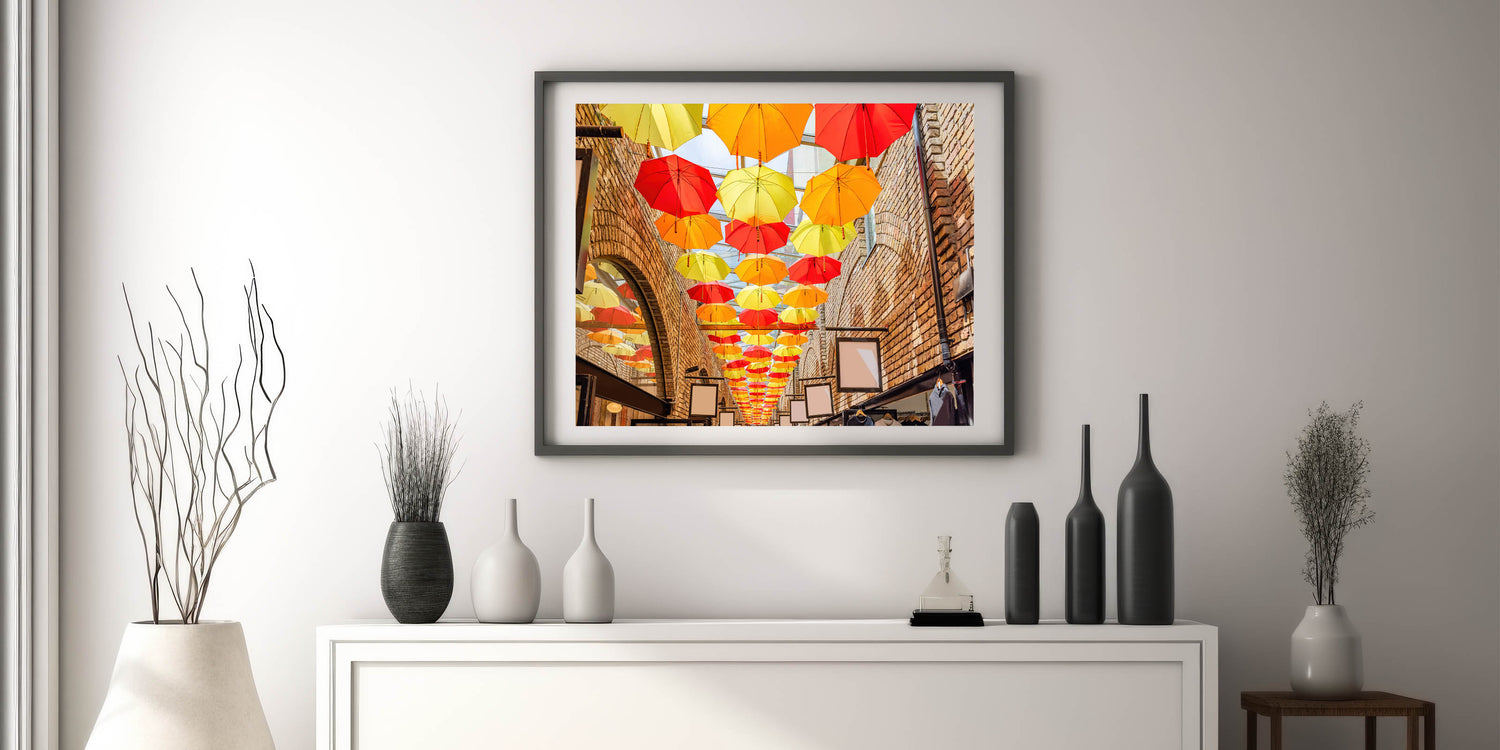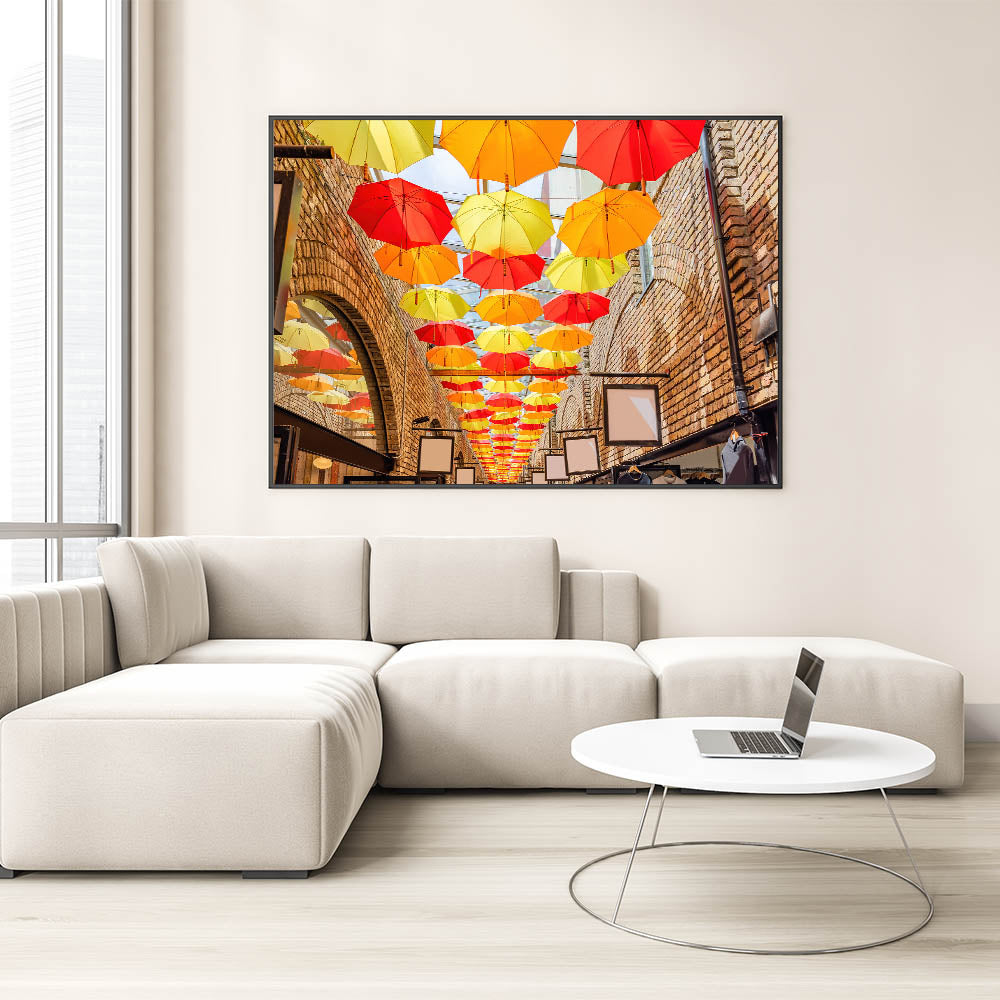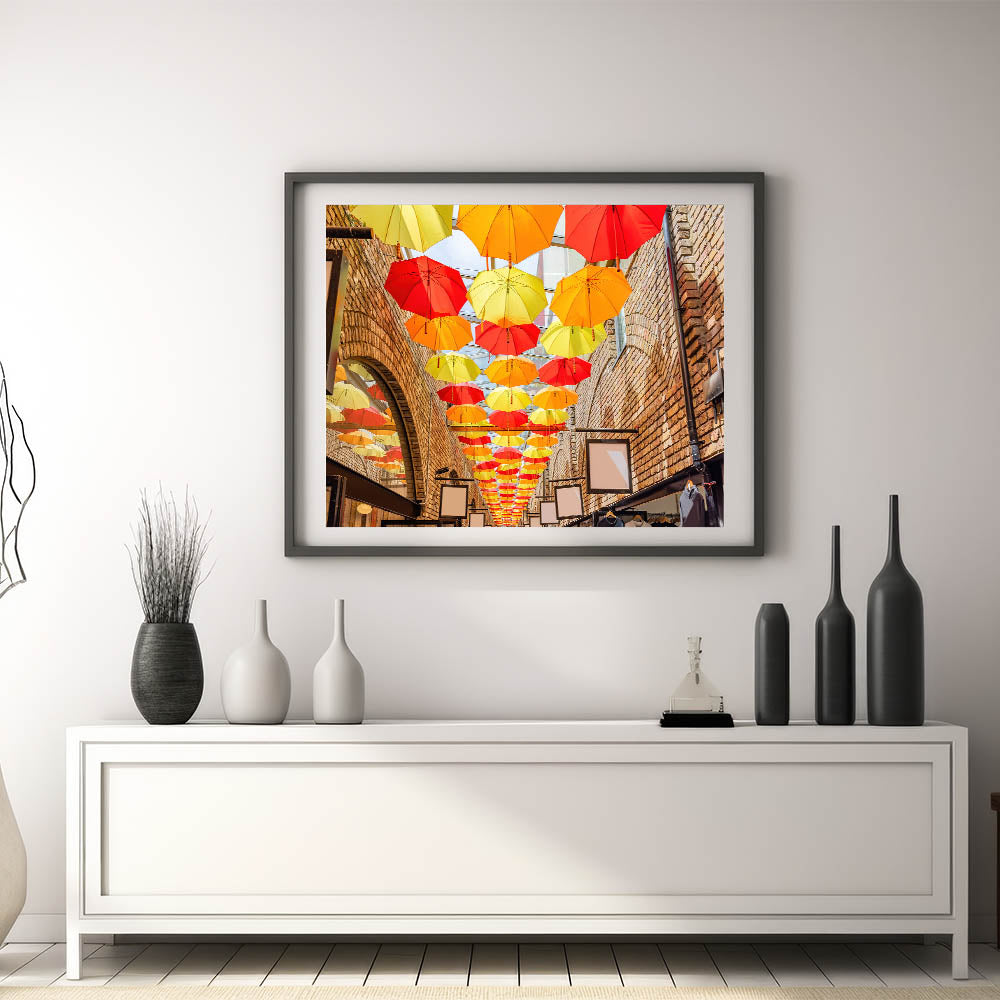 Brighten your decor with this unique London Piccadilly print, featuring vibrant yellow, red, and orange umbrellas suspended above a charming alley. The lively color palette and whimsical design make this artwork a perfect way to add a playful touch to any space. The rich contrast between the colorful umbrellas and the rustic brickwork creates a dynamic composition, making this piece stand out in any room.