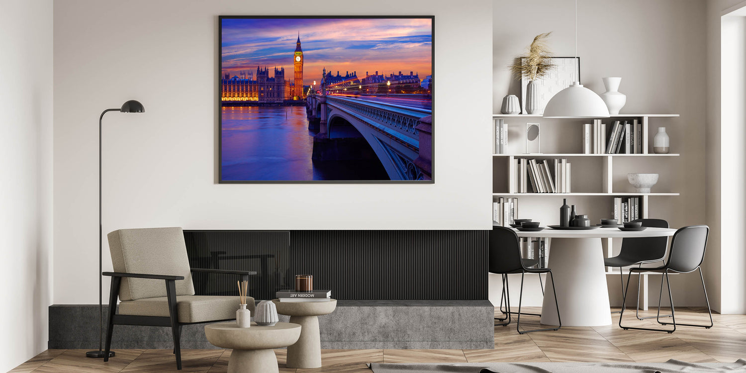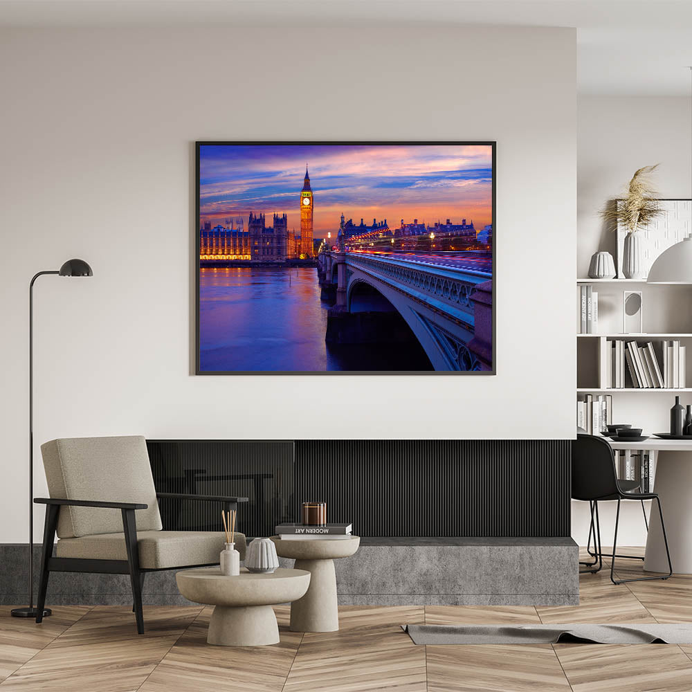 Immerse yourself in the beauty of London’s skyline with this captivating London Skyline Art featuring Big Ben and Westminster Bridge at twilight. The vivid colors of the sunset, combined with the motion of the traffic lights, create a stunning contrast that highlights the grandeur of this iconic cityscape. This piece from the River Thames Prints collection is perfect for those who appreciate the blend of historic architecture and modern urban life.
