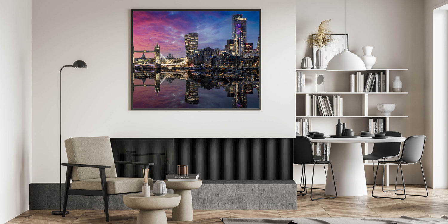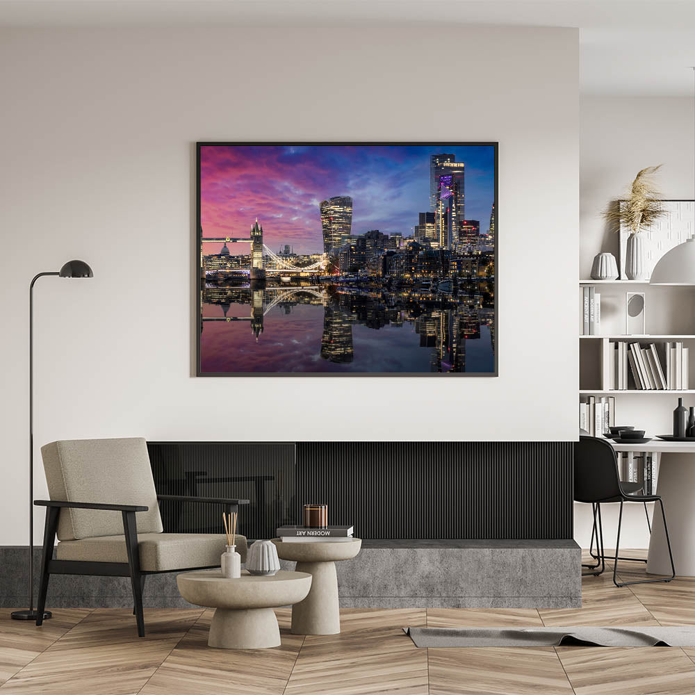 Capture the essence of London with this breathtaking London Skyline Art showcasing Tower Bridge and the modern city skyline at dusk. The striking colors of the sunset blend beautifully with the reflections on the River Thames, creating a mesmerizing scene. This artwork is perfect for those who admire the blend of historic and contemporary architecture in London. Part of the Thames Canvas Prints collection, this piece is ideal for adding sophistication and elegance to any space.