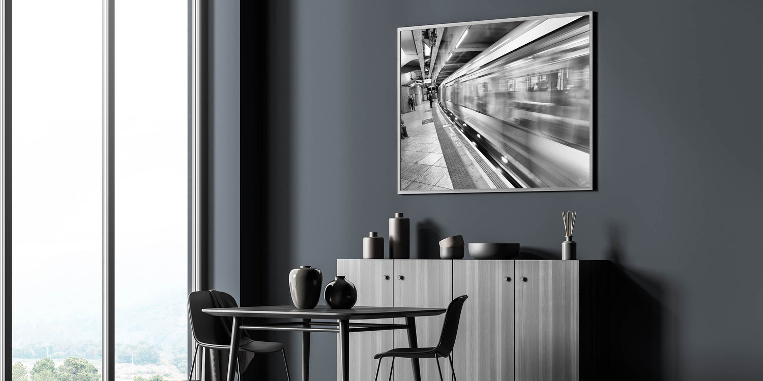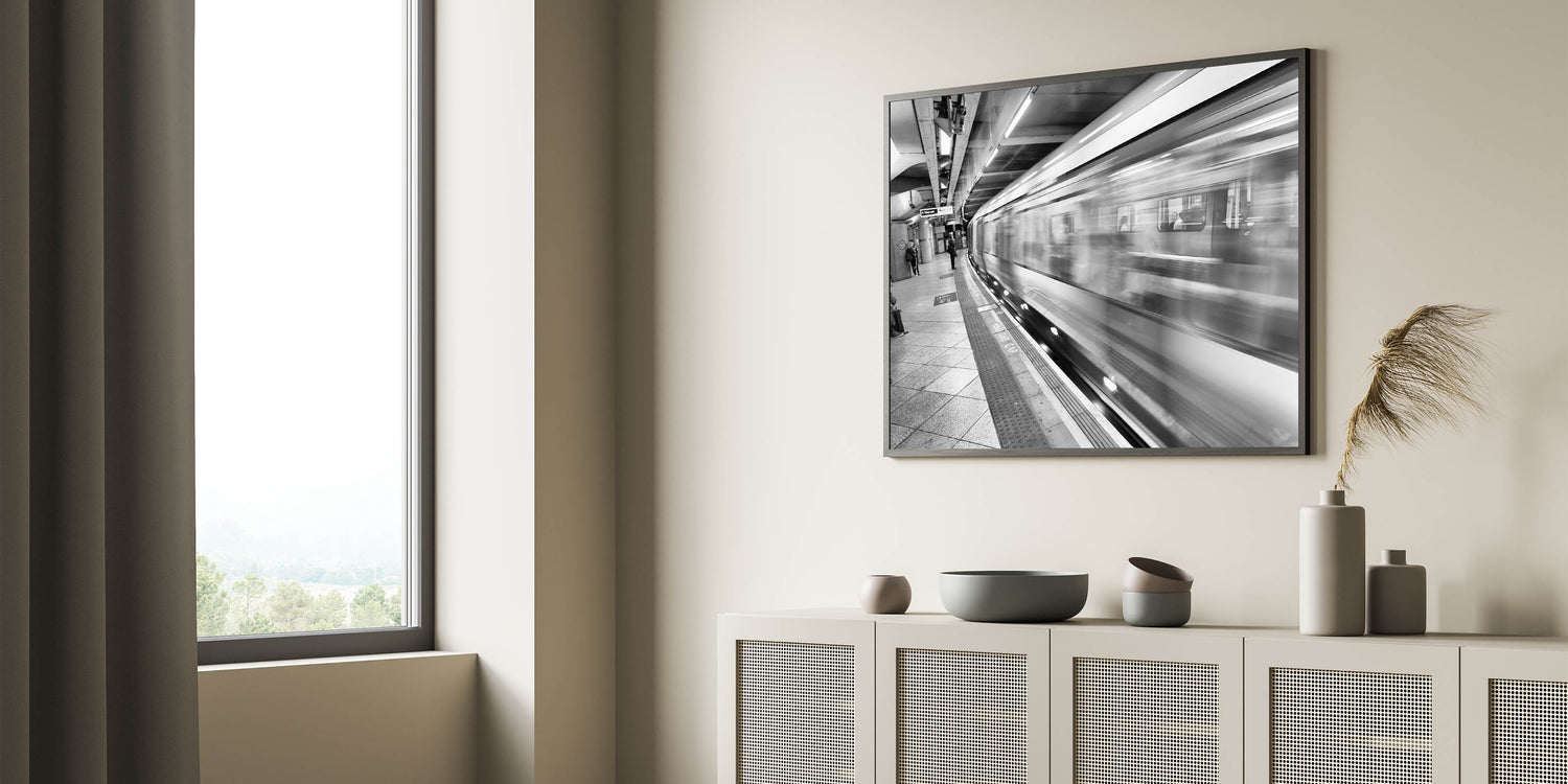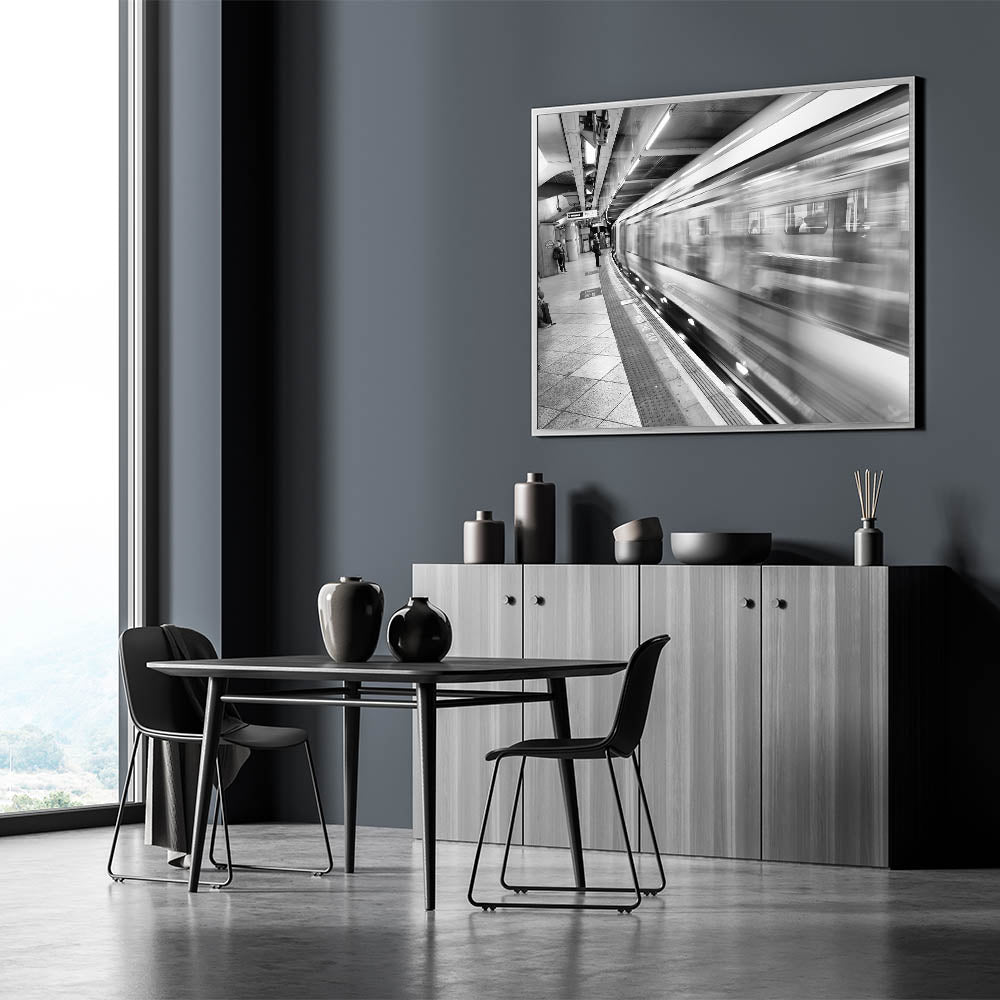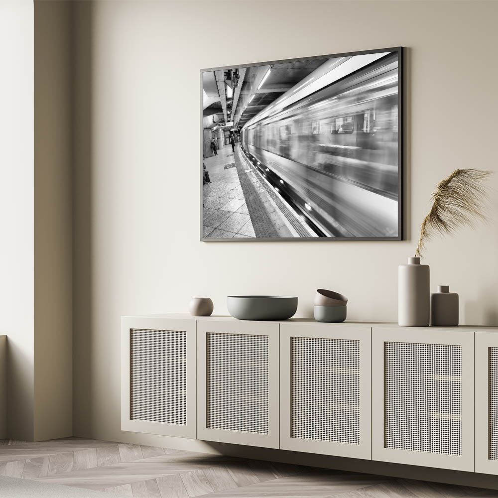 Capture the dynamic pace of London life with this black-and-white Piccadilly Circus canvas art. The motion of the subway train rushing through the underground station creates a sense of energy and movement, making it a stunning addition to any modern home or office. This image reflects the essence of London’s fast-paced urban environment, with subtle details that evoke the everyday rhythm of city life.