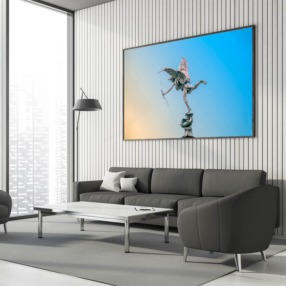Celebrate London’s timeless beauty with this stunning Piccadilly wall art featuring the famous Eros statue. Set against a serene blue and yellow gradient sky, the elegant silhouette of the winged archer is a striking centerpiece for any space. This piece captures the grace and detail of the iconic statue, making it perfect for lovers of London landmarks and classical art.
