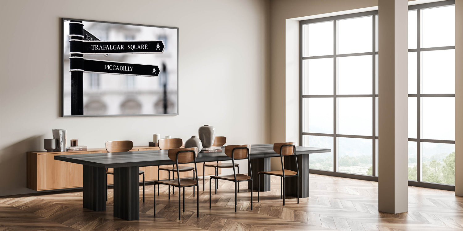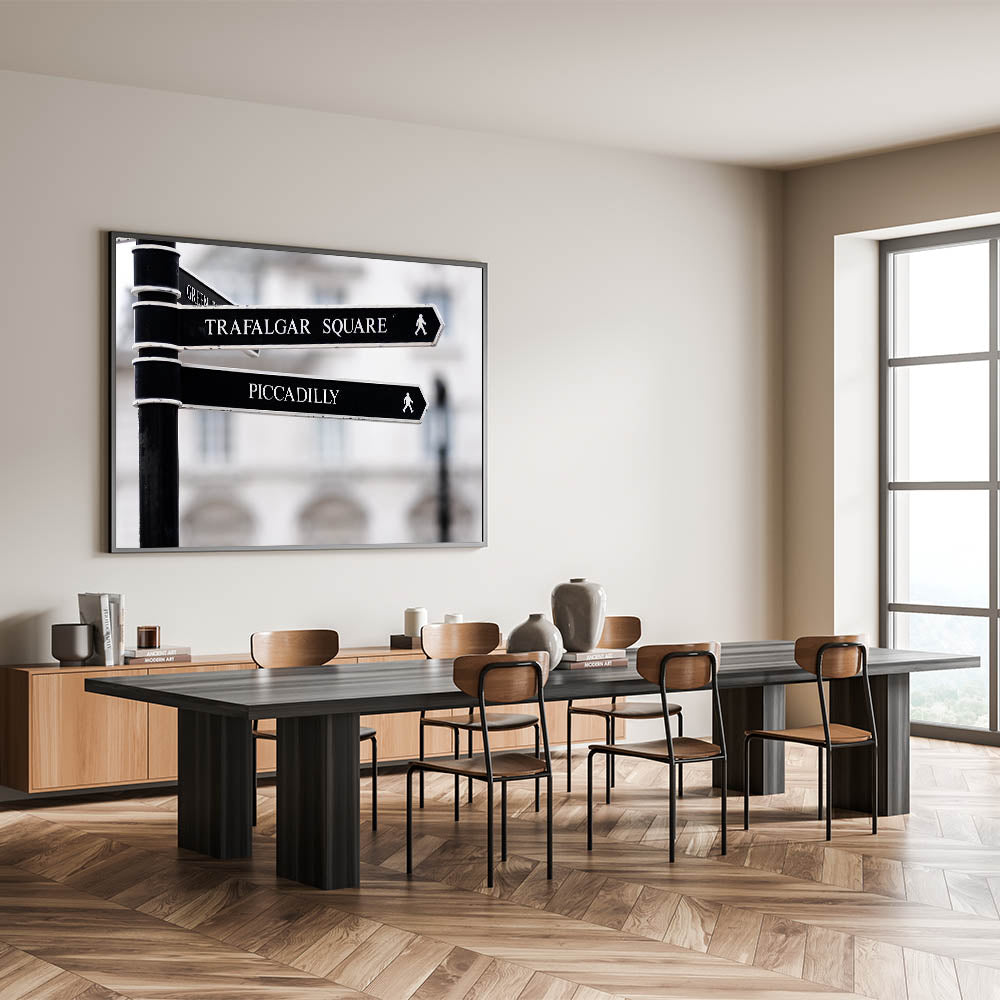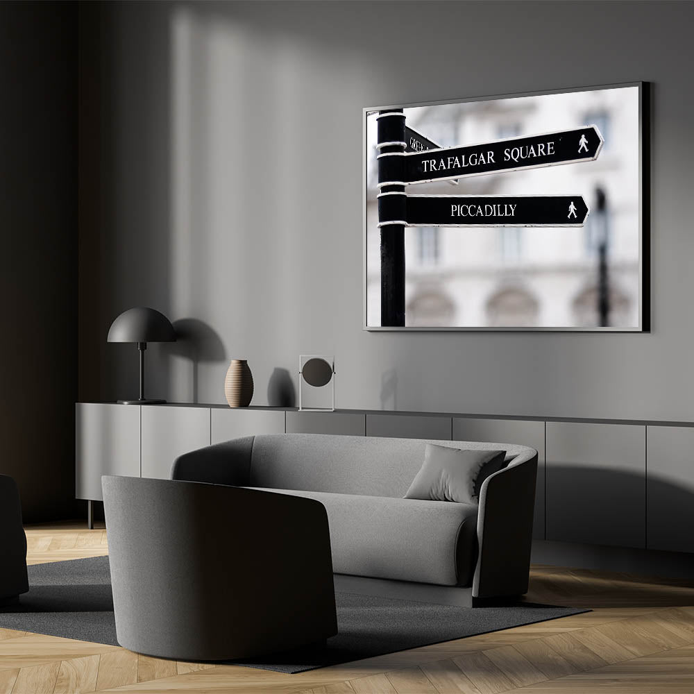 Bring the heart of London into your home with this stunning Piccadilly wall art, depicting iconic street signs leading to Piccadilly and Trafalgar Square. This unique piece captures the essence of London's vibrant energy, with classic black-and-white signage set against a subtle cityscape background. The perfect choice for lovers of London street scenes and UK cityscapes.