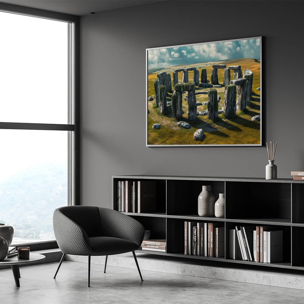 Transform your space with this stunning Scenic Stonehenge Artwork, featuring the iconic monument surrounded by a vivid and lush landscape. The sprawling fields and rich greenery add a fresh and natural twist to the ancient monument, creating a unique piece of Stonehenge Art Decor. Perfect for history lovers and those who appreciate the beauty of England Scenic Art, this artwork makes a perfect addition to any home or office.