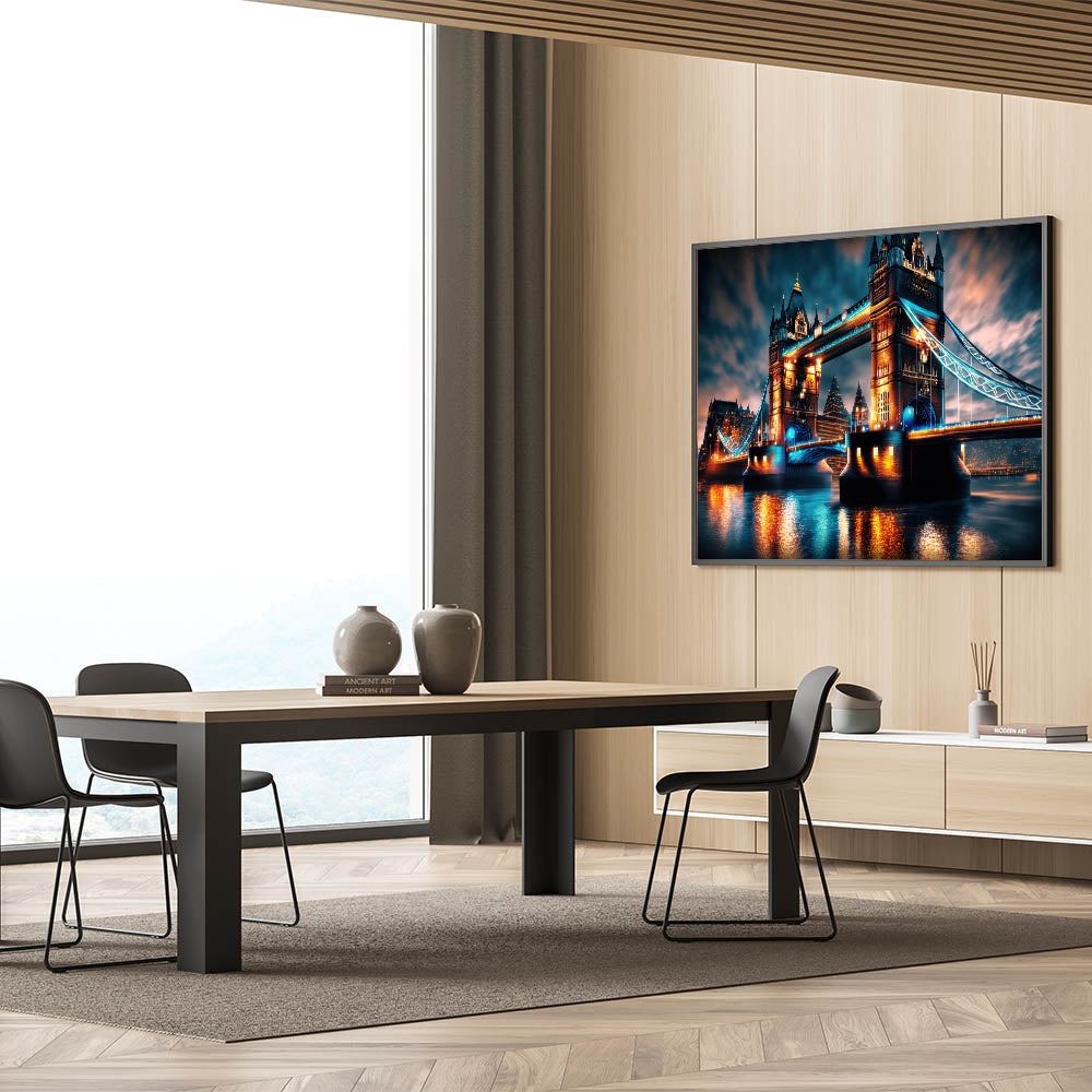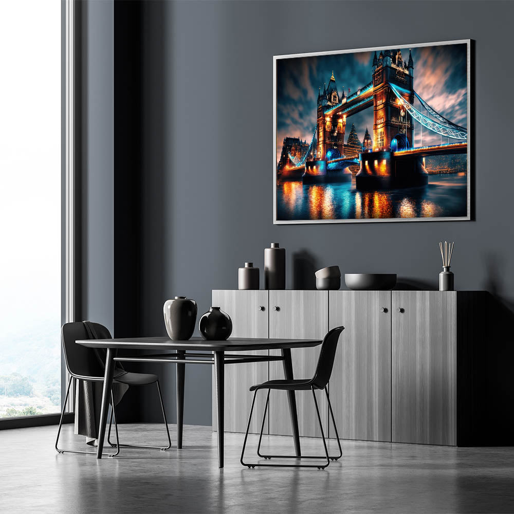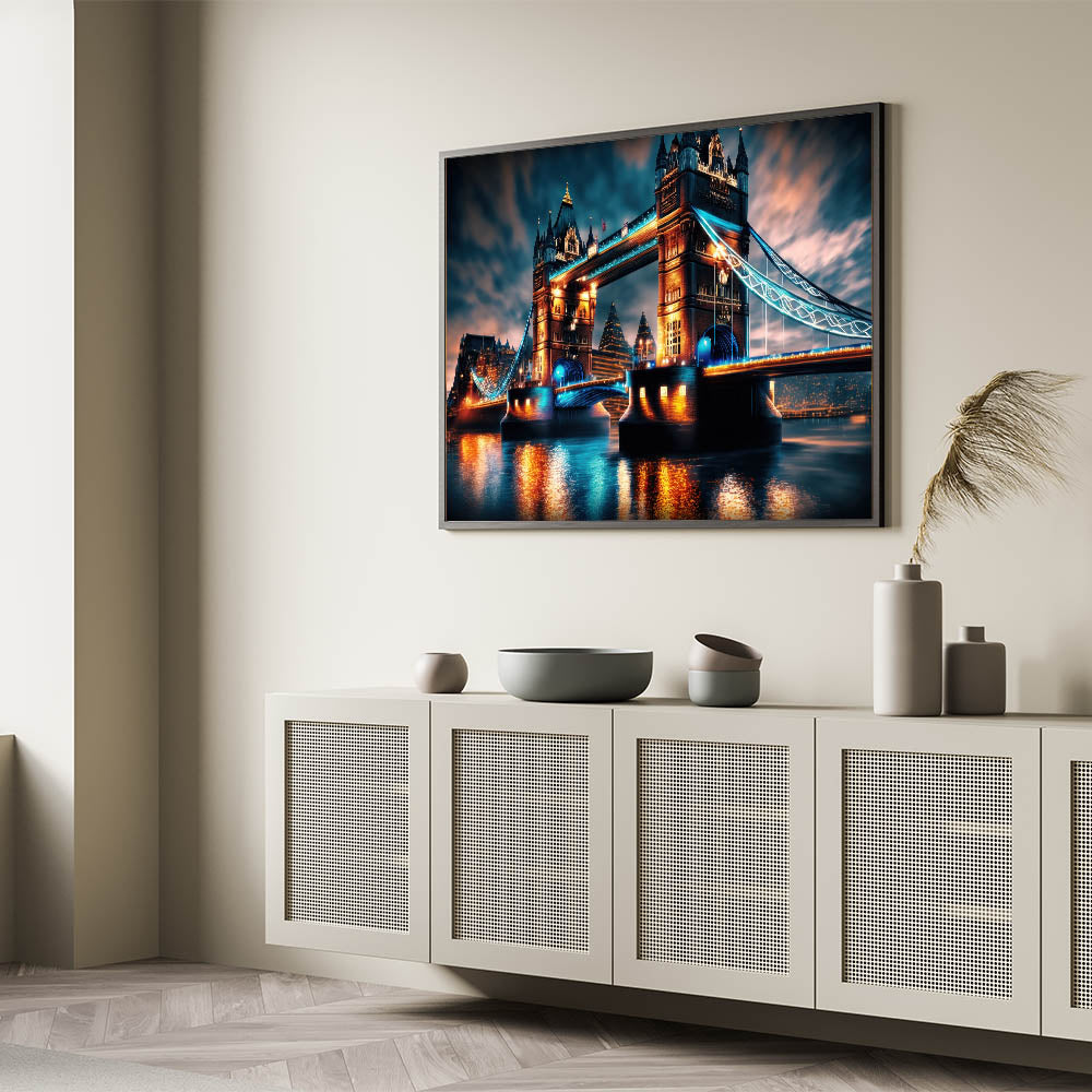 Illuminate your space with this striking Thames Canvas Print featuring Tower Bridge bathed in dynamic, electric night lights. The vivid, glowing colors and reflections over the River Thames create a surreal yet captivating scene, perfect for anyone who loves bold and modern London Skyline Art. This artwork blends the classic architecture of Tower Bridge with a futuristic aesthetic, making it an eye-catching addition to any room.