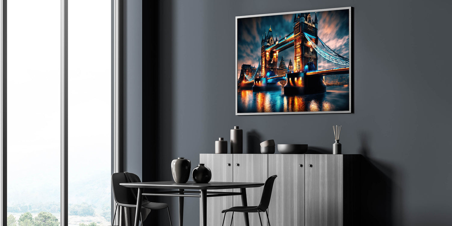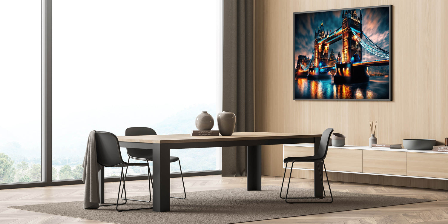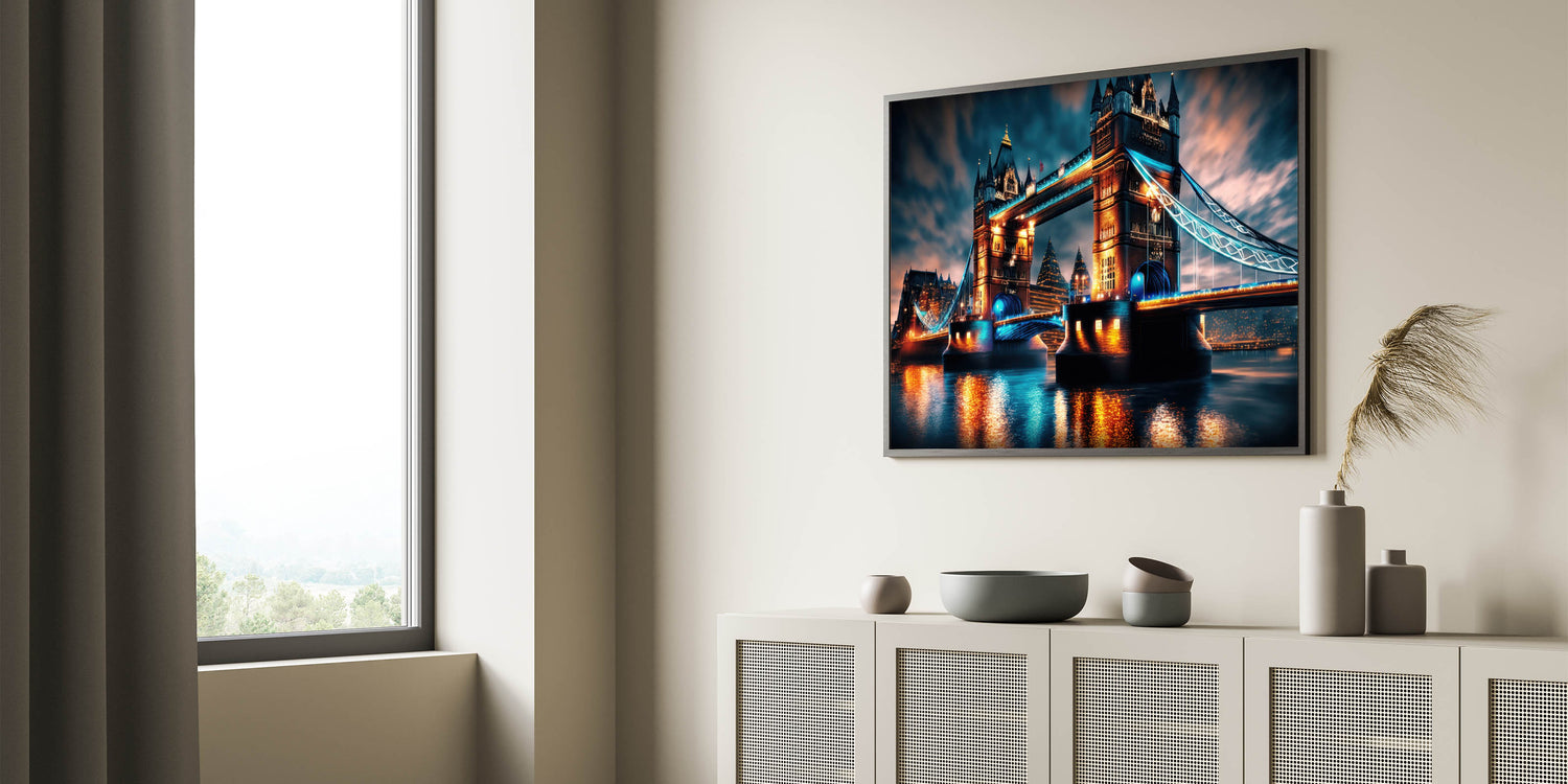 - Scenic River Thames artwork: Available in stretched canvas, framed canvas, and acrylic glass