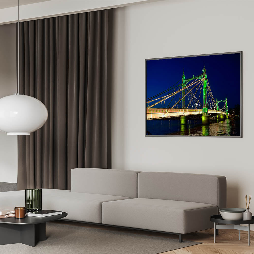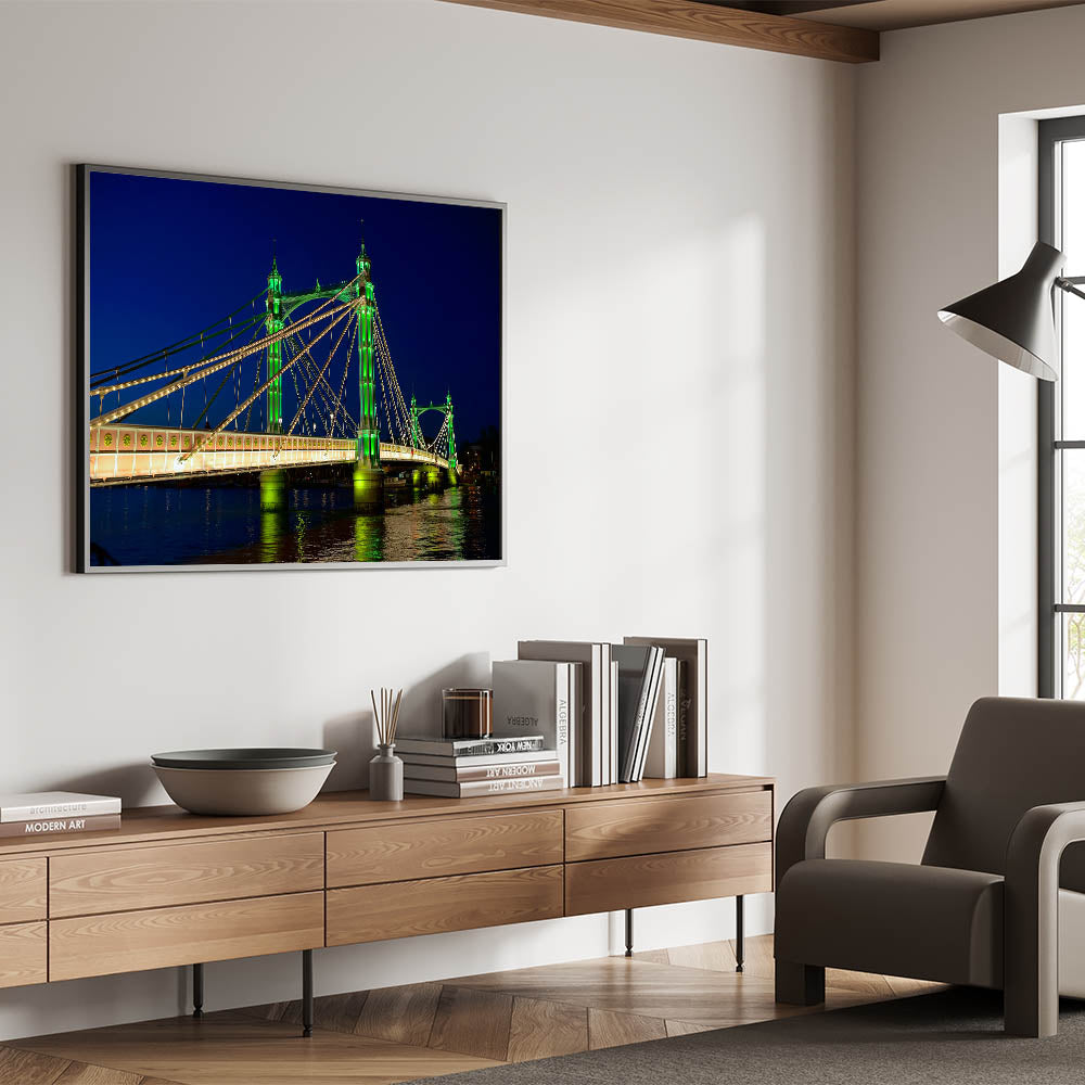 Transform your living space with our Thames River Wall Art, featuring a captivating view of a beautifully lit bridge crossing the iconic River Thames at night. This stunning piece of London Skyline Art captures the essence of the city's charm, showcasing its vibrant energy and architectural elegance. Perfect for anyone who appreciates British Landmark Art and the beauty of the River Thames Prints.