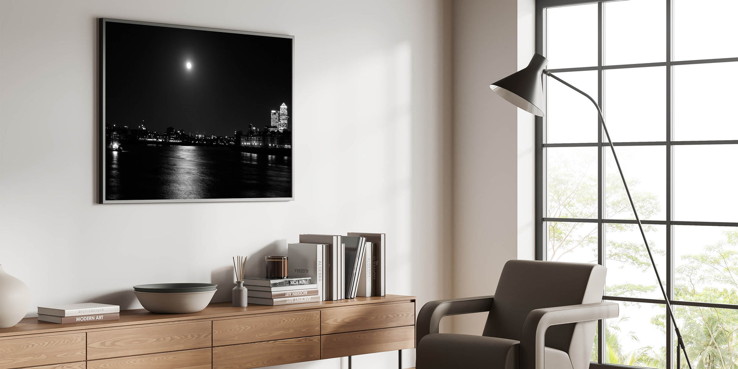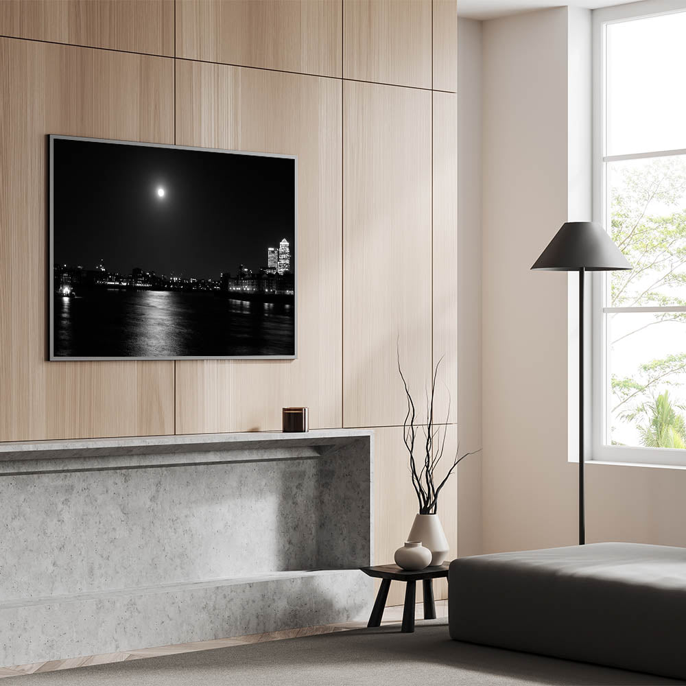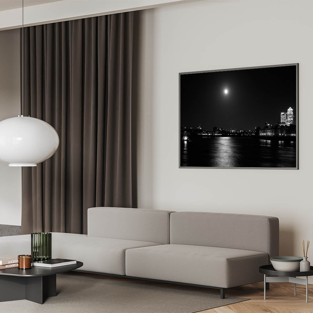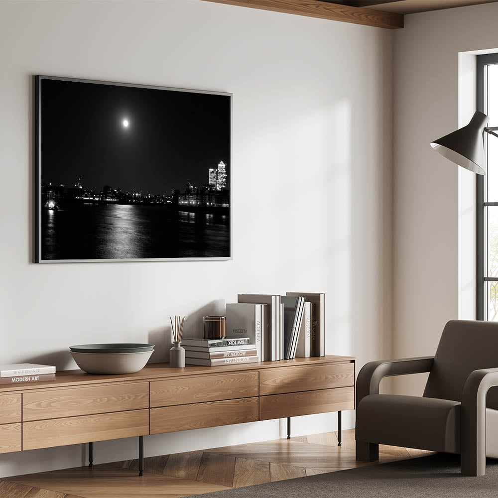 Elevate your space with this stunning Thames River Wall Art featuring a serene moonlit view of the London skyline. The reflection of the moonlight over the River Thames combined with the glowing cityscape creates a timeless and elegant atmosphere. This black-and-white piece from the River Thames Prints collection highlights the quiet beauty of London at night, making it a perfect choice for fans of British Landmark Art and sophisticated urban decor.