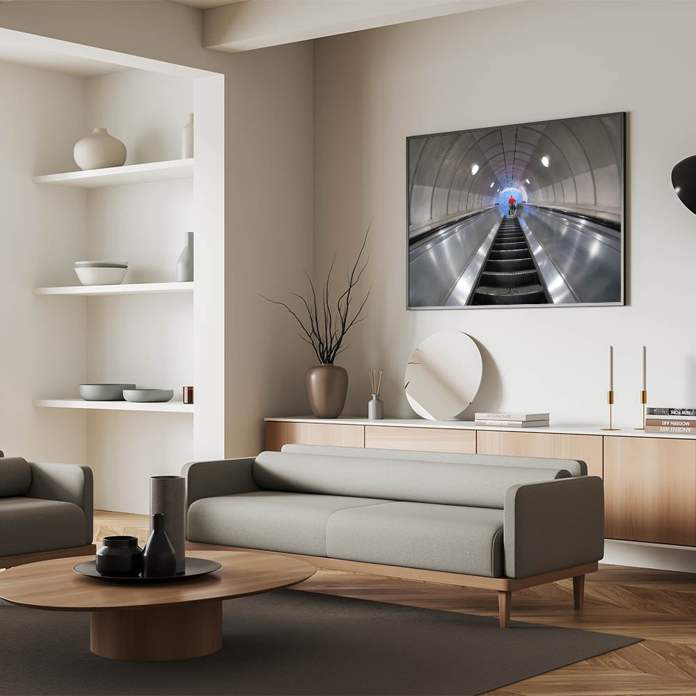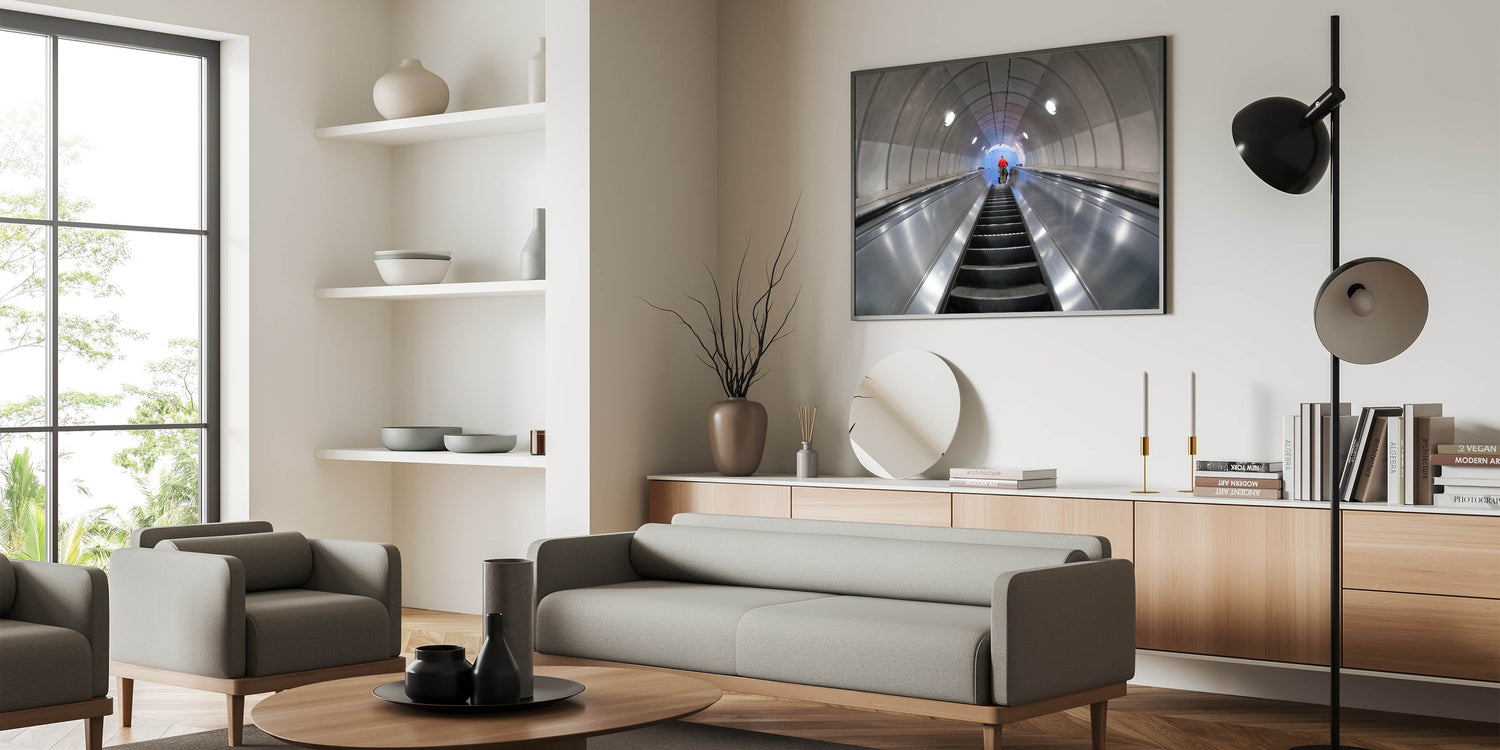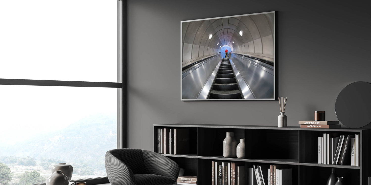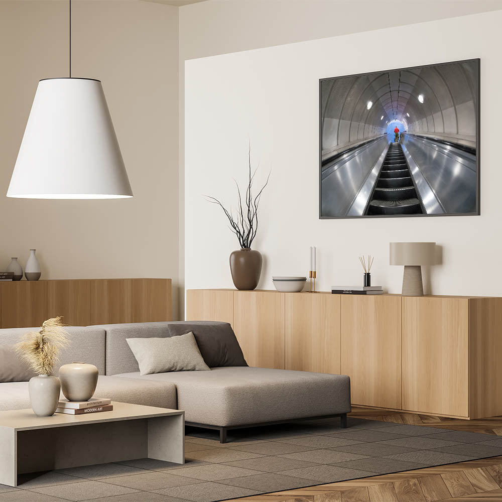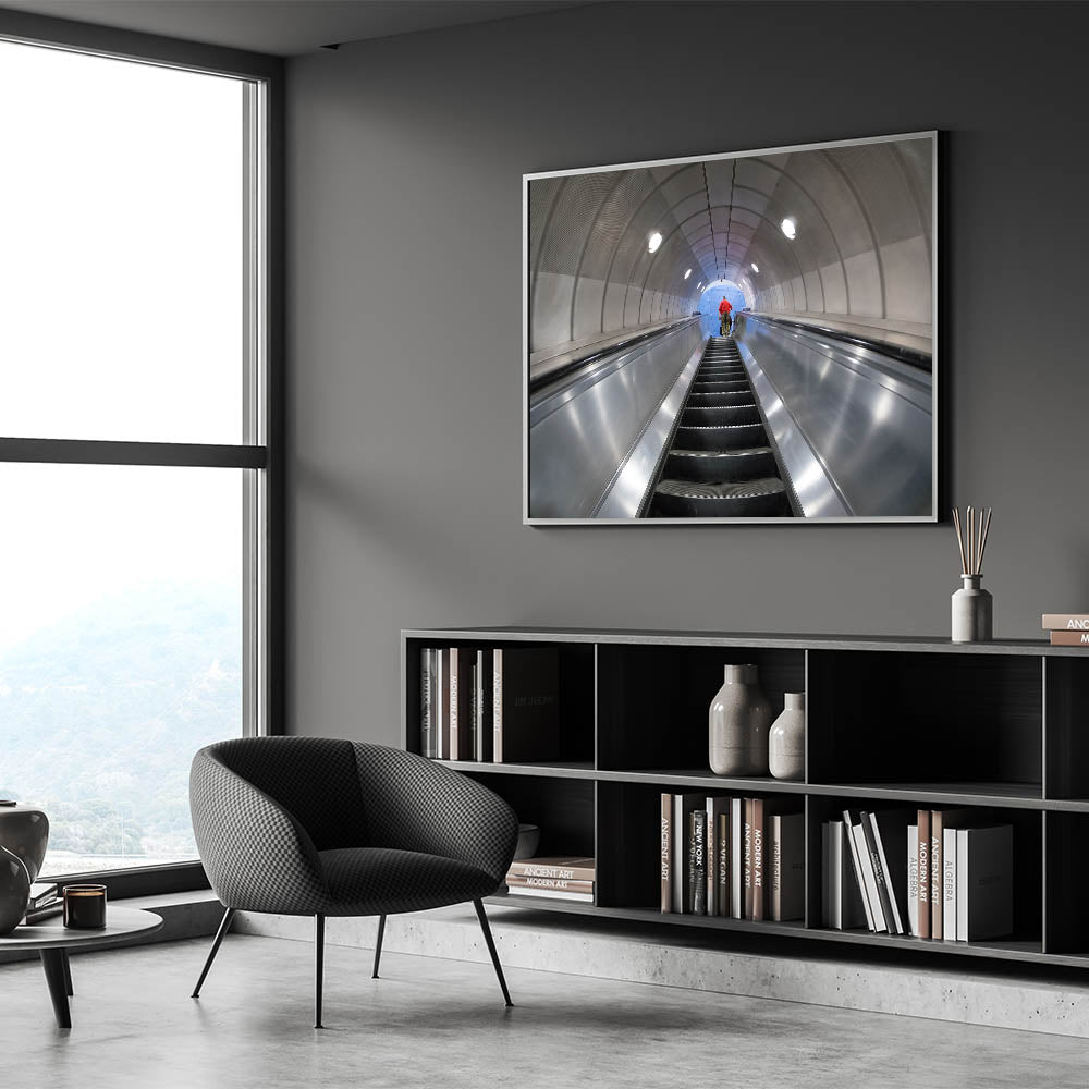 Step into the modern side of London with this captivating Piccadilly wall art. This unique image captures the interior of a sleek and futuristic tube station, with an escalator leading upwards into the light. The smooth, industrial design of the station combined with the bright pop of color from a lone figure adds an artistic, modern touch to any space. Ideal for those who appreciate contemporary UK cityscapes and the fast pace of London life.